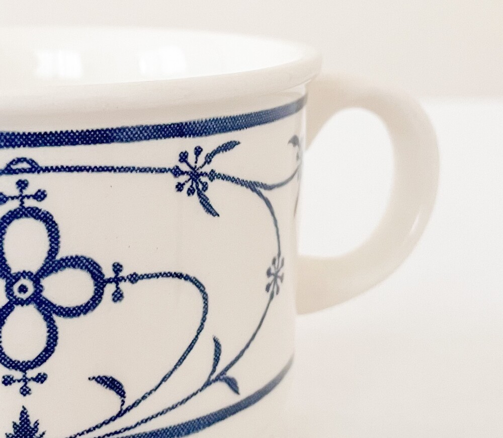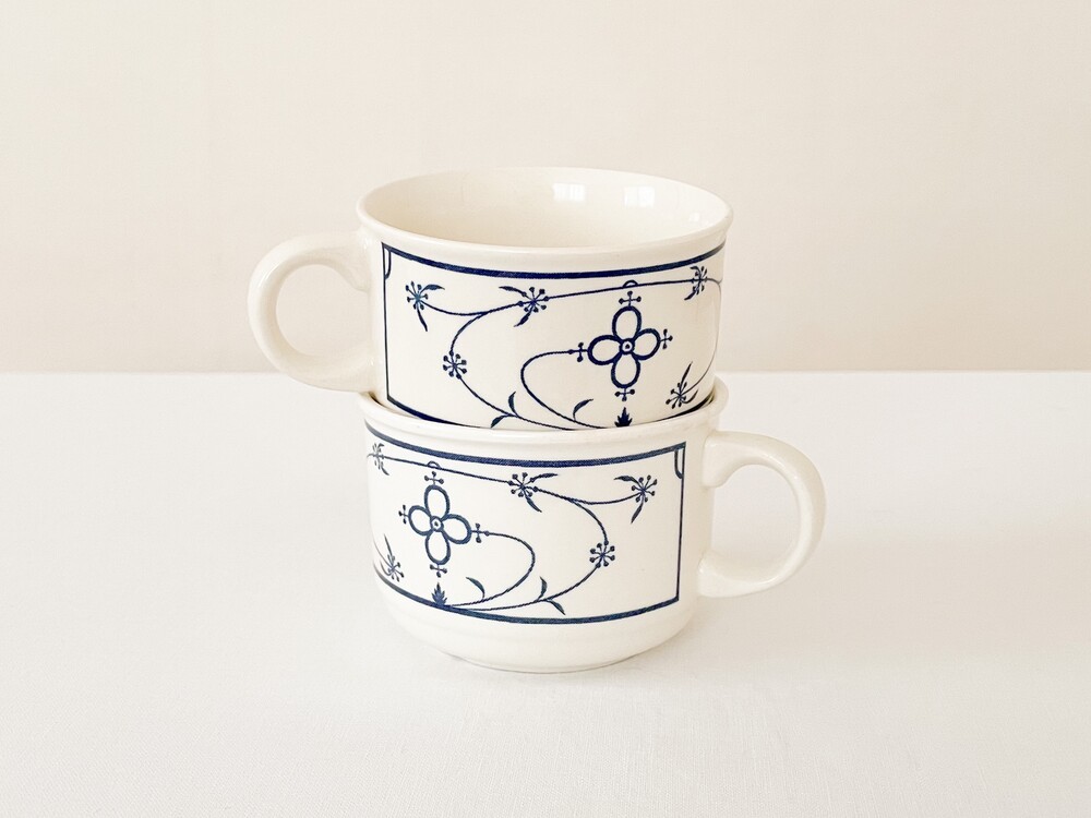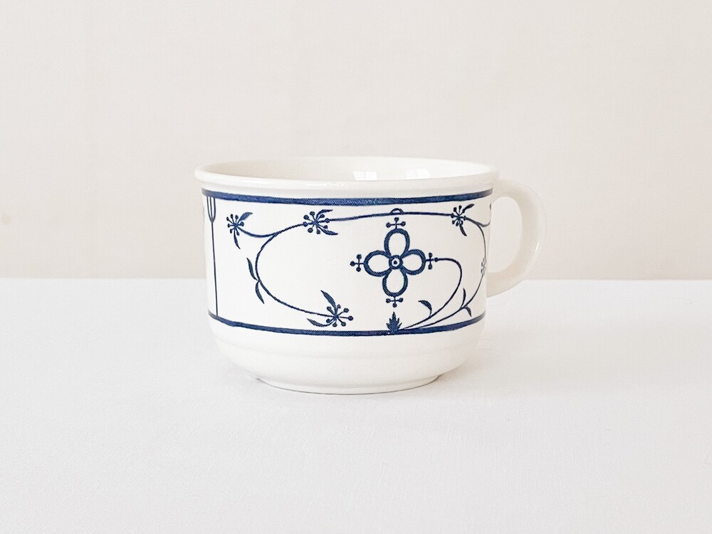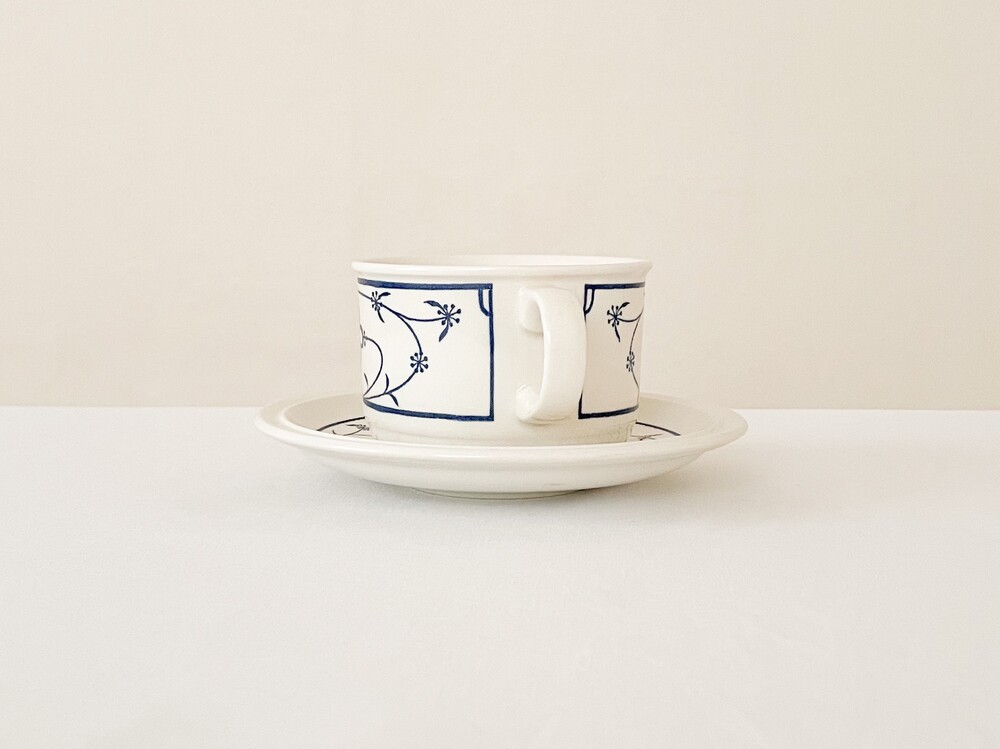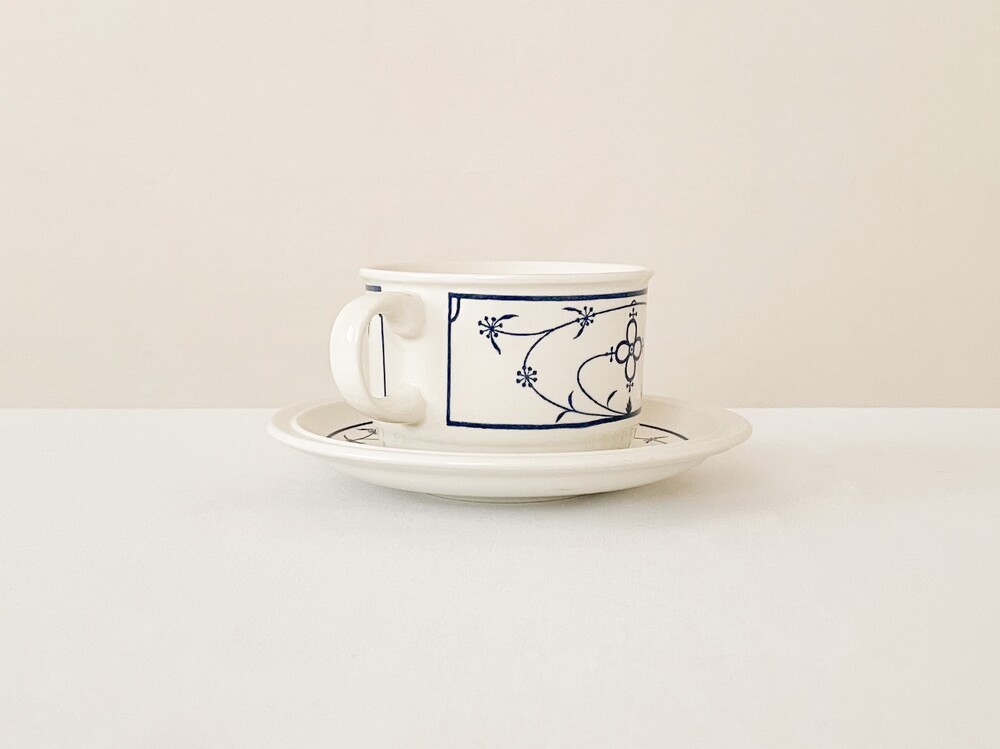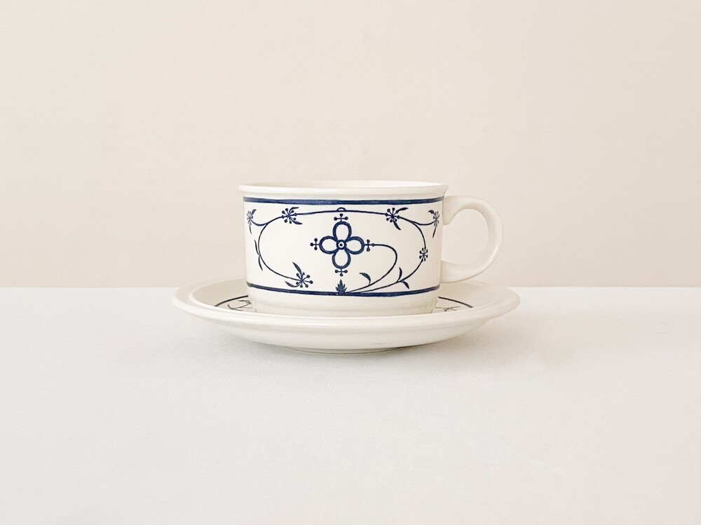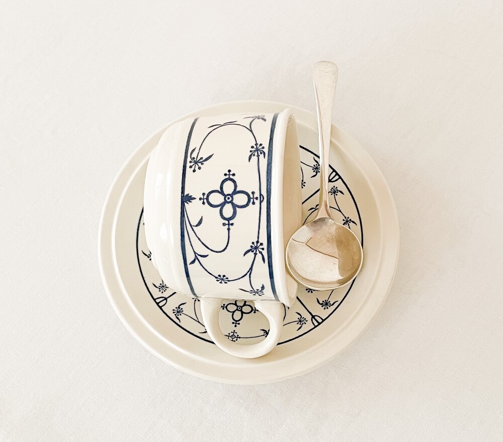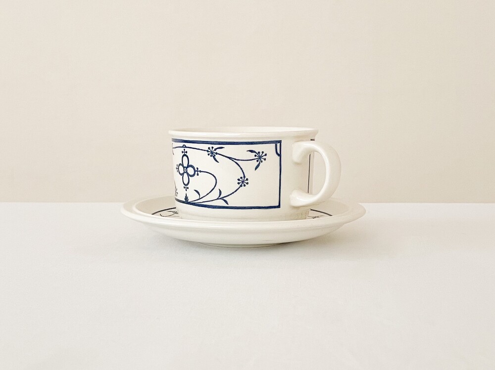 로얄튜더는 1876년 영국도자기의 주요 산지인 스토크온트렌드 롱톤지역에서 윌리엄과 조셉 형제에 의해 시작된 테이블웨어 브랜드입니다. 예술에 대한 큰 애정을 가지고 있었던 윌리엄과 조셉은 뚜렷한 정체성을 가진- 로얄튜더만의 아름다움이 담긴 테이블웨어를 만들어내고자하는 마음으로 로얄튜더를 운영했습니다. 이러한 로얄튜더는 그린들리와 콜클로우 등 아트피스와 매뉴팩트의 성격을 동시에 가지고 있는 다수의 브랜드에게도 큰 영향을 주었고, 선명한색감과 패턴들이 어우러진 세련된 화려함의 도자기들은 당시부터 지금까지도 수집품으로서의 높은 가치도 인정받고 있습니다. 소개해드리는 제품은 1950년대 후반에 만들어진 것으로, 크림색의 아이언웨어를 소재로 합니다. 넓고 여유로운 곡선의 찻잔과 접시로 사용하기에도 손색이 없는 둥근 잔받침으로 구성 되어있으며, 가각의 겉면에는- 전통적인 덴마크패턴을 오마주한 풀꽃의 무늬가 입혀져 있습니다. 우유를 듬뿍 넣은 커피나 차를 마시거나, 수프를 담아내는 컵으로 - 잼과 버터를 곁들인 윤기나는 스콘을 담아내는 그릇으로 사용하기에 잘어울립니다.