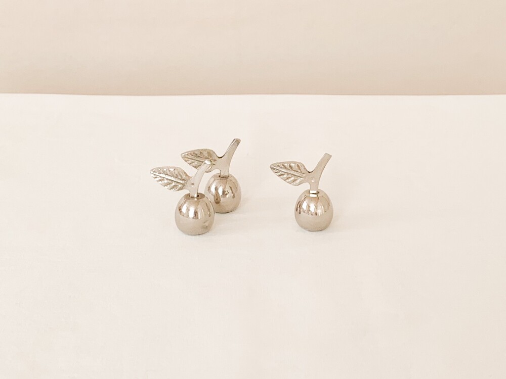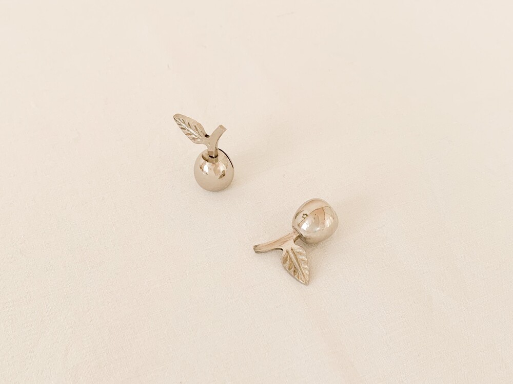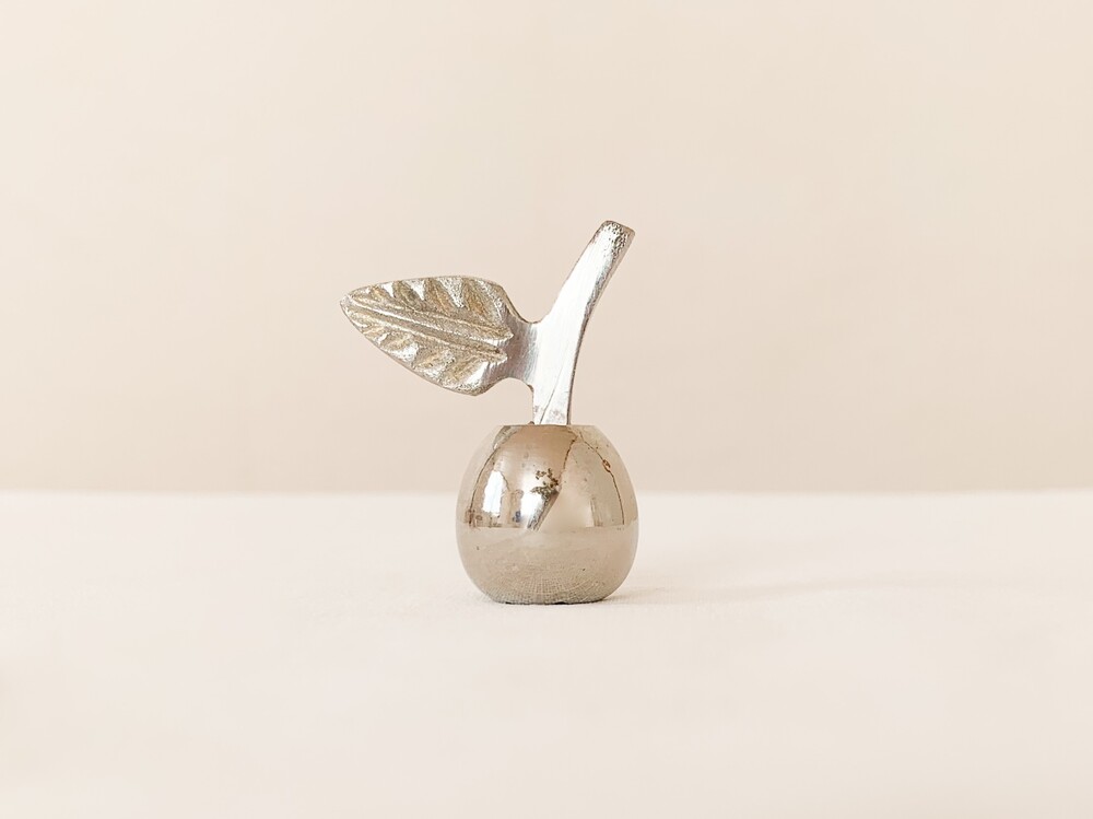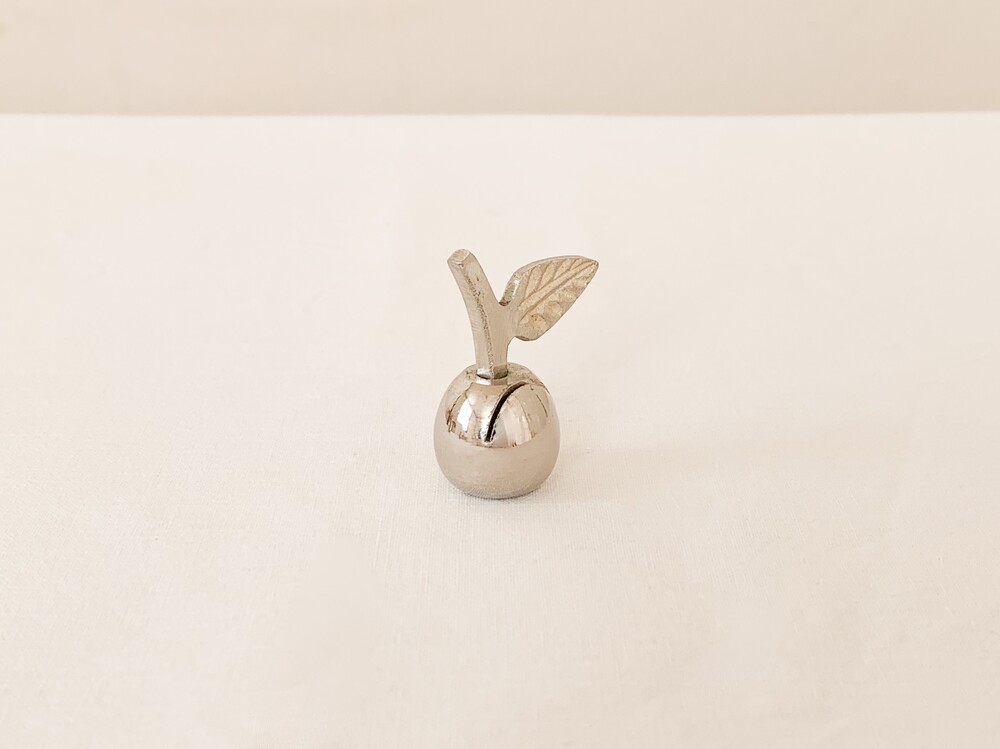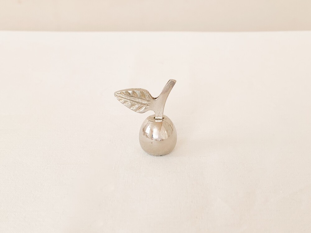 1950년대에 제작된 것으로 전해지는 빈티지 테이블네임홀더입니다. 작은 사과모양으로 만들어진 네임홀더는, 금관악기를 만드는데 사용되는 니켈실버에 순은을 입혀낸 소재가 사용되었습니다. 동그란 열매, 납작하고 단순한 선으로 묘사 된 가지와 잎사귀의 모습에서 밝은 위트가 전해지며, 소재고유의 무게감과 오랜시간이 담긴 우아함이 보여집니다. 정성을 들여 준비한 테이블위의 네임홀더로, 좋아하는 엽서나 사진을 놓아두는 오브제로 사용하기에 잘 어울립니다.