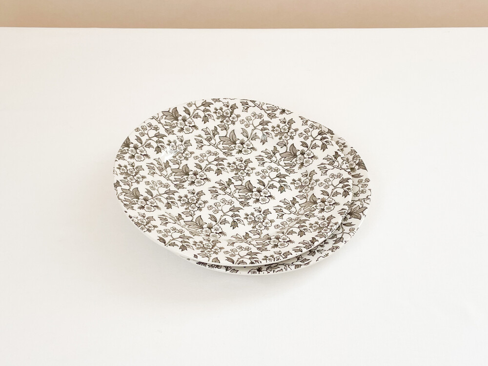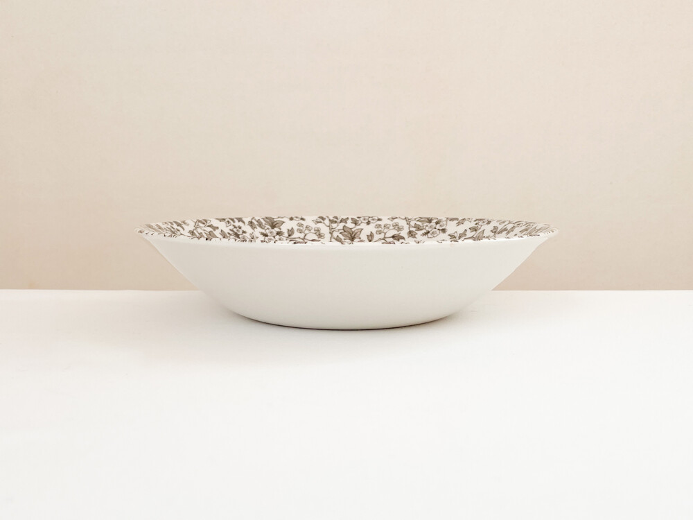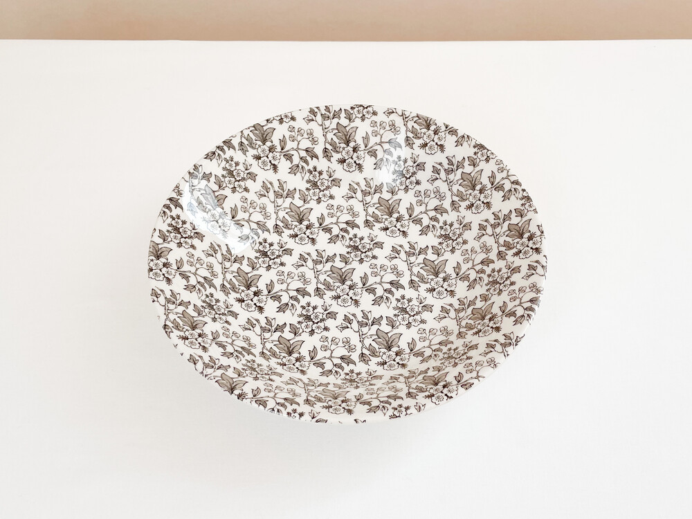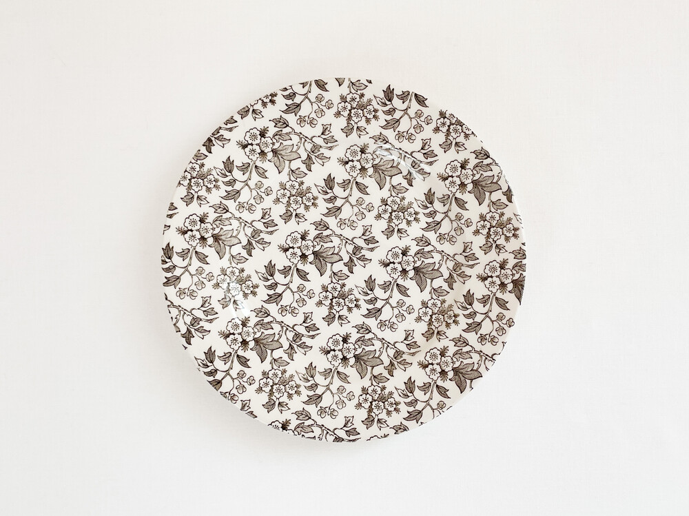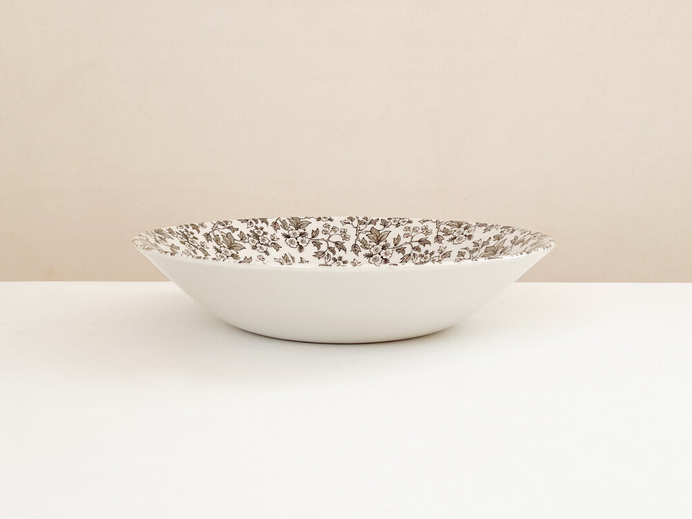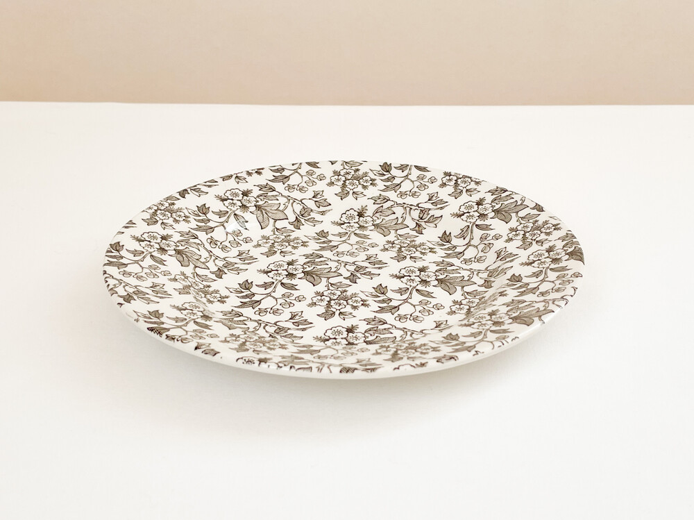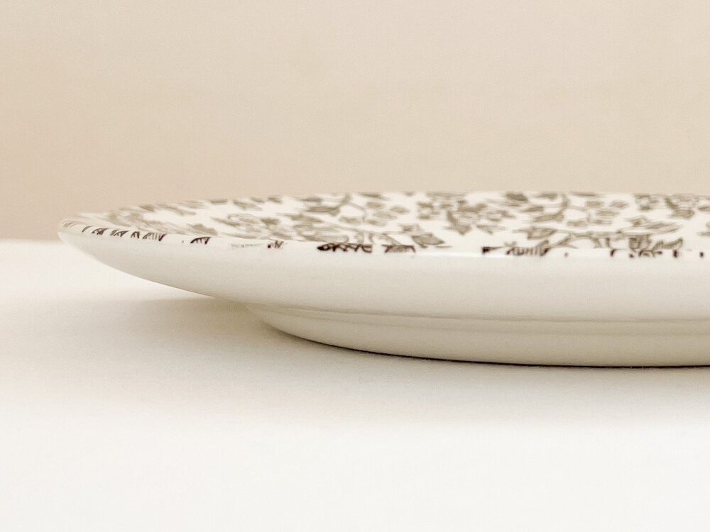 소개해드리는 제품은 1950년대 중반즈음의 것으로 전해지는 티플레이트와 보울입니다. 아이언웨어를 소재로 만들어진 그릇들은 도톰하고 단정한 선을 가지고 있으며, 섬세한 무늬를 표현 할 수 있는 트랜스퍼프린트를 사용하여 겉면에 잔잔한 꽃무늬를 입혀냈습니다. 차분하고 고운 결이 담겨있는 낮은 채도의 갈색으로 표현 된 잔잔한 꽃무늬는, 바탕이 되는 밝은 크림색의 아이언웨어와 함께 자연스런 어울림을 보여줍니다. 꾸밈에서 전해지는 밝고 보드라운 정서, 색감과 소재 그리고 단정한 실루엣으로부터 전해지는- 치우침없는 아름다운 균형을 가지고 있는 제품입니다. 한가로운 오후의 차마시는 시간을 위한 그릇으로, 매일 마주하는 식탁을 조금 더 특별한 모습으로 완성해 줄 그릇들로 사용하기에 잘 어울립니다.