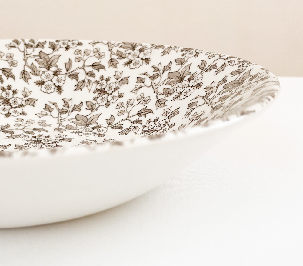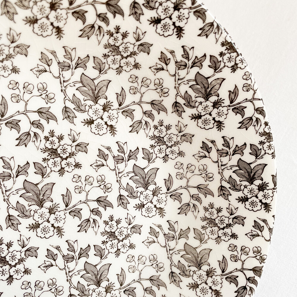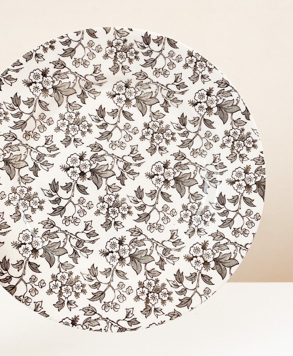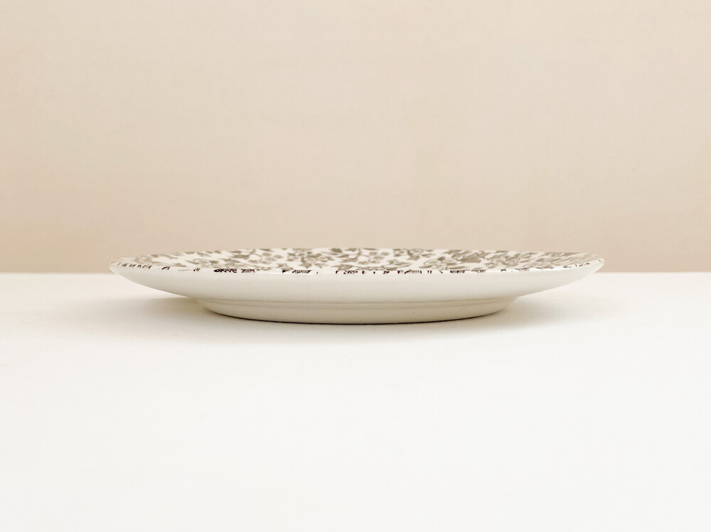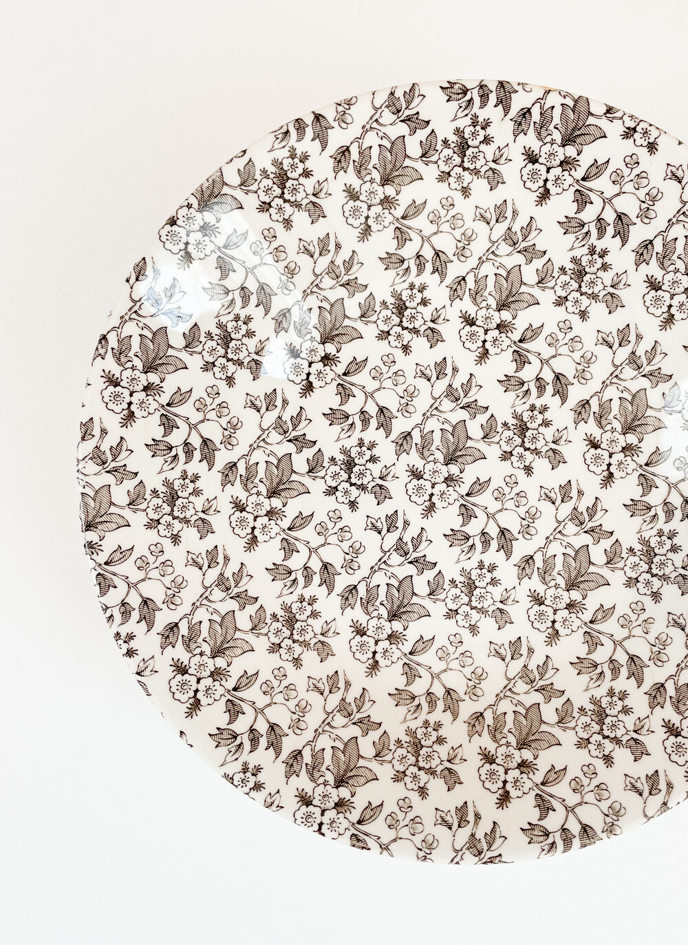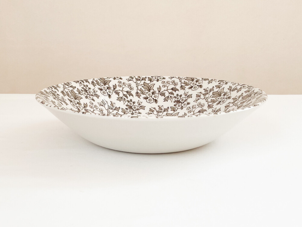 소개해드리는 제품은 1950년대 중반즈음의 것으로 전해지는 티플레이트와 보울입니다. 아이언웨어를 소재로 만들어진 그릇들은 도톰하고 단정한 선을 가지고 있으며, 섬세한 무늬를 표현 할 수 있는 트랜스퍼프린트를 사용하여 겉면에 잔잔한 꽃무늬를 입혀냈습니다. 차분하고 고운 결이 담겨있는 낮은 채도의 갈색으로 표현 된 잔잔한 꽃무늬는, 바탕이 되는 밝은 크림색의 아이언웨어와 함께 자연스런 어울림을 보여줍니다. 꾸밈에서 전해지는 밝고 보드라운 정서, 색감과 소재 그리고 단정한 실루엣으로부터 전해지는- 치우침없는 아름다운 균형을 가지고 있는 제품입니다. 한가로운 오후의 차마시는 시간을 위한 그릇으로, 매일 마주하는 식탁을 조금 더 특별한 모습으로 완성해 줄 그릇들로 사용하기에 잘 어울립니다.