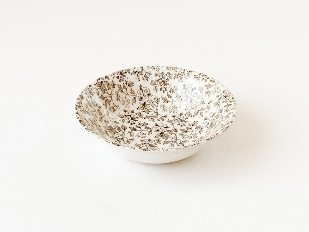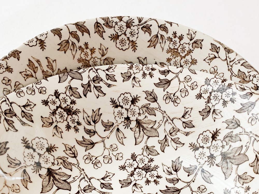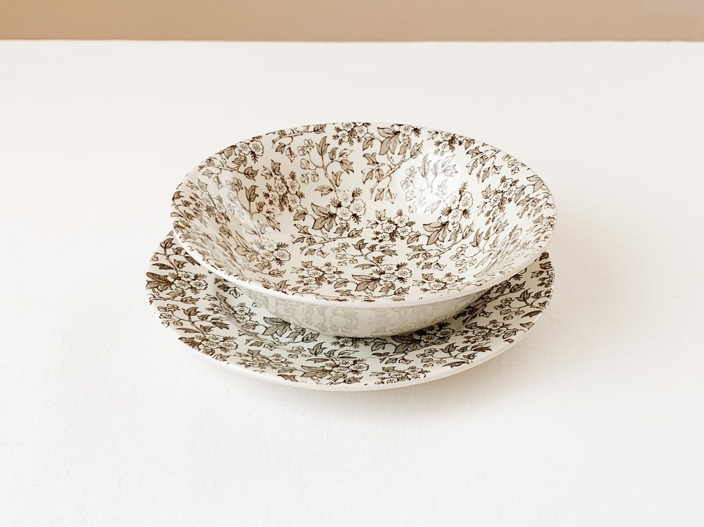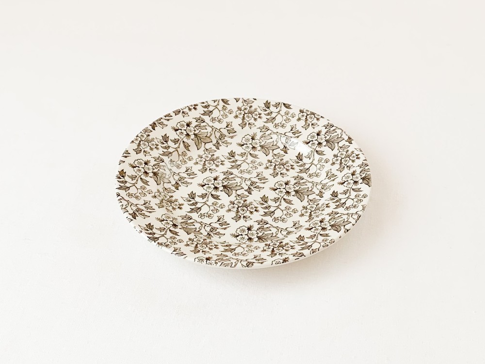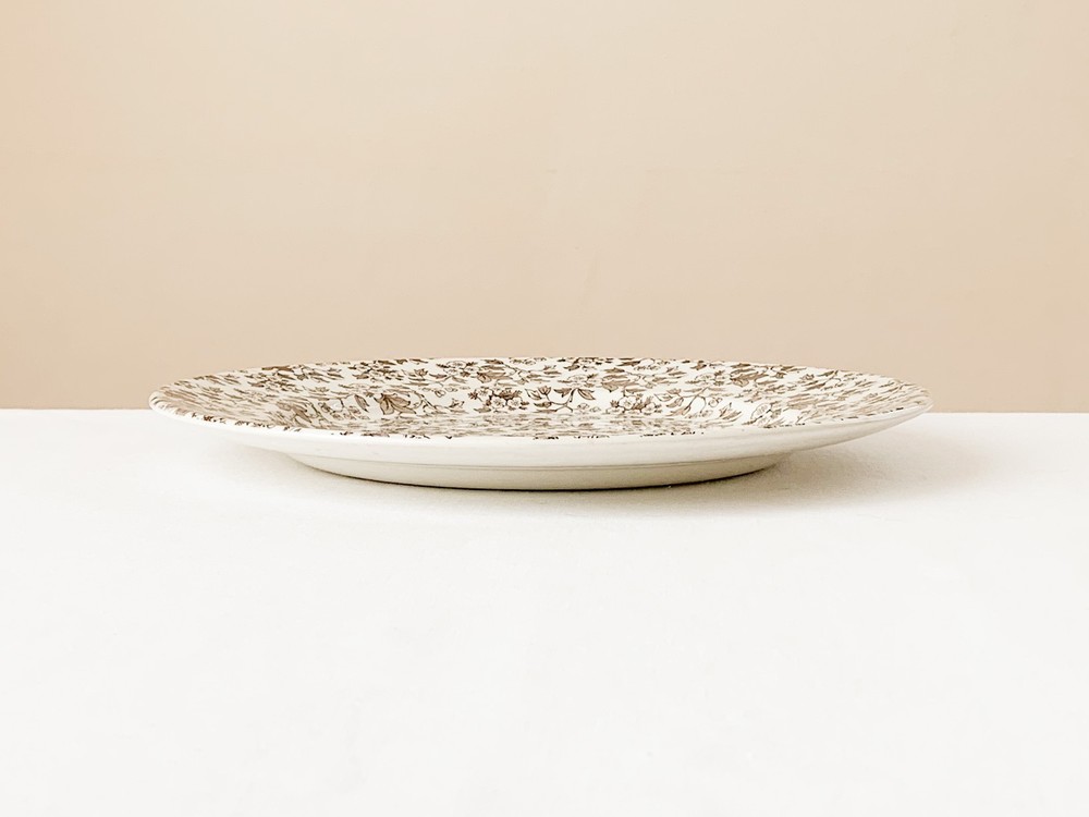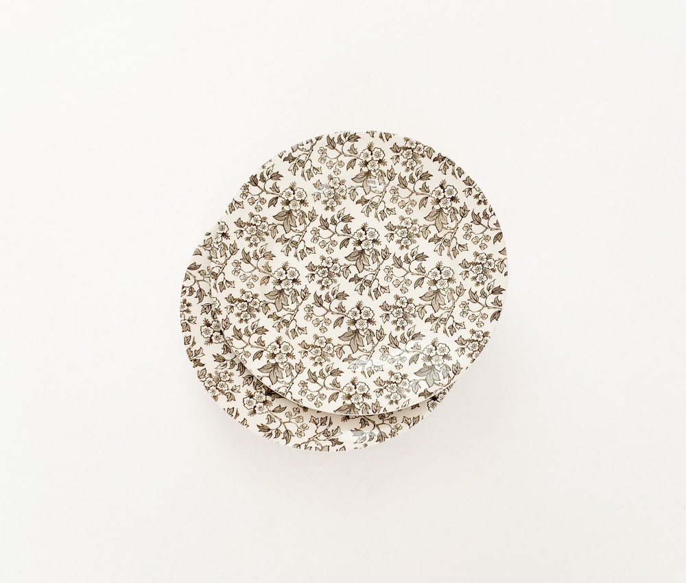 소개해드리는 제품은 1950년대 중반즈음의 것으로 전해지는 디너플레이트, 티플레이트와 보울 입니다. 아이언웨어를 소재로 만들어진 그릇들은 도톰하고 단정한 선을 가지고 있으며, 섬세한 무늬를 표현 할 수 있는 트랜스퍼프린트를 사용하여 겉면에 잔잔한 꽃무늬를 입혀냈습니다. 차분하고 고운 결이 담겨있는 낮은 채도의 갈색으로 표현 된 잔잔한 꽃무늬는, 바탕이 되는 밝은 크림색의 아이언웨어와 함께 자연스런 어울림을 보여줍니다. 꾸밈에서 전해지는 밝고 보드라운 정서, 색감과 소재 그리고 단정한 실루엣으로부터 전해지는- 치우침없는 아름다운 균형을 가지고 있는 제품입니다. 한가로운 오후의 차마시는 시간을 위한 그릇으로, 매일 마주하는 식탁을 조금 더 특별한 모습으로 완성해 줄 그릇들로 사용하기에 잘 어울립니다.