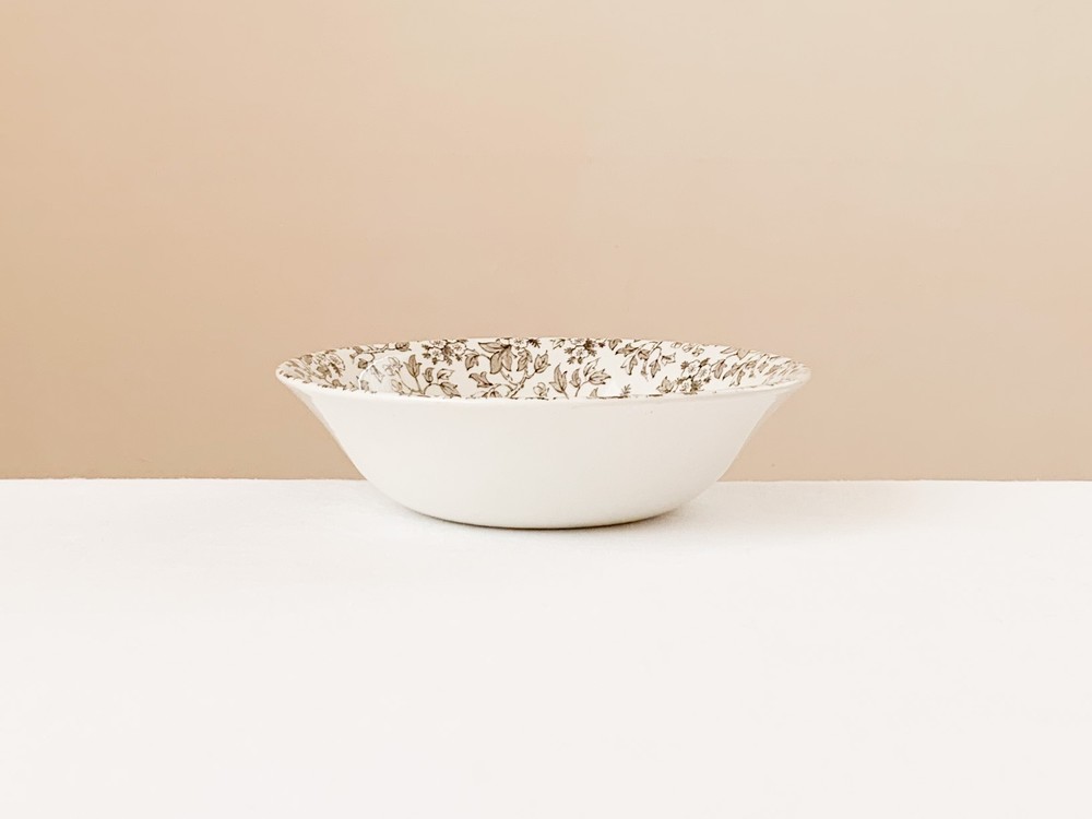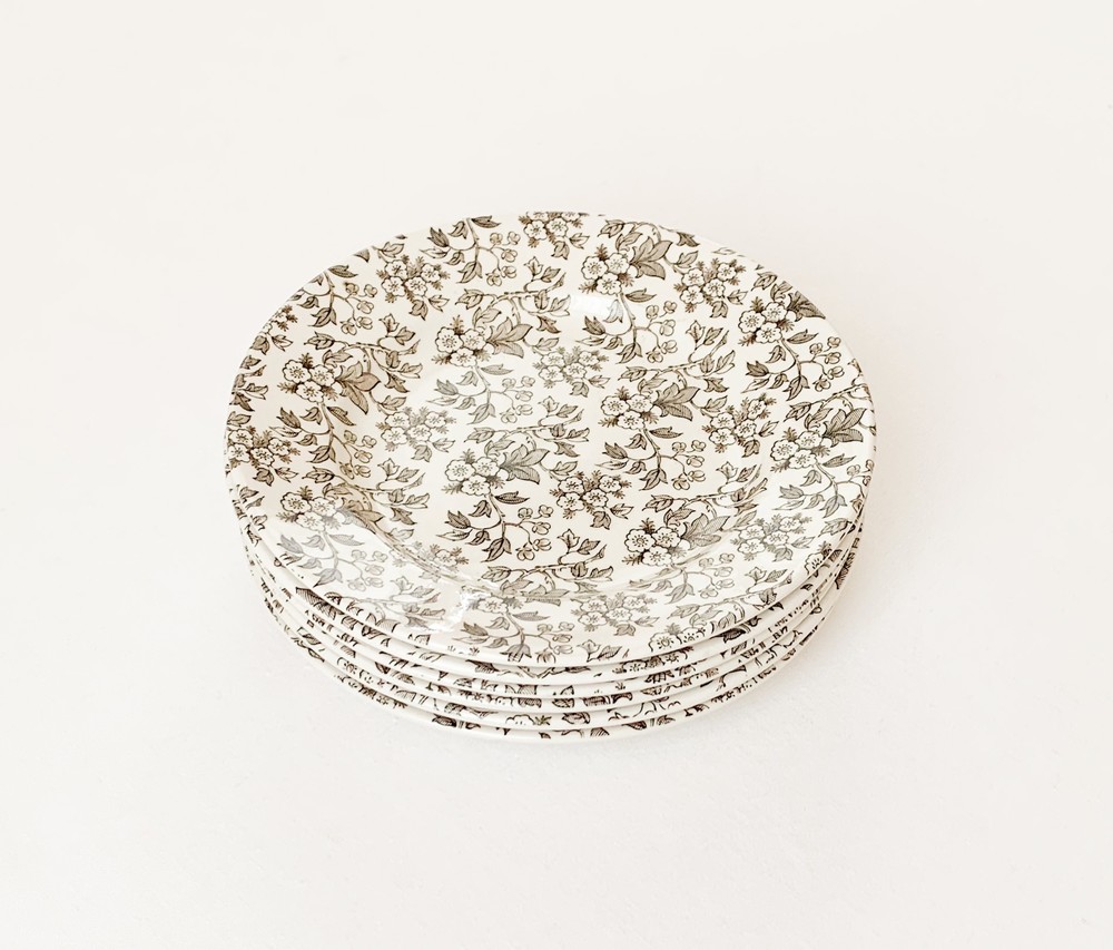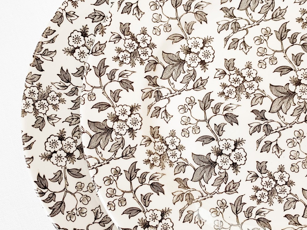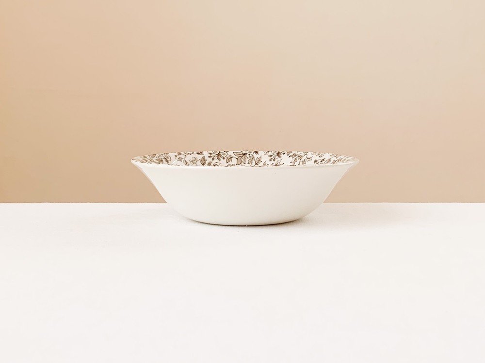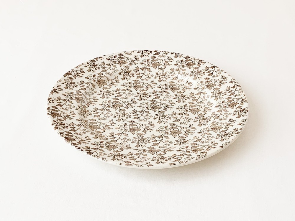 소개해드리는 제품은 1950년대 중반즈음의 것으로 전해지는 디너플레이트, 티플레이트와 보울 입니다. 아이언웨어를 소재로 만들어진 그릇들은 도톰하고 단정한 선을 가지고 있으며, 섬세한 무늬를 표현 할 수 있는 트랜스퍼프린트를 사용하여 겉면에 잔잔한 꽃무늬를 입혀냈습니다. 차분하고 고운 결이 담겨있는 낮은 채도의 갈색으로 표현 된 잔잔한 꽃무늬는, 바탕이 되는 밝은 크림색의 아이언웨어와 함께 자연스런 어울림을 보여줍니다. 꾸밈에서 전해지는 밝고 보드라운 정서, 색감과 소재 그리고 단정한 실루엣으로부터 전해지는- 치우침없는 아름다운 균형을 가지고 있는 제품입니다. 한가로운 오후의 차마시는 시간을 위한 그릇으로, 매일 마주하는 식탁을 조금 더 특별한 모습으로 완성해 줄 그릇들로 사용하기에 잘 어울립니다.