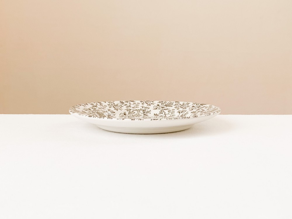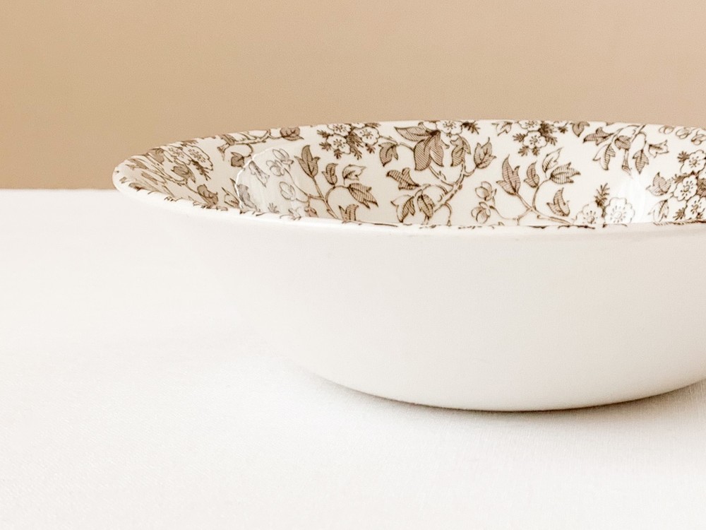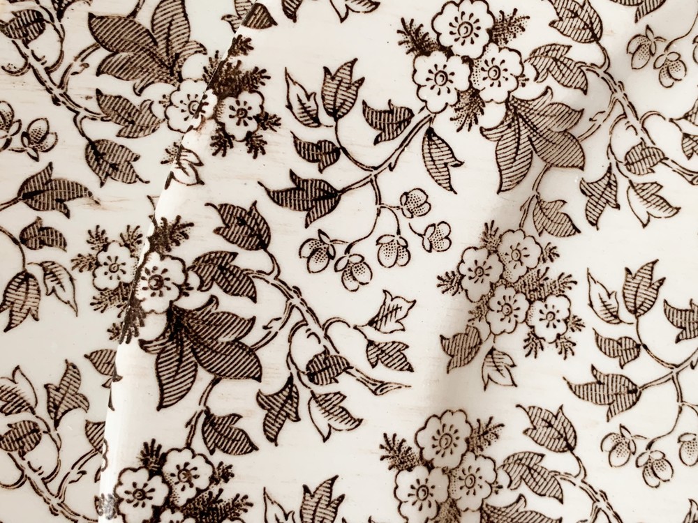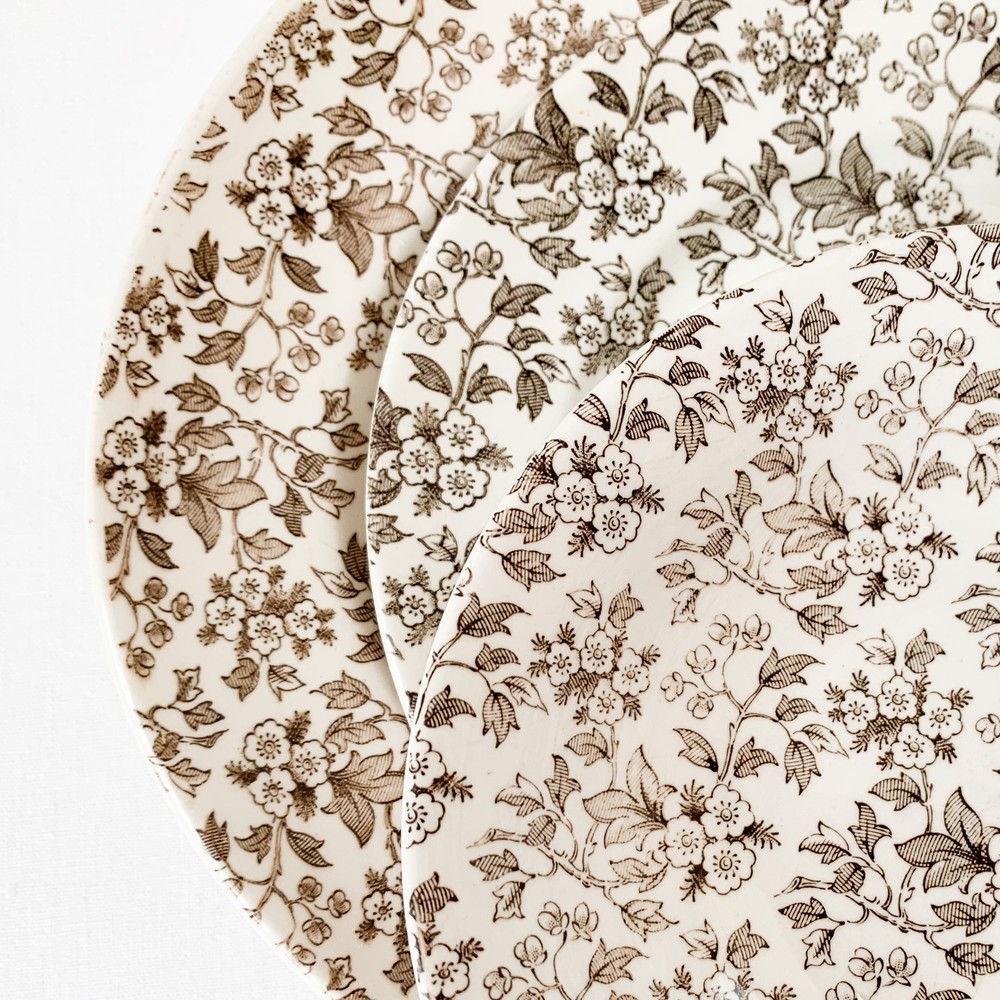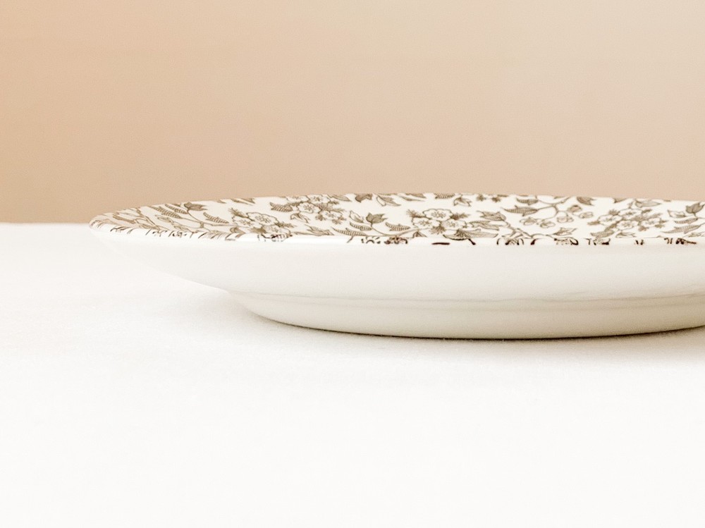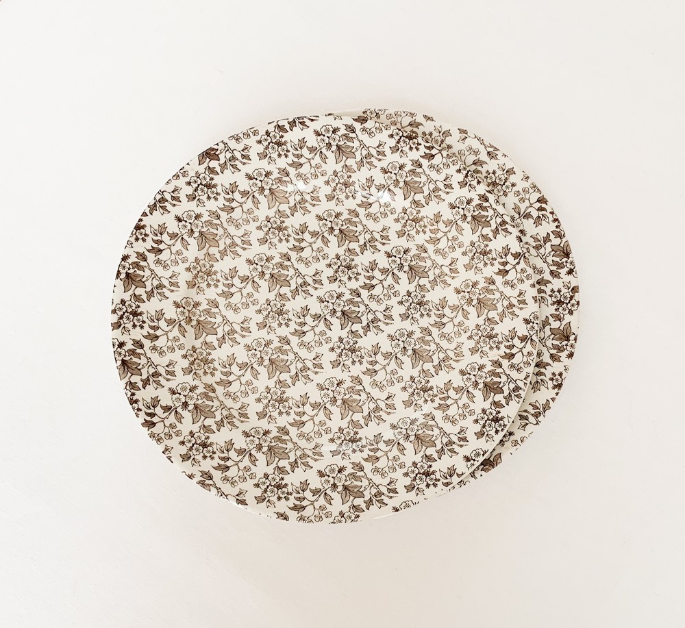 소개해드리는 제품은 1950년대 중반즈음의 것으로 전해지는 디너플레이트, 티플레이트와 보울 입니다. 아이언웨어를 소재로 만들어진 그릇들은 도톰하고 단정한 선을 가지고 있으며, 섬세한 무늬를 표현 할 수 있는 트랜스퍼프린트를 사용하여 겉면에 잔잔한 꽃무늬를 입혀냈습니다. 차분하고 고운 결이 담겨있는 낮은 채도의 갈색으로 표현 된 잔잔한 꽃무늬는, 바탕이 되는 밝은 크림색의 아이언웨어와 함께 자연스런 어울림을 보여줍니다. 꾸밈에서 전해지는 밝고 보드라운 정서, 색감과 소재 그리고 단정한 실루엣으로부터 전해지는- 치우침없는 아름다운 균형을 가지고 있는 제품입니다. 한가로운 오후의 차마시는 시간을 위한 그릇으로, 매일 마주하는 식탁을 조금 더 특별한 모습으로 완성해 줄 그릇들로 사용하기에 잘 어울립니다.