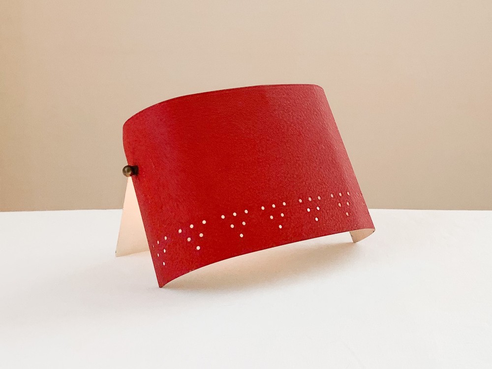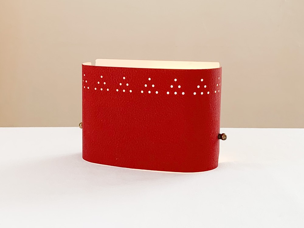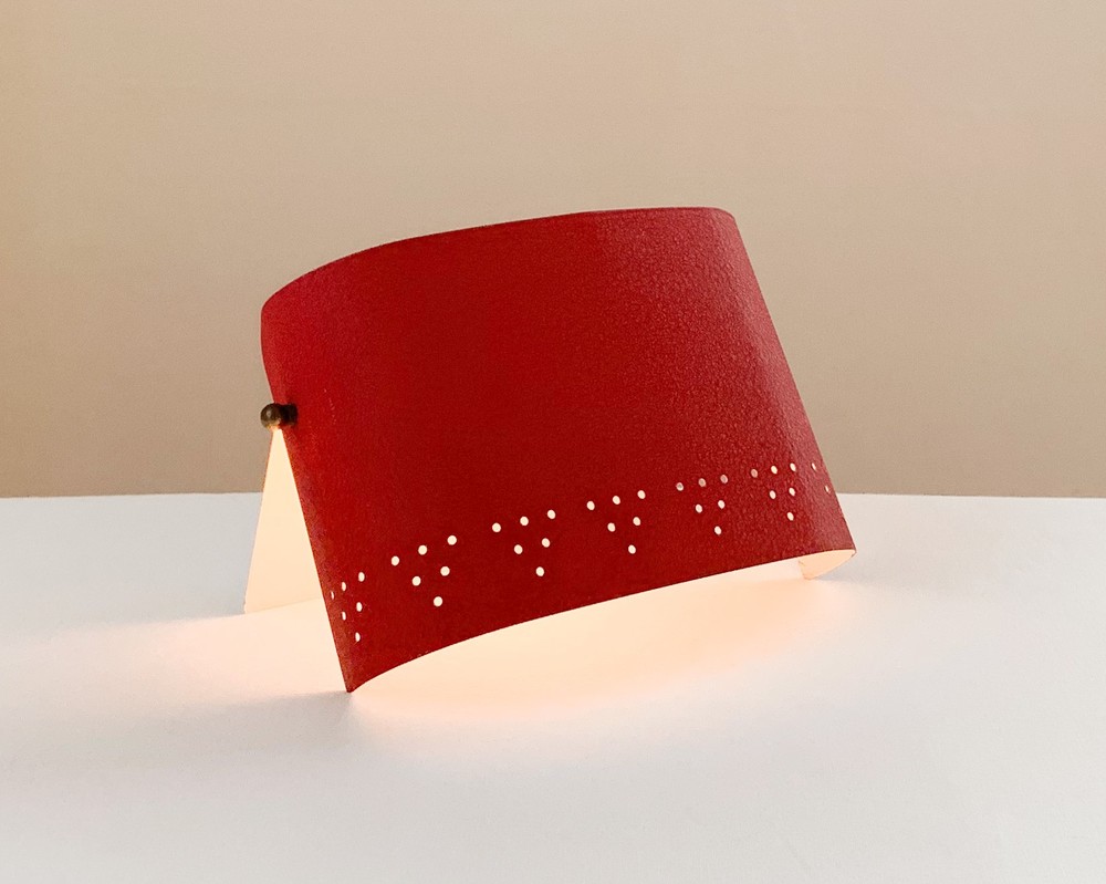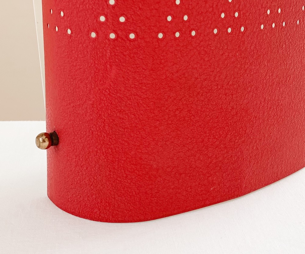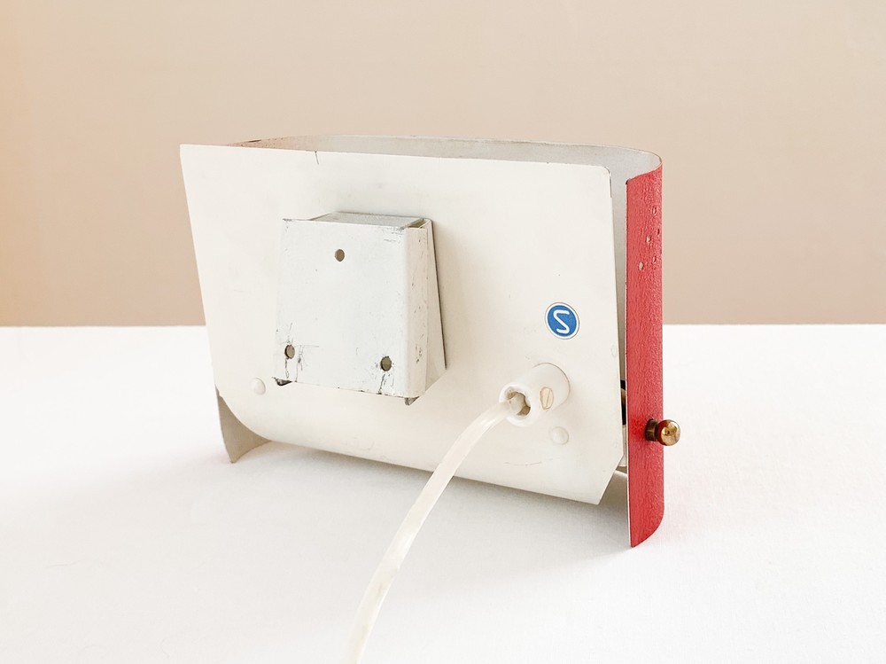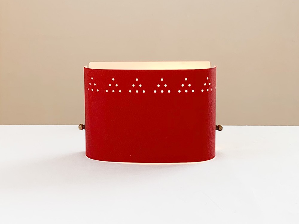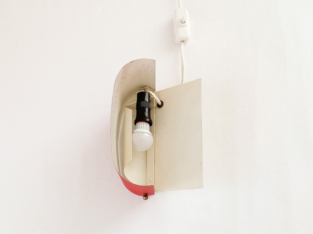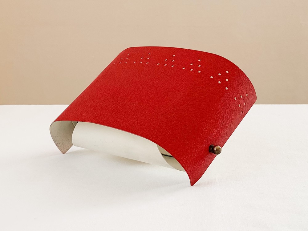 1950년대 후반, 스웨덴에서 제작된 것으로 전해지는 월램프입니다. 1940년대 이탈리아에서 시작 된 유서깊은 조명 브랜드인 스틸노보의 디자이너 Bruno Getta가 호텔에서 사용 될 벽등 디자인을 의뢰받아 만들어진 제품입니다. 색을 고르게 입혀낸 스틸을 소재로 하며, 두 개의 패널이 앞면과 뒷면을 이루고 있습니다. 차분하지만 선명한 채도를 가진 빨강이 보여지는 앞면에는, 장식의 역할과 함께 빛을 고르게 펼치는 역할을 하는 일정한 간격의 삼각형 패턴이 펀칭되어있습니다. 깨끗한 하얀색이 입혀진 뒷 면은 소캣과 전구를 감싸는 부분이 종이가 말아 올려진듯 고운 곡선으로 만들어져, 램프의 움직임이나 빛의 연결에 자연스러운 흐름을 더해줍니다. 두 개의 패널은 작은 브라스 볼을 통해 연결되어, 셰이드가 되는 앞면의 각도를 조절해 빛의 양을 조절 할 수 있습니다. 긴겨울과 긴저녁이 있는 곳에서 만들어진 램프인만큼, 환하고 포근한 정서가 담겨있으며- 단정하고 실루엣과 실용적이고 섬세한 매무새가 무척 아름답습니다. 국내에서 안전하게 사용할 수 있도록 테스트를 마쳤으며, 소켓과 스위치 전선은 만들어질 당시의 것이 그대로 사용되었습니다. 취향과 용도에 따라 여러방향으로 놓아두는 테이블 램프로 사용이 가능하며, 벽등으로 사용시에도 펼쳐지는 면을 위아래로 다르게 두는 두 가지 모습으로 설치가 가능합니다. 귀한 소장품으로 충분한 가치를 가지고 있으며, 세련되고 따뜻한 위트가 깃든 공간을 완성해 주는 조명으로 사용하기에 알맞습니다.