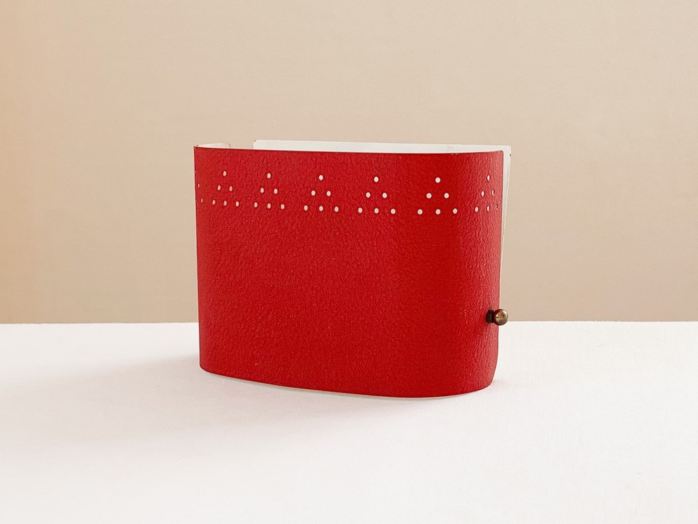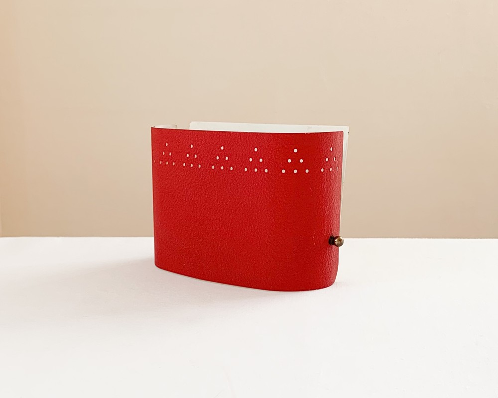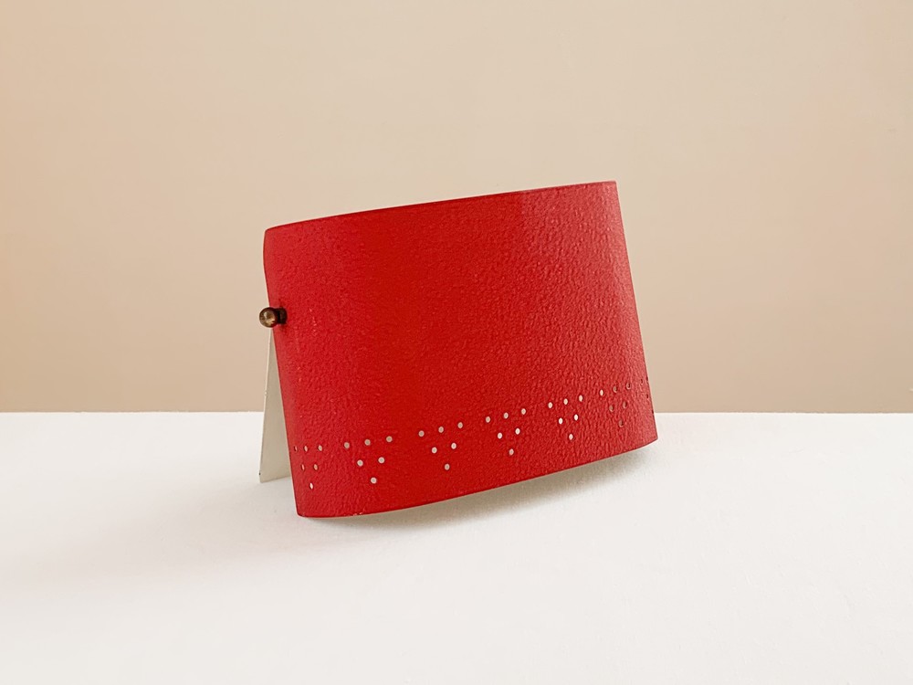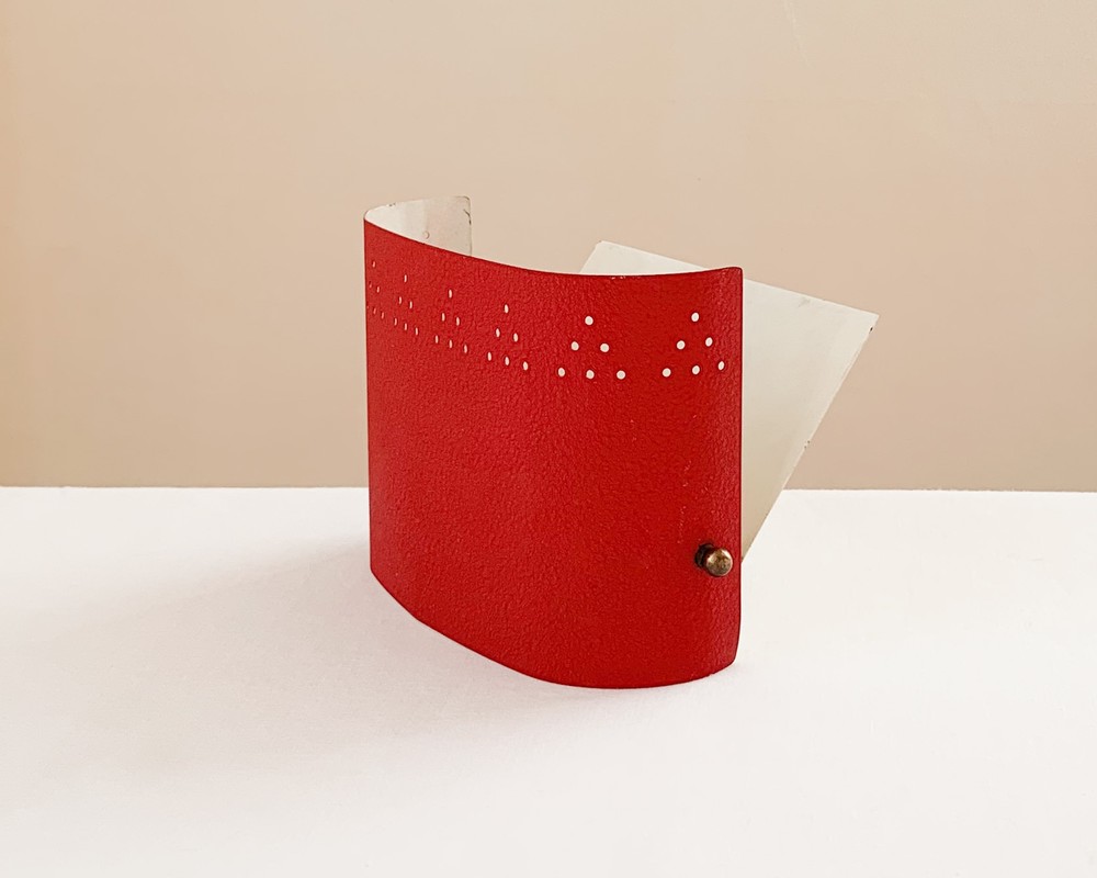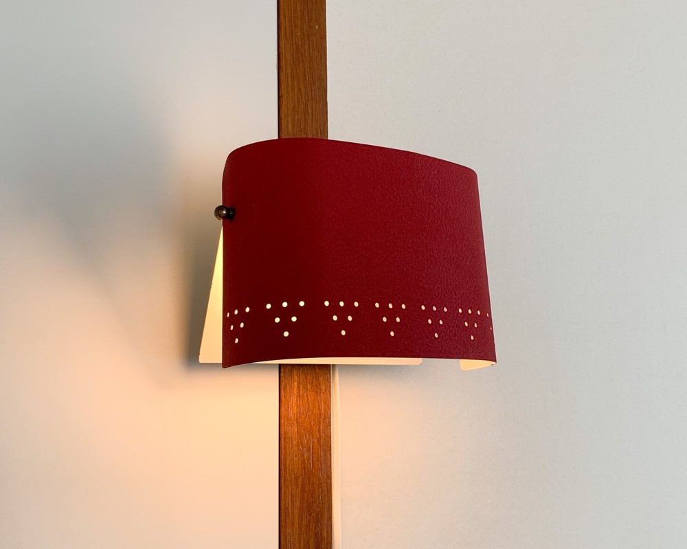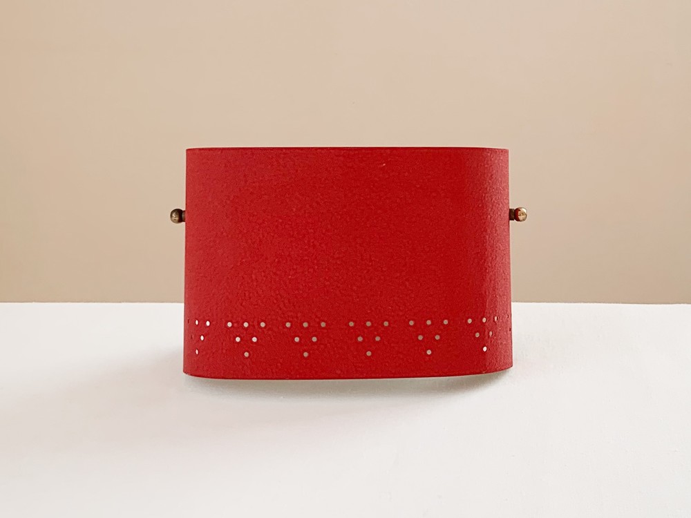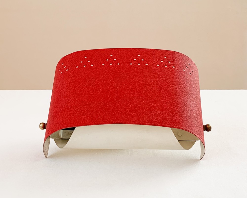 1950년대 후반, 스웨덴에서 제작된 것으로 전해지는 월램프입니다. 1940년대 이탈리아에서 시작 된 유서깊은 조명 브랜드인 스틸노보의 디자이너 Bruno Getta가 호텔에서 사용 될 벽등 디자인을 의뢰받아 만들어진 제품입니다. 색을 고르게 입혀낸 스틸을 소재로 하며, 두 개의 패널이 앞면과 뒷면을 이루고 있습니다. 차분하지만 선명한 채도를 가진 빨강이 보여지는 앞면에는, 장식의 역할과 함께 빛을 고르게 펼치는 역할을 하는 일정한 간격의 삼각형 패턴이 펀칭되어있습니다. 깨끗한 하얀색이 입혀진 뒷 면은 소캣과 전구를 감싸는 부분이 종이가 말아 올려진듯 고운 곡선으로 만들어져, 램프의 움직임이나 빛의 연결에 자연스러운 흐름을 더해줍니다. 두 개의 패널은 작은 브라스 볼을 통해 연결되어, 셰이드가 되는 앞면의 각도를 조절해 빛의 양을 조절 할 수 있습니다. 긴겨울과 긴저녁이 있는 곳에서 만들어진 램프인만큼, 환하고 포근한 정서가 담겨있으며- 단정하고 실루엣과 실용적이고 섬세한 매무새가 무척 아름답습니다. 국내에서 안전하게 사용할 수 있도록 테스트를 마쳤으며, 소켓과 스위치 전선은 만들어질 당시의 것이 그대로 사용되었습니다. 취향과 용도에 따라 여러방향으로 놓아두는 테이블 램프로 사용이 가능하며, 벽등으로 사용시에도 펼쳐지는 면을 위아래로 다르게 두는 두 가지 모습으로 설치가 가능합니다. 귀한 소장품으로 충분한 가치를 가지고 있으며, 세련되고 따뜻한 위트가 깃든 공간을 완성해 주는 조명으로 사용하기에 알맞습니다.
