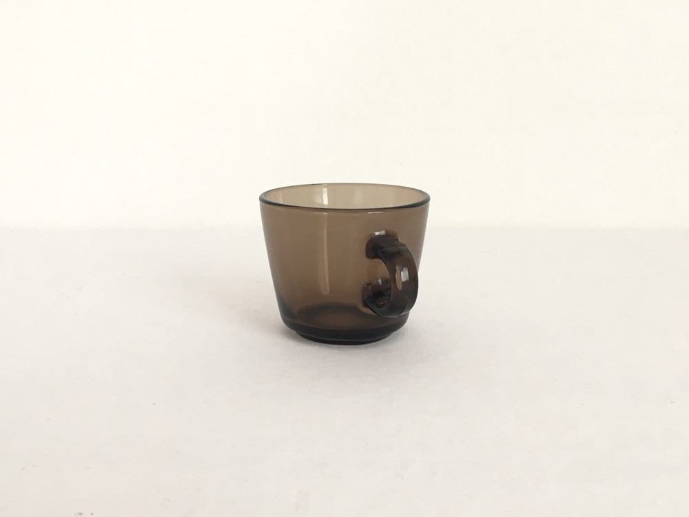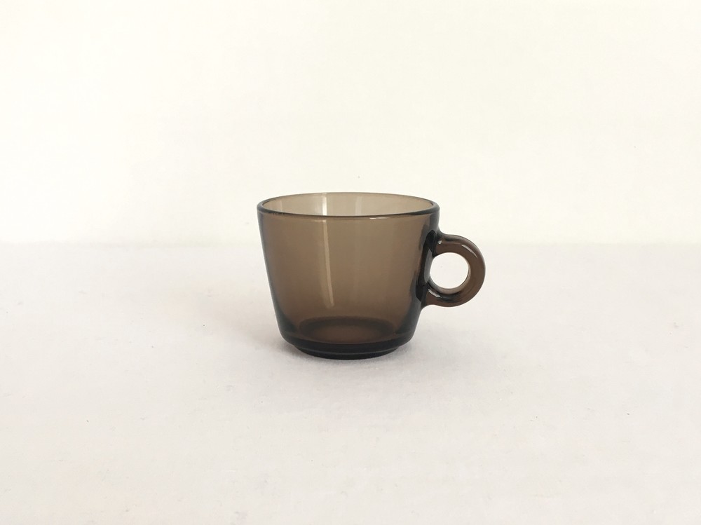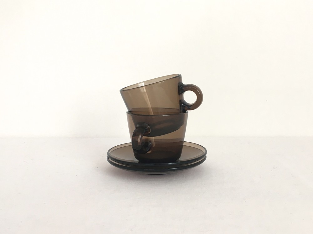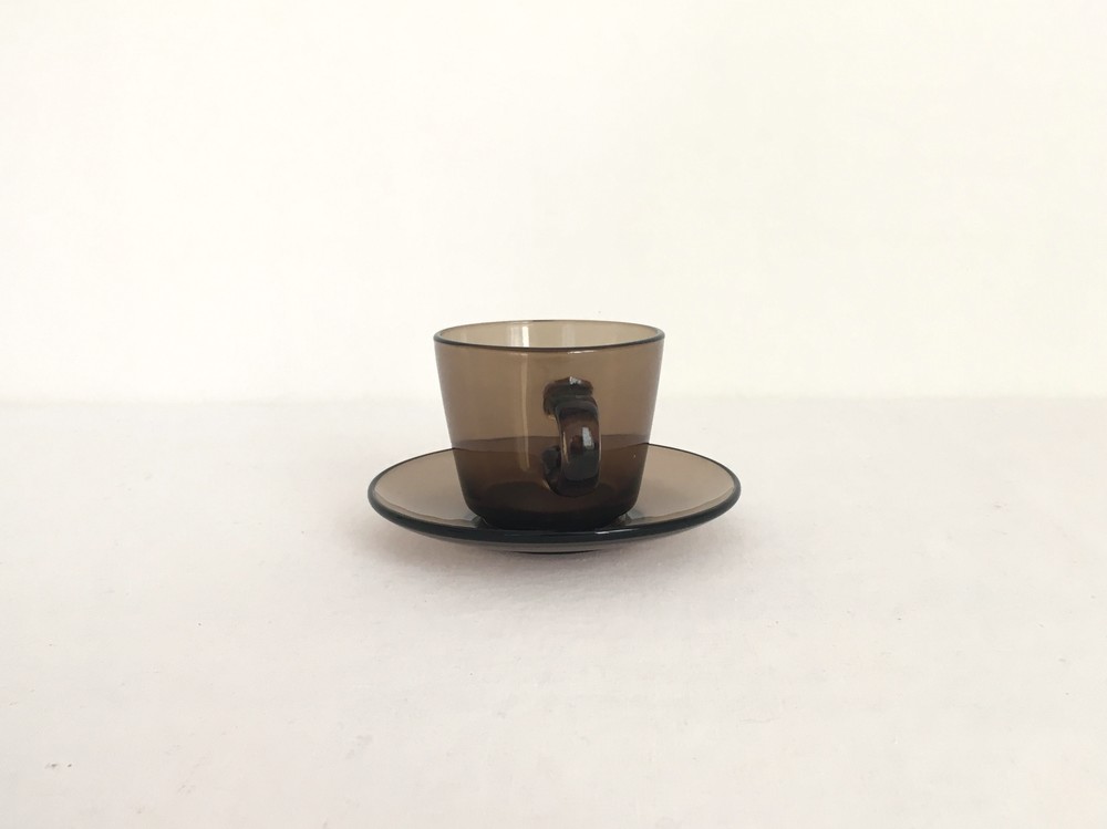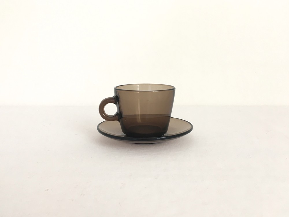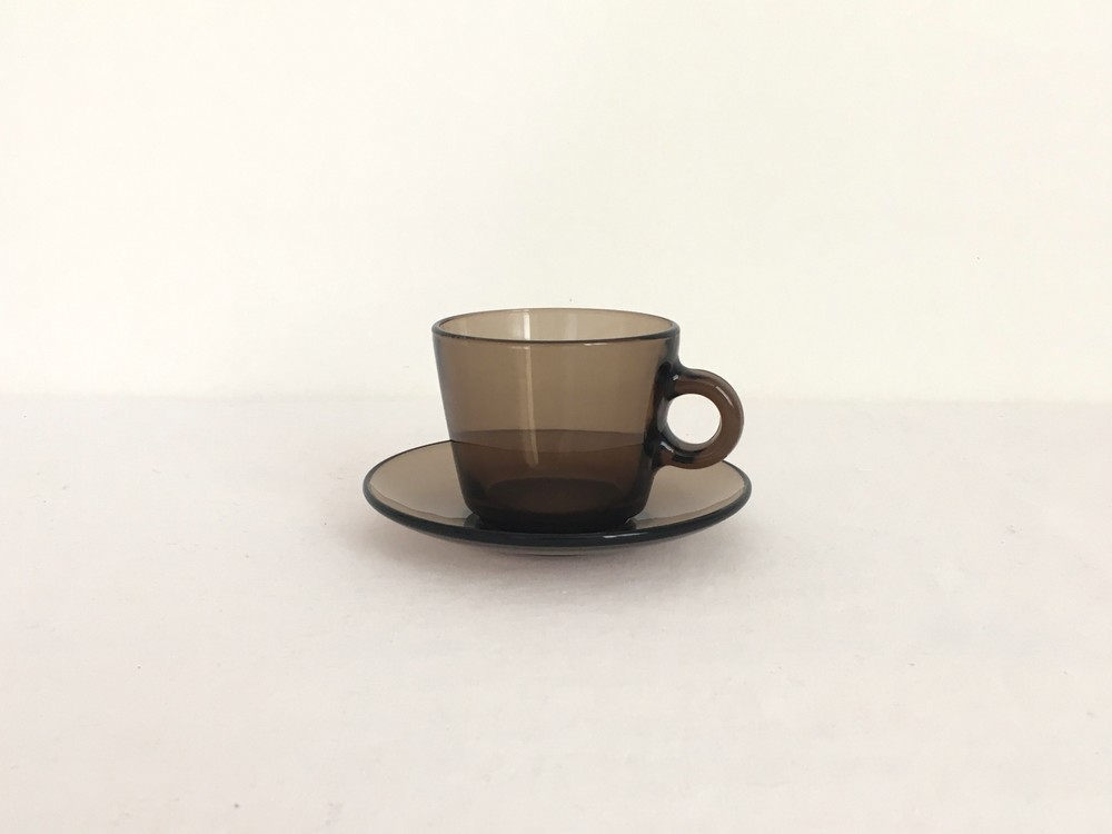 베레코는, 루이14세때부터 유리문과 거울을 주로 생산했던 건축자제 회사인 프랑스의 생고뱅으로 시작된 듀라렉스를 전신으로 하는 브랜드입니다. 1920년대에 들어 자동차에 들어가는 유리들을 만드는데 까지 생고뱅의 범위가 넓어지고, 더 튼튼하고 관리가 용이한 유리에 대한 필요성을 생각하게되어 1929년에 온도변화에 반응이 적은 강화유리를 개발하게됩니다. 이와함께 생고뱅의 유리제품은 물론 듀라렉스의 식기들이 전성기를 맞이하게되며, 완전한 강화유리 제품만을 제작하는 베레코가 만들어집니다. 여러가지의 빠른 변화들로 베레코는 오래 유지되지 못하지만, 시대와 공간에 구애받지않고 많은 유리제품들의 모티프가 되는 듀라렉스만큼 훌륭한 가치를 가지고 있는 브랜드입니다. 소개해드리는 제품은 1950년대에 만들어진- 흠집과 파손에 강하고 내용물의 온도유지에 적합한 베레코의 강화유리 찻세트입니다. 도톰하고 맑은, 잿빛의 유리를 재료로- 몰드를 사용해 만들어졌습니다. 무덤덤해서 편안한 기분이 전해지기도하는 적당한 크기와 안정감있는 둥근 손잡이를 가진 찻잔과, 잔잔한 물결이 떠오르는 매끄러운 모양의 잔받침으로 구성되어있습니다. 매일사용하는 물잔과 작은 접시로 잔과 잔 받침을 따로 사용하기에도 알맞은 모습을 가지고 있으며, 따끈한 밀크티나 비스킷을 얹은 아이스크림을 담아내는 디저트컵으로 사용하기에도 잘 어울립니다.