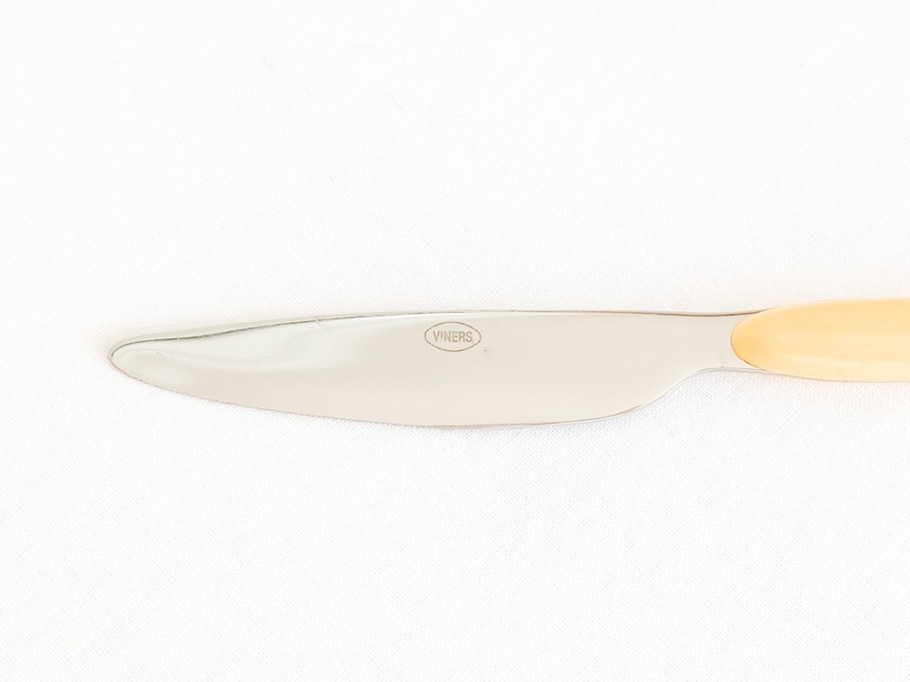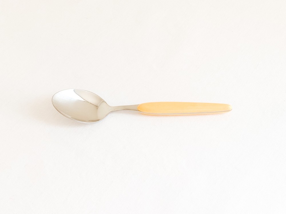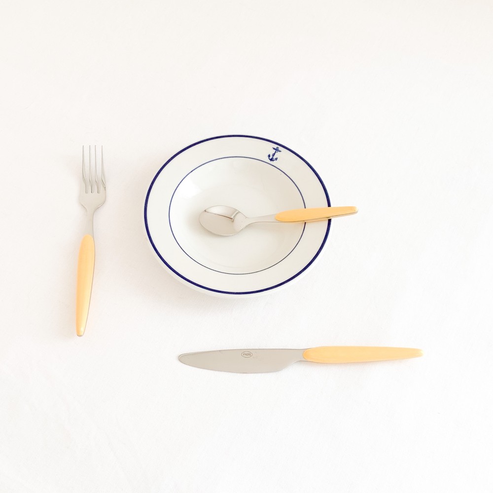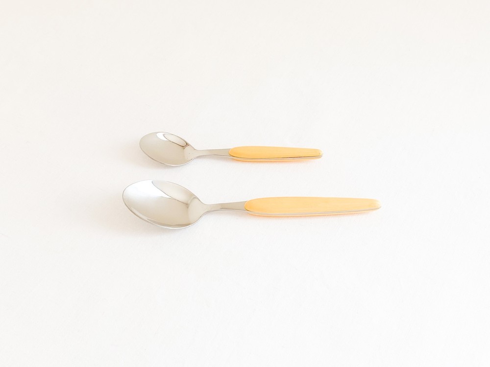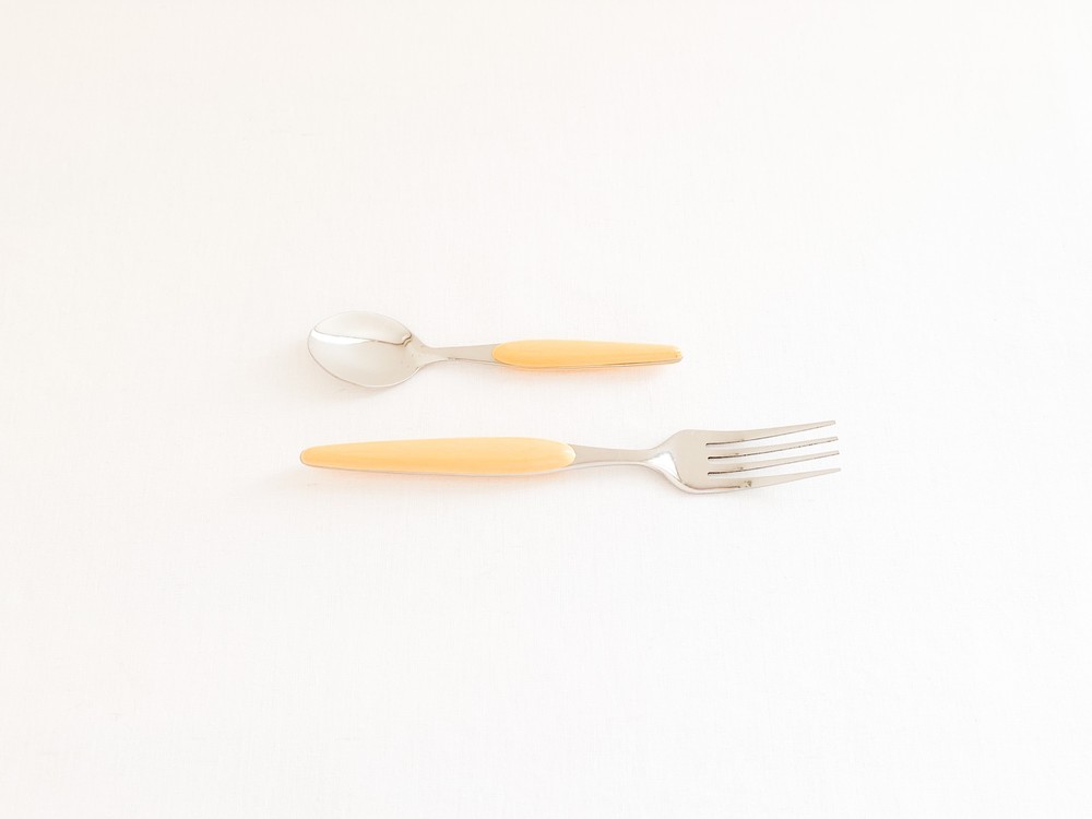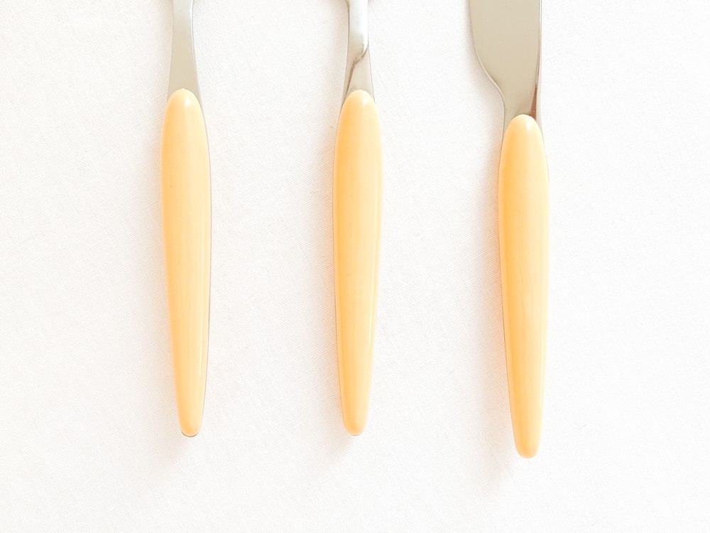 소개해드리는 제품들은 1950년대에 제작된것으로, 고른 결을가진 좋은 품질의 스테인리스 스틸과 단단한 베이클라이트를 소재로 합니다. 입에 닿았을때, 손에 들었을때에 편안한 기분을 전해주는 단정한 형태를 가지고 있습니다. 스푼들과 포크, 나이프는- 보울과 프롱, 날을 이루는 스테인리스 스틸이 핸들을 지지하는 프레임과 같은 실루엣으로 이어져 있으며, 그 프레임 양쪽으로 베이클라이트 소재의 핸들이 볼록한 모양으로 연결되어 내구성을 더욱 견고히 합니다. 제품이 만들어진 당시인 미드센츄리 특유의 섬세하고 경쾌한 분위기가 잘 담겨있으며, 따스한기분을 전해주는 짙은 커스터드색과 스테인리스 스틸의 간결한 느낌이 보기좋은 조화를 이룹니다. 느긋한 식탁위에서, 다정한 이야기를 주고받는 티테이블에서 사용하는 커틀러리도 잘 어울립니다.