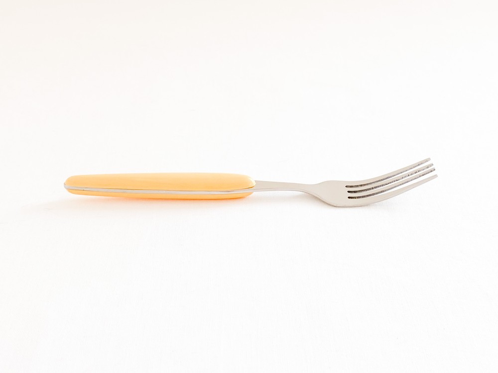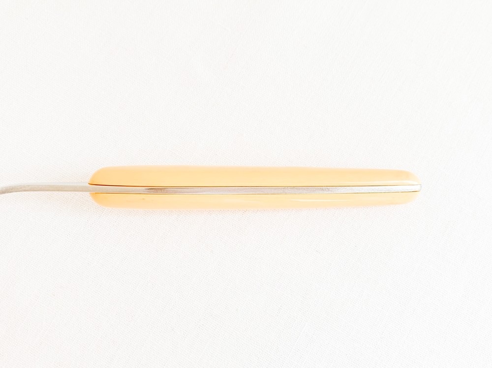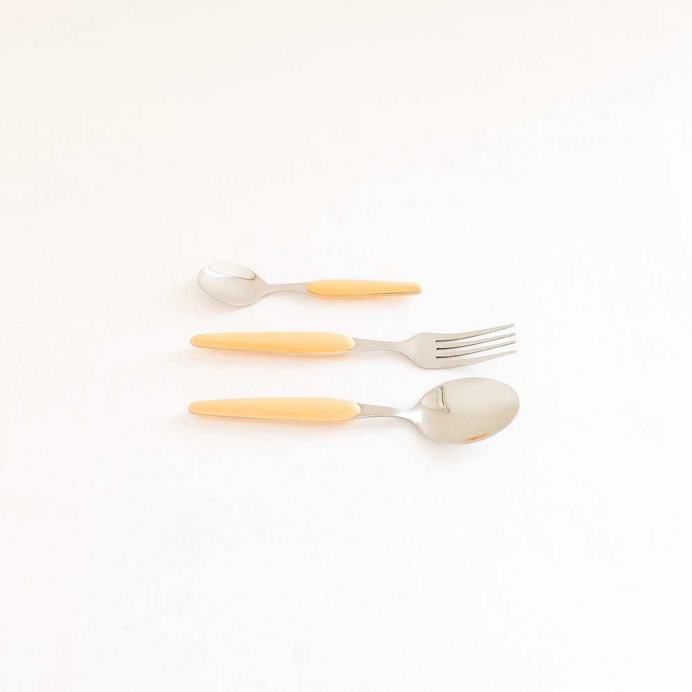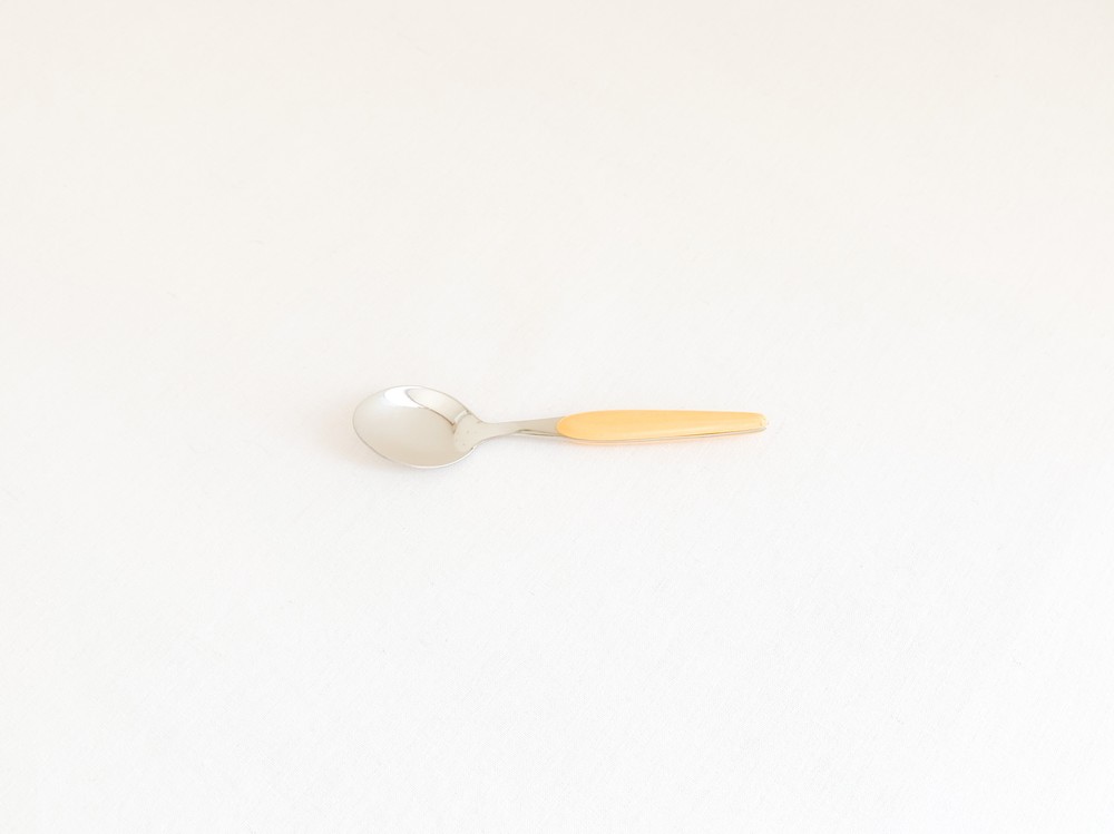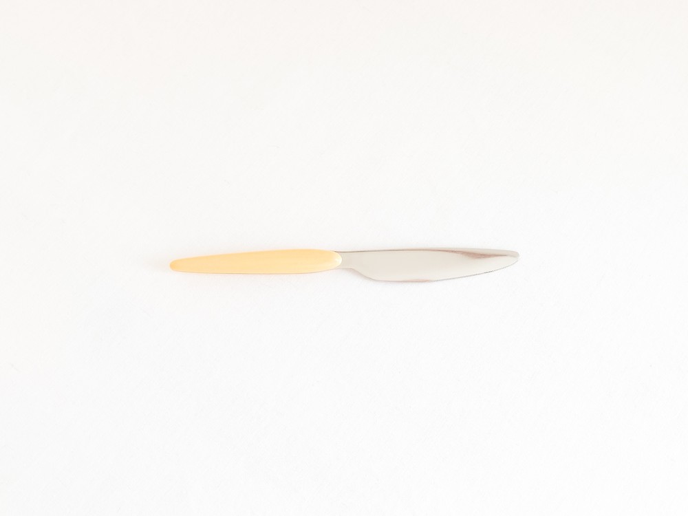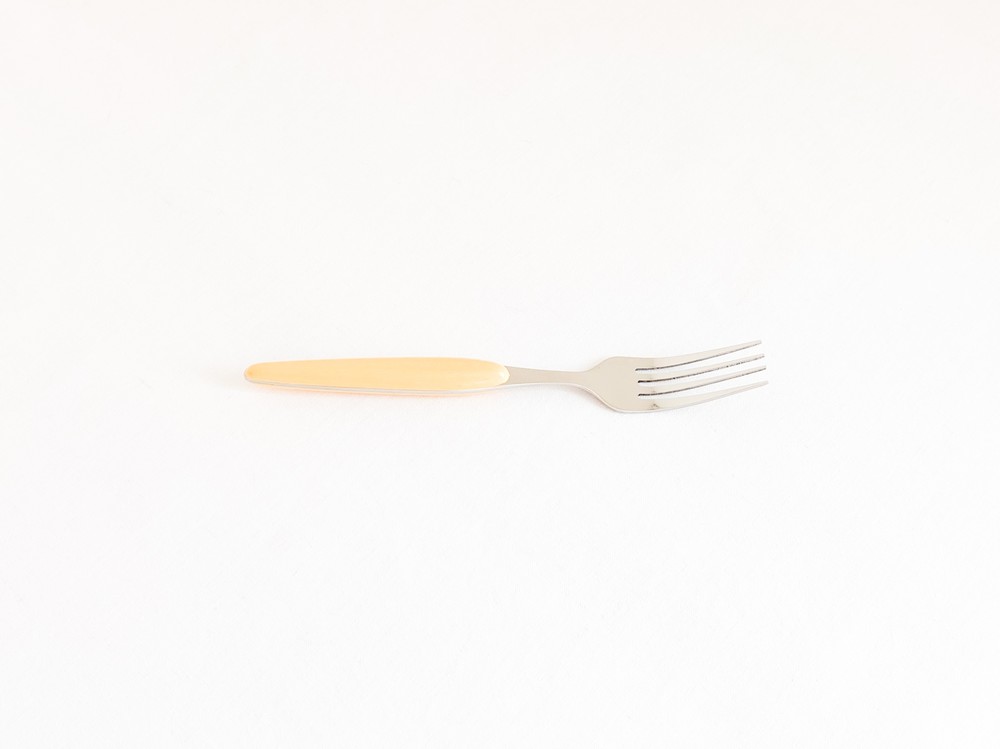 소개해드리는 제품들은 1950년대에 제작된것으로, 고른 결을가진 좋은 품질의 스테인리스 스틸과 단단한 베이클라이트를 소재로 합니다. 입에 닿았을때, 손에 들었을때에 편안한 기분을 전해주는 단정한 형태를 가지고 있습니다. 스푼들과 포크, 나이프는- 보울과 프롱, 날을 이루는 스테인리스 스틸이 핸들을 지지하는 프레임과 같은 실루엣으로 이어져 있으며, 그 프레임 양쪽으로 베이클라이트 소재의 핸들이 볼록한 모양으로 연결되어 내구성을 더욱 견고히 합니다. 제품이 만들어진 당시인 미드센츄리 특유의 섬세하고 경쾌한 분위기가 잘 담겨있으며, 따스한기분을 전해주는 짙은 커스터드색과 스테인리스 스틸의 간결한 느낌이 보기좋은 조화를 이룹니다. 느긋한 식탁위에서, 다정한 이야기를 주고받는 티테이블에서 사용하는 커틀러리도 잘 어울립니다.