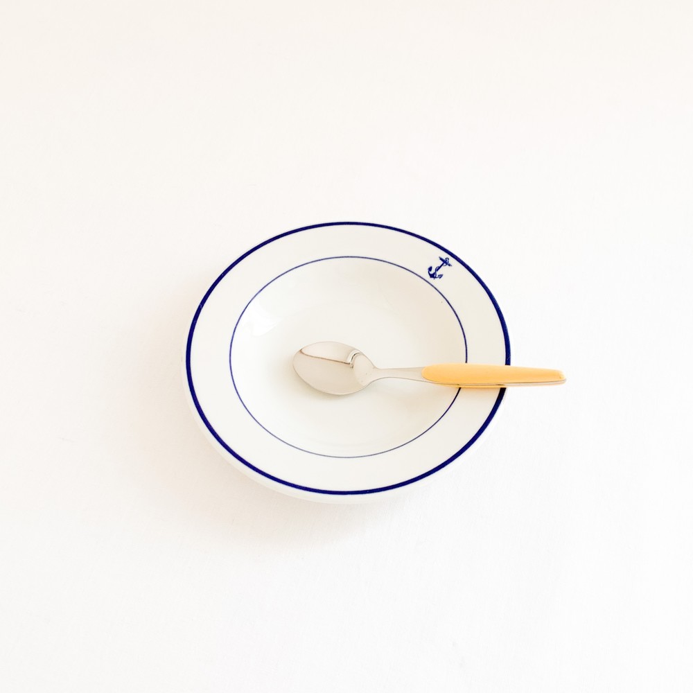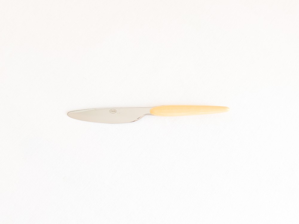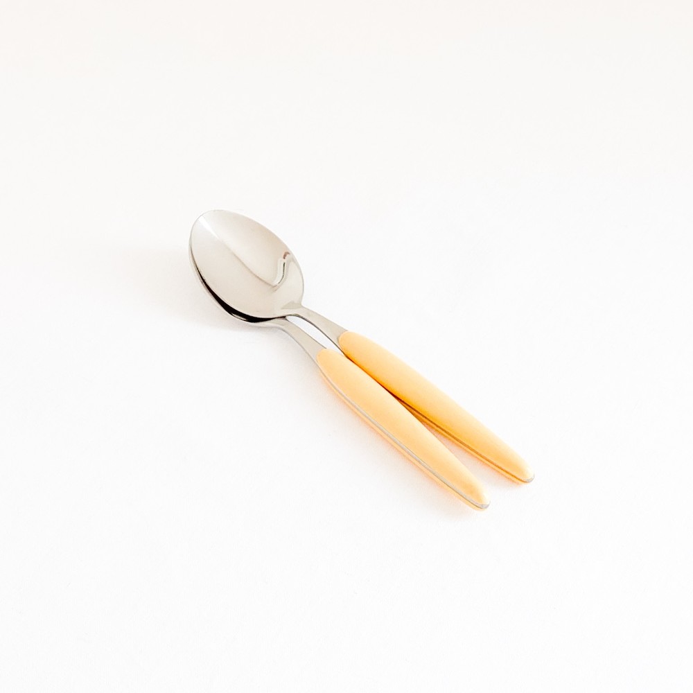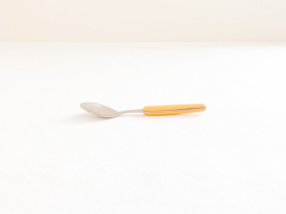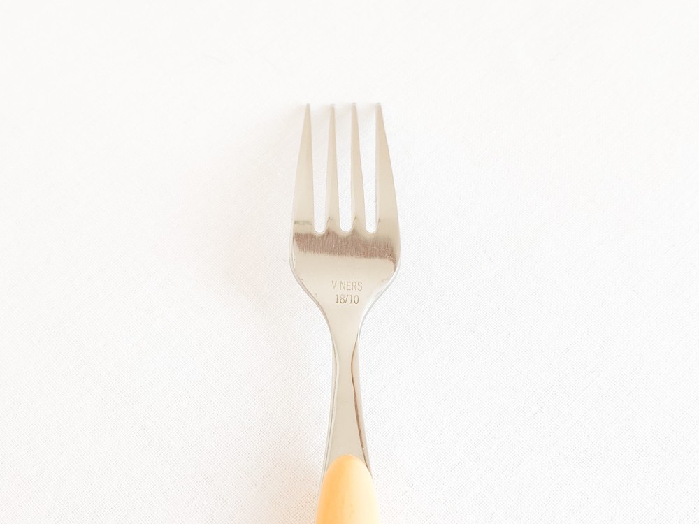 소개해드리는 제품들은 1950년대에 제작된것으로, 고른 결을가진 좋은 품질의 스테인리스 스틸과 단단한 베이클라이트를 소재로 합니다. 입에 닿았을때, 손에 들었을때에 편안한 기분을 전해주는 단정한 형태를 가지고 있습니다. 스푼들과 포크, 나이프는- 보울과 프롱, 날을 이루는 스테인리스 스틸이 핸들을 지지하는 프레임과 같은 실루엣으로 이어져 있으며, 그 프레임 양쪽으로 베이클라이트 소재의 핸들이 볼록한 모양으로 연결되어 내구성을 더욱 견고히 합니다. 제품이 만들어진 당시인 미드센츄리 특유의 섬세하고 경쾌한 분위기가 잘 담겨있으며, 따스한기분을 전해주는 짙은 커스터드색과 스테인리스 스틸의 간결한 느낌이 보기좋은 조화를 이룹니다. 느긋한 식탁위에서, 다정한 이야기를 주고받는 티테이블에서 사용하는 커틀러리도 잘 어울립니다.
