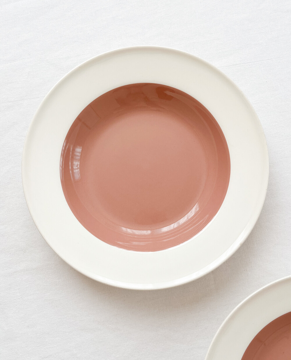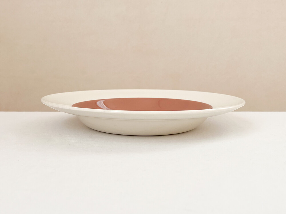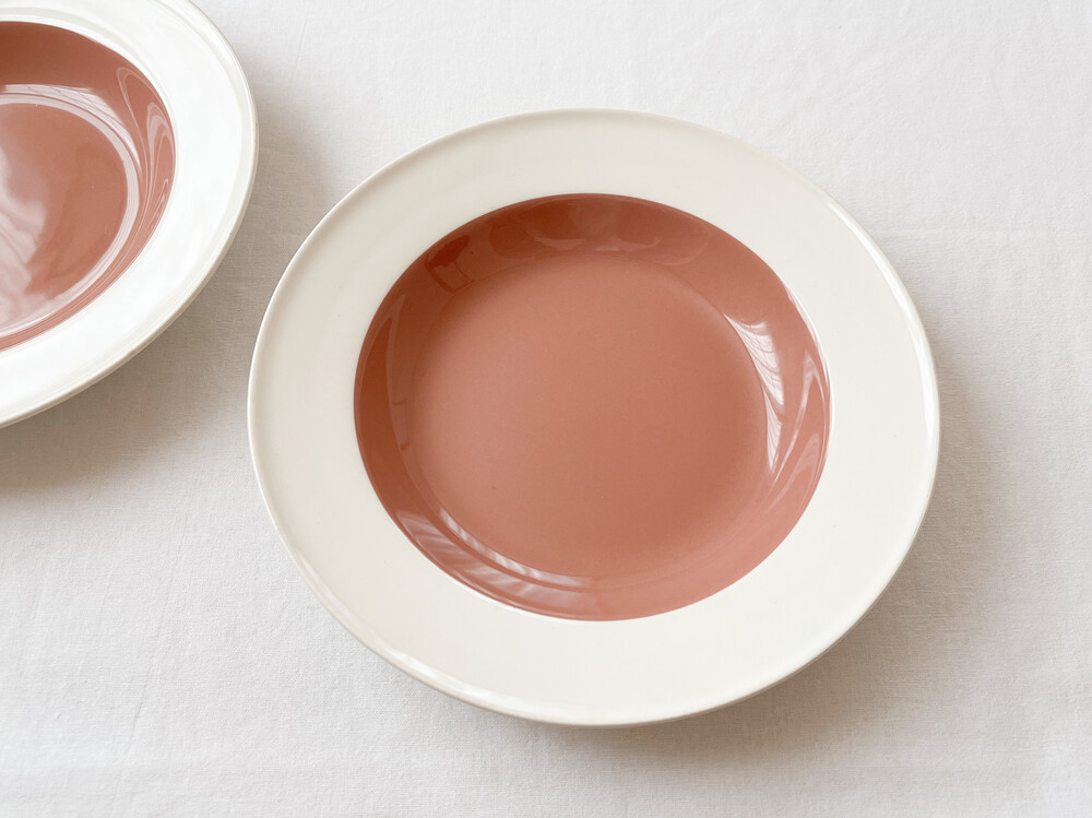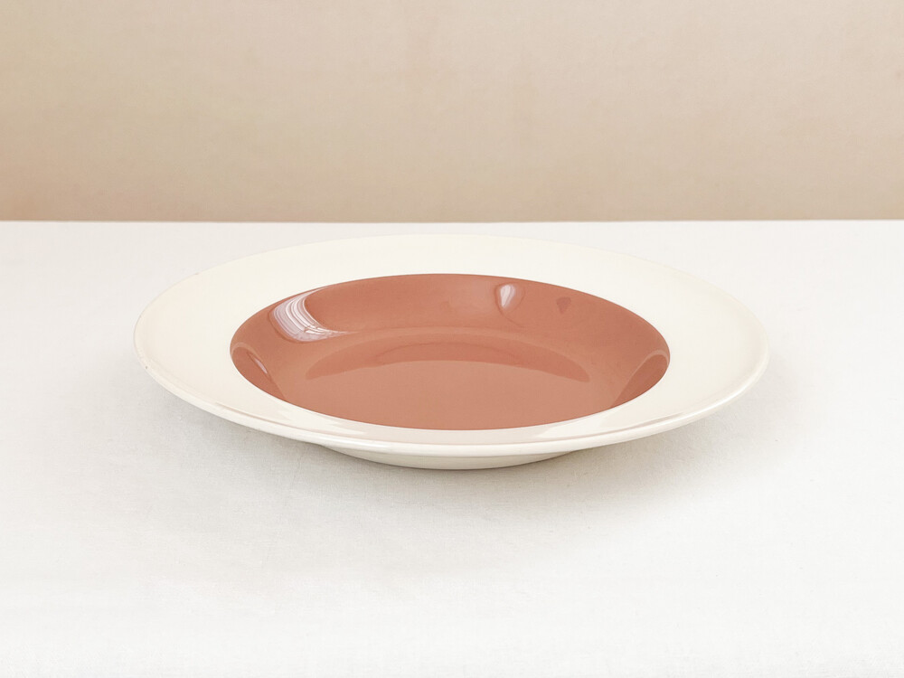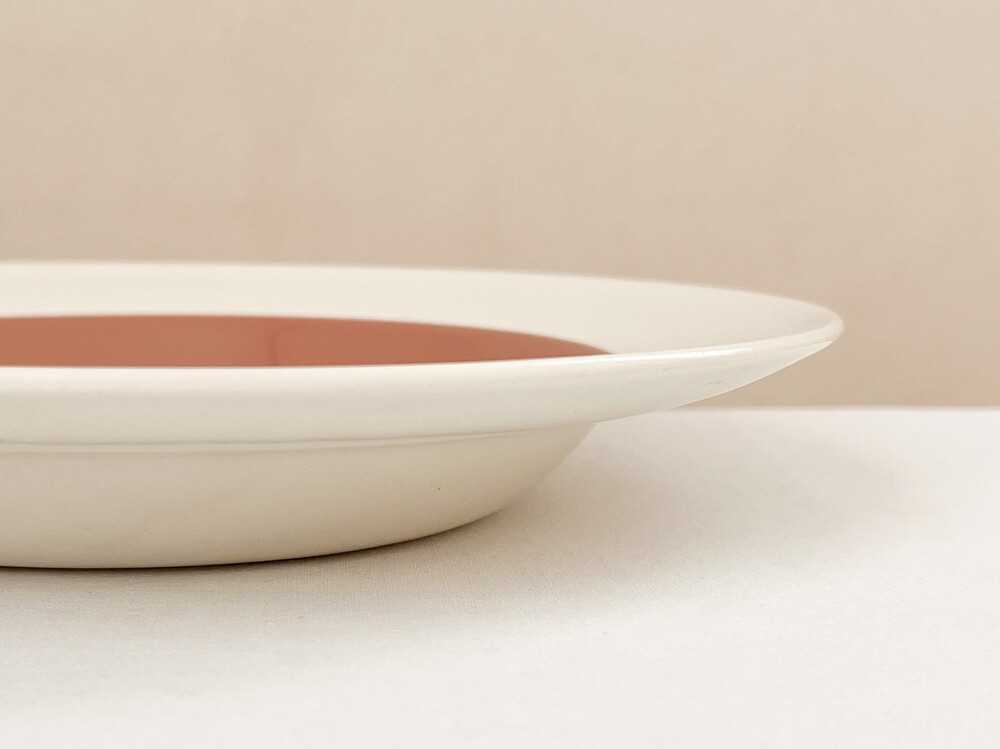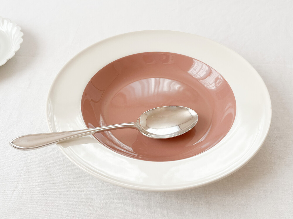 1950년대 중반 즈음 만들어진 웨지우드의 빈티지 보울입니다. 웨지우드는 1759년 부터 영국의 버슬램지역에서 도자기를 만들어온 브랜드입니다. 고급 티웨어와 식기들, 그리고 도자기 장식품들을 만들며 가치를 쌓아오는 웨지우드는 1760년대 부터 왕실에서 사용하는 도자기를 제작하게 되기도 합니다. 섬세한 디자인과 좋은 품질의 도자기를 꾸준히 만들어내며, 영국을 비롯한 도자기라는 카테고리를 대표하는 브랜드로 자리잡게 됩니다. 소개해드리는 제품은, 웨지우드 특유의 화사하고 고운결의 크림색의 본차이나를 소재로합니다. 반듯한 동그라미, 잔잔하고 매끈한 실루엣이 돋보입니다. 접시의 가운데에는 코코아색이 한방울 섞이 차분한 장미빛이 보여지며, 넓은 가장자리에는 소재가 되는 크림색 본차이나가 그대로 보여집니다. 아주 고운 짜임의 실크나 보드라운 벨벳리본을 바라보는 듯, 섬세하게 반짝이는 고운 결과 색감이 무척 아름답고, 담담함과 고전의 무게있는 우아함이 전해주는 균형이 깃들어 있습니다. 보울과 플레이트 사이의 우아한 실루엣을 가지고 있으며, 여려용도로 활용하기에 알맞습니다. 희소가치가 매우 높은 시리즈로 귀한 수집품으로의 역할이 충분한 그릇이며, 느리게 보내는 휴일의 점심식사를 위한 그릇으로 사용하거나 특별한 시간을 위한 한 조각 디저트를 담아내기에 잘 어울립니다.