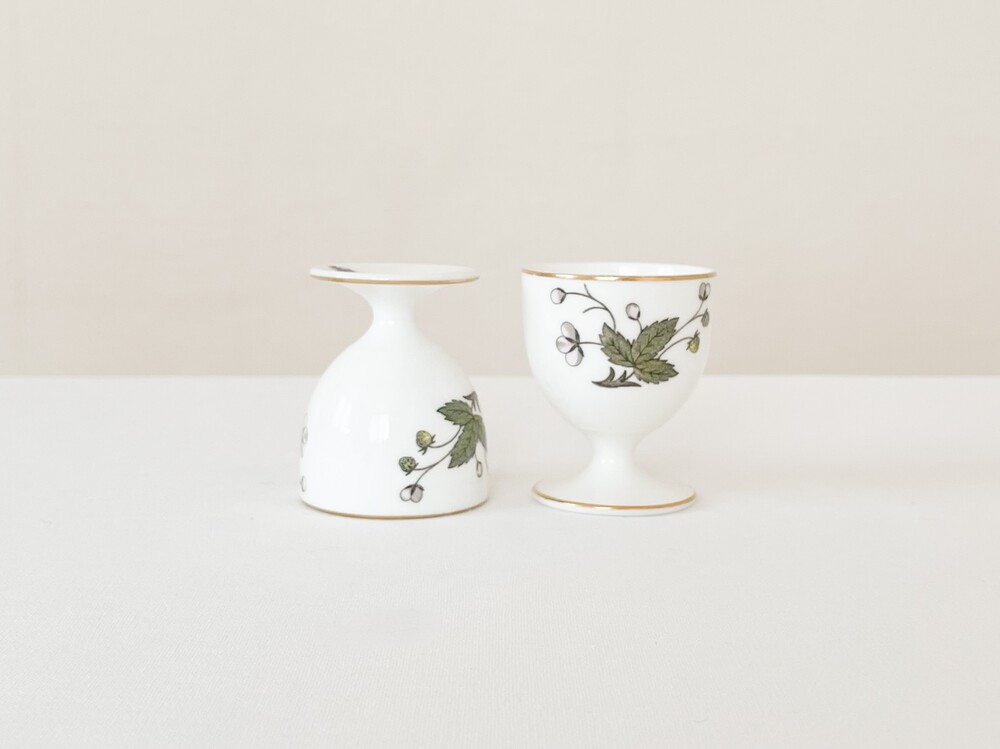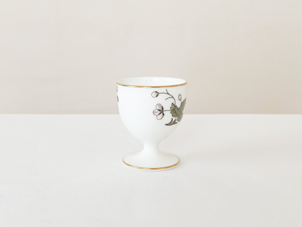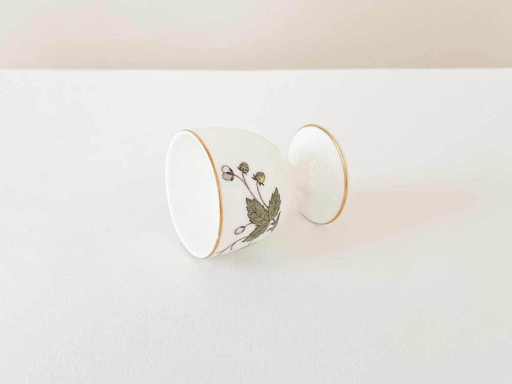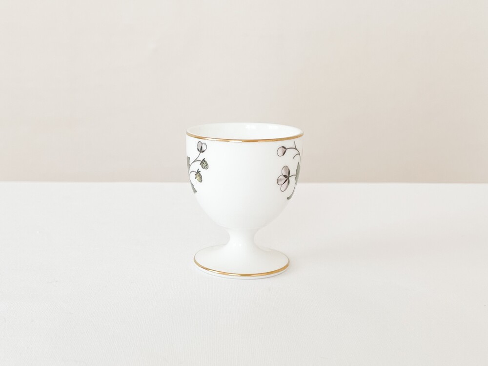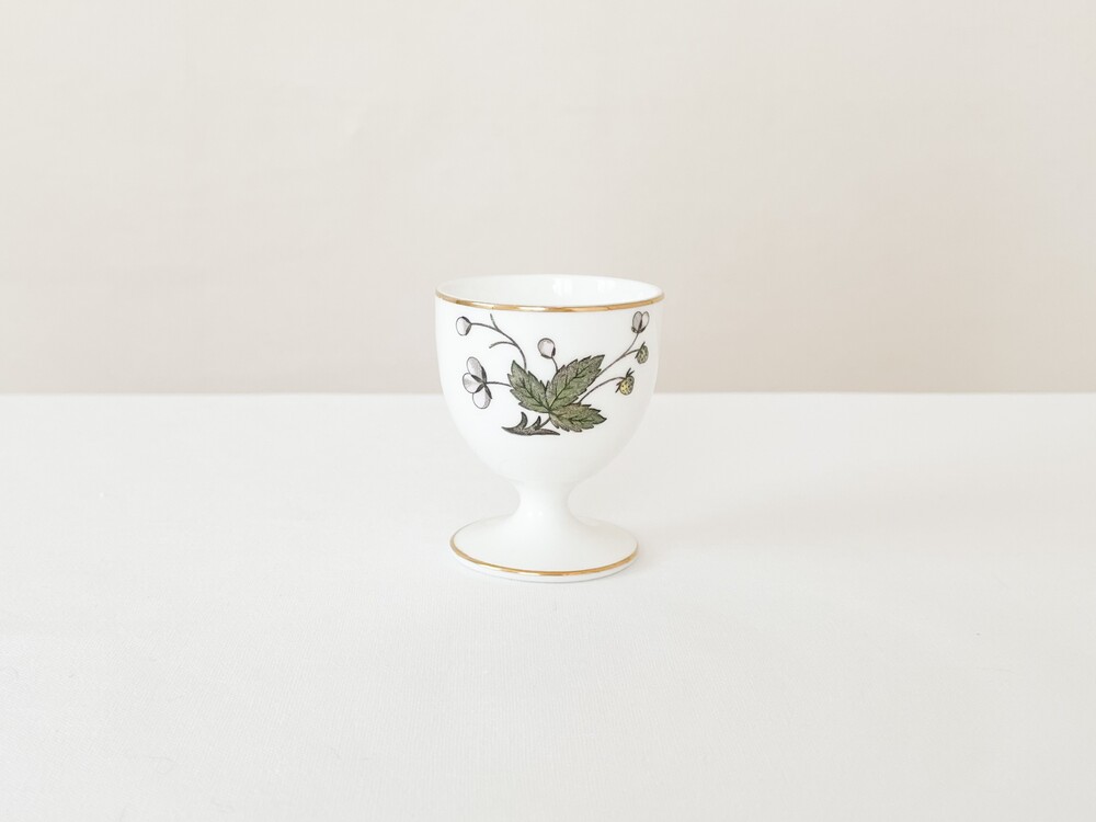 1960년대에 만들어진 웨지우드의 빈티지 에그컵입니다. 웨지우드는 1759년 부터 영국의 버슬램지역에서 도자기를 만들어온 브랜드입니다. 고급 티웨어와 식기들, 그리고 도자기 장식품들을 만들며 가치를 쌓아오는 웨지우드는 1760년대 부터 왕실에서 사용하는 도자기를 제작하게 되기도 합니다. 섬세한 디자인과 좋은 품질의 도자기를 꾸준히 만들어내며, 영국을 비롯한 도자기라는 카테고리를 대표하는 브랜드로 자리잡게 됩니다. 소개해드리는 제품은, 웨지우드 고유의 화사하고 고운결의 크림색의 본차이나를 소재로합니다. 소개해드리는 제품은 1950년대 후반에서 1960년대 초반에 만들어진 것으로, 오목하고 둥근 보울과 낮고 매끄러운 곡선의 스템-베이스로 모양을 이루고 있습니다. 컵의 겉면에는 낮은채도의 색들로 섬세하게 표현된 딸기넝쿨과 단정하게 그려진 22k골드의 줄무늬가 보여집니다. 런던의 V&A와 디자인뮤지엄 등 권위있는 박물관들에 소장되고있는 시리즈로, 눈에 닿는 아름다움과 테이블웨어 로서 가지고있는 형식, 무늬를 표현하는 방법 등 여러 방향에서의 높은 가치를 담아내고 있는 제품입니다. 살랑이는 촉촉한 공기가 가득한 봄날의 한장면, 고전이 가질 수 있는 단단한 아름다움을 살펴 볼 수 있습니다. 부드러운 달걀을 담아내는 아침식탁의 그릇으로, 초를 켜거나 작은 장신구를 보관하는 그릇으로 사용하기에 잘 어울립니다.