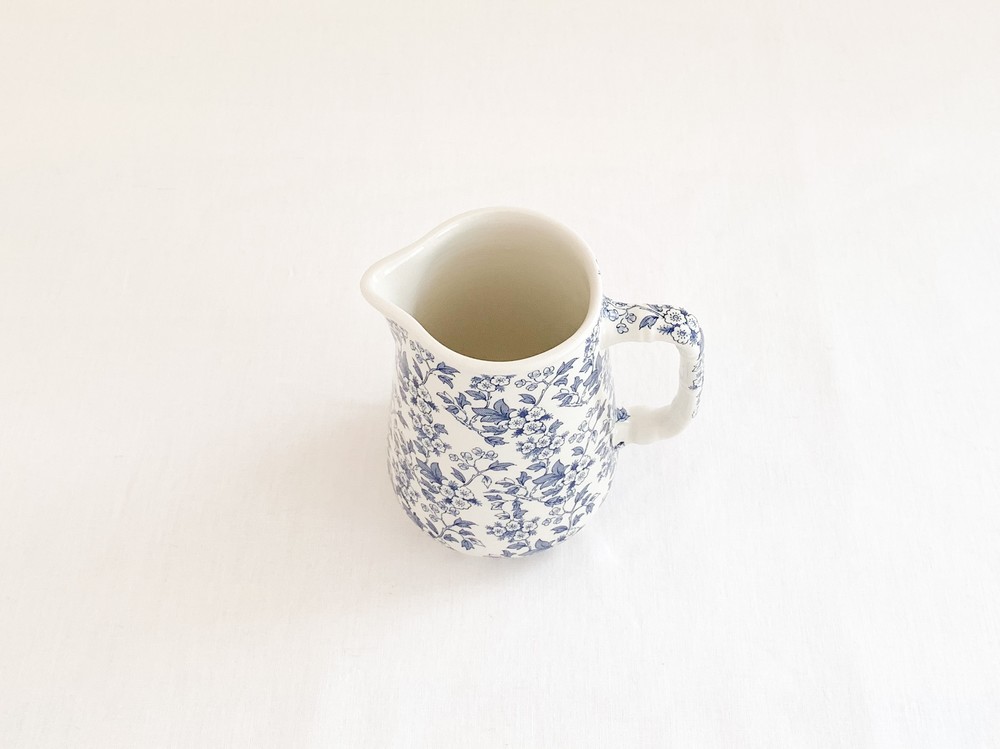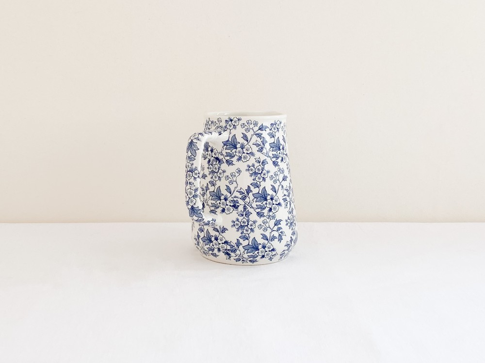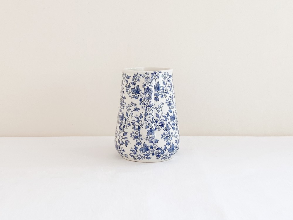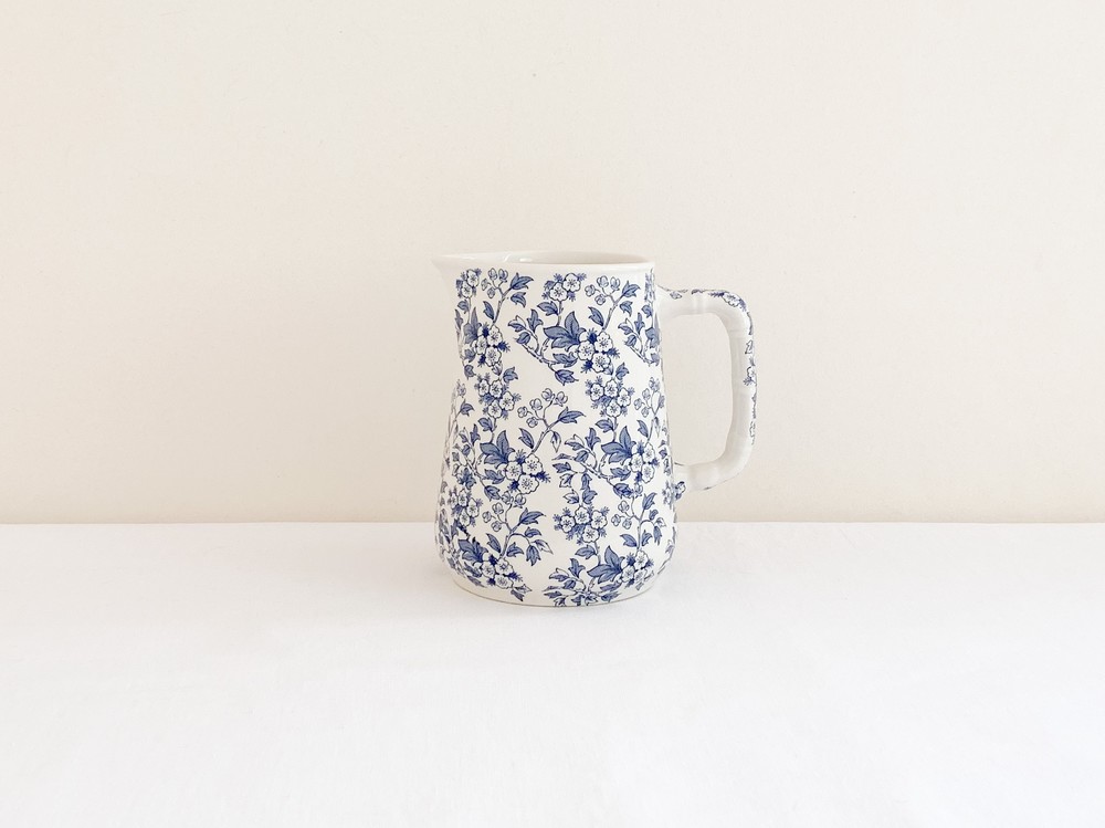 스태포드셔는 잉글랜드 중부내륙지방인 스태포드셔의 버슬렘지역에서 1894년부터 윌킨슨 가족에의해 만들어지기 시작한 도자기 브랜드입니다. 머지강에서 이어지는 운하의 항구 근처에서 운영되던 공방에서는 강을따라 운반되는 좋은품질의 진흙과 자연의 재료들을 이용해 스톤웨어와 포슬린, 본차이나 테이블웨어를 만들어냈습니다. 정형화 되어있지 않고, 섬세하고 독창적인 디테일을 가진 도자기들을 만들어내는 로얄스태포드셔는 1916년에는 로얄컬리지 출신의 디자이너 클라리스 클리프가 아트디렉터로 일하게되며 전성기를 맞이하게 됩니다. 이후 런던 메이페어의 고급상점들과 헤롯백화점과 성공적인 협업을 하며 artists in industry - modern art for the table이라는 훌륭한 정체성을 더욱 확고히 하며, 전통적인 제작방식은 이어가지만 결과물에 있어서는 어느 시대적 배경에도 방해 받지 않는 테이블웨어를 만들었습니다. 소개해드리는 제품은 1958년의 것으로 전해지는 저그입니다. 도톰하고 단정한 선을 가지고 있으며, 섬세한 무늬를 표현 할 수 있는 트랜스퍼프린트를 사용하여 겉면에 잔잔한 꽃무늬를 입혀냈습니다. 선명한 푸른색의 꽃무늬는 바탕이 되는 밝은 크림색이 도자기와 아름다운 조화를 이루며, 밝고 보드라운 계절의 정서를 전해줍니다. 차나 주스를 담아내는 저그로, 단정한 색의 꽃이나 푸른 잎사귀를 담아두는 화병으로 사용하기에 잘 어울립니다.