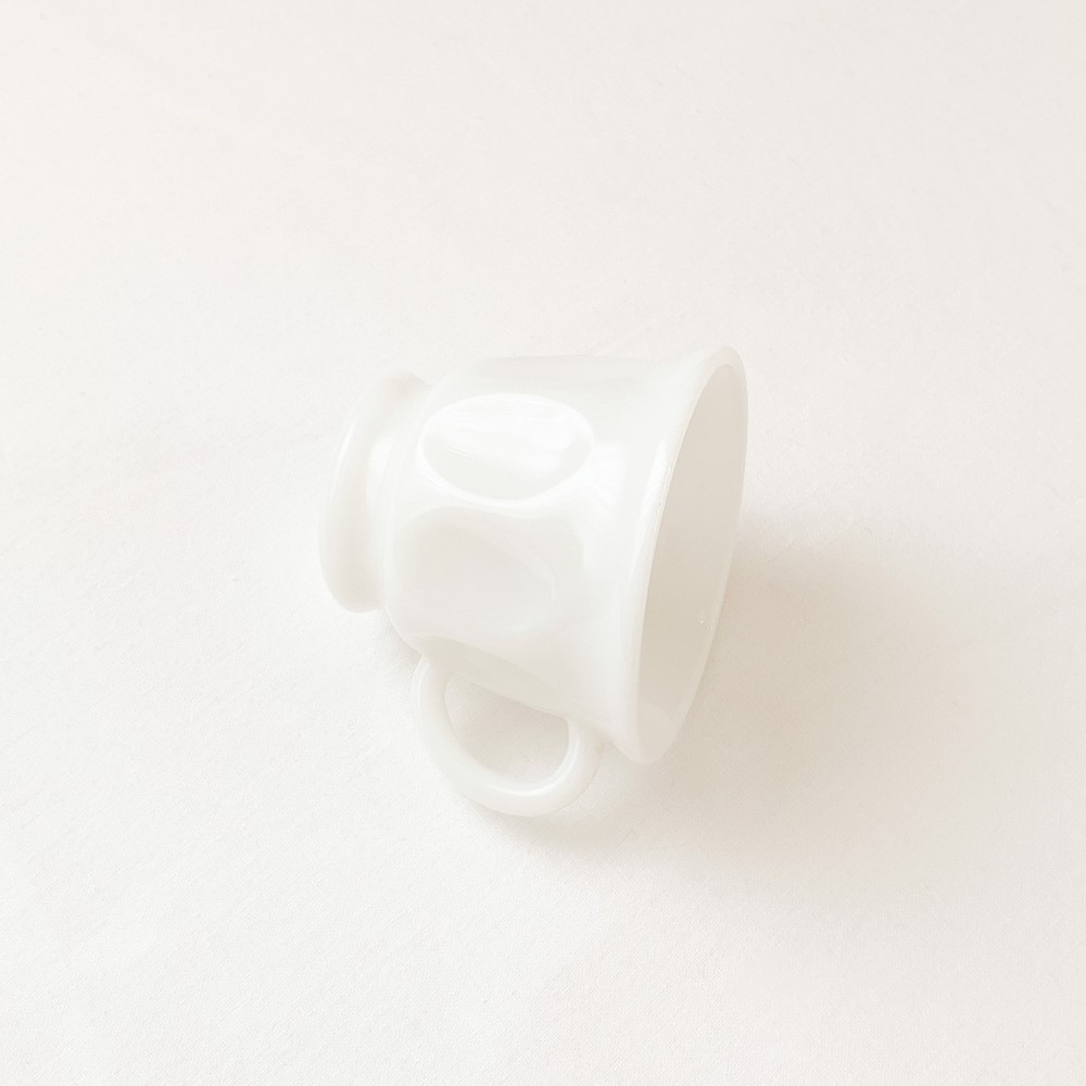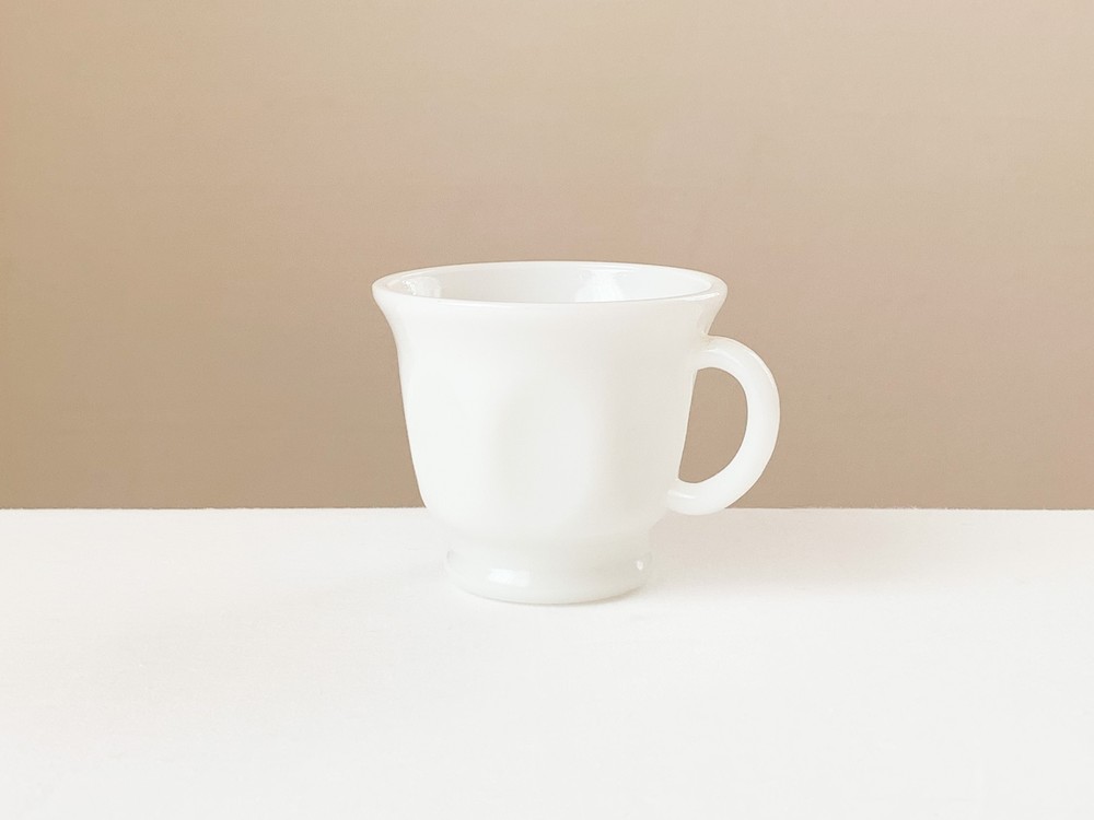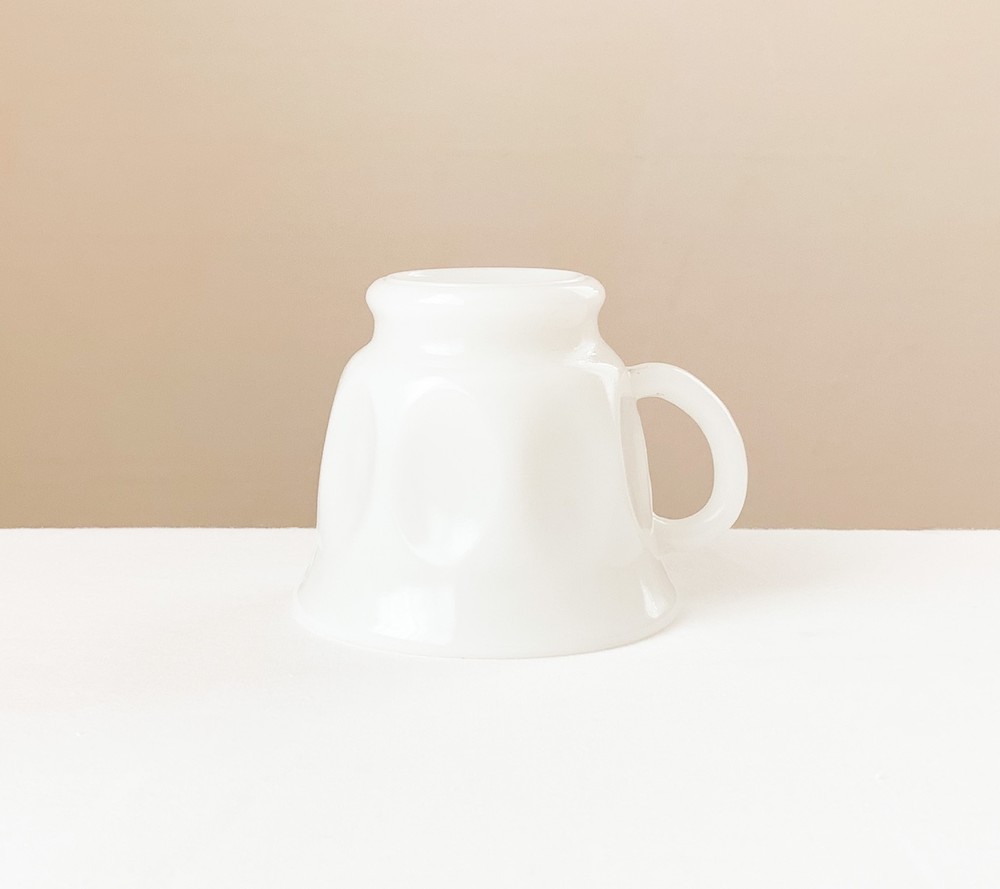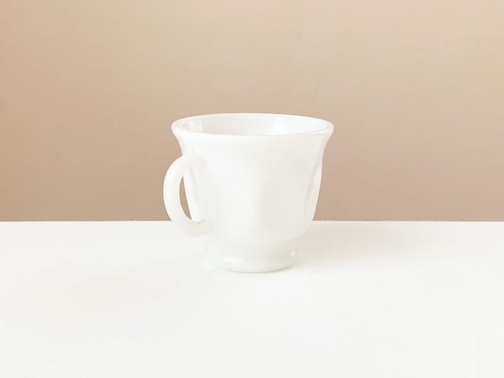 헤이즐 글라스컴퍼니의 밀크글라스 찻잔입니다. 헤이즐은 1800년대 후반 워싱턴에서 시작 된 브랜드 입니다. 몰드를 사용해 만드는, 고른 모양과 일정한 품질의- 집안에서 사용하는 메탈웨어와 글라스웨어를 주로 제작했습니다. 보편적인 소재, 편리함을 우선으로 고안 된 아름다운 모양으로 넓은 범위에서 큰 인기를 가졌으며- 한 번 만들어진 제품은 다시 만들지 않고, 시대의 구분이 명확하게 가능한 새로운 패턴을 만들어내는 부지런함은 당대에도 지금도 수집가들의 마음을 움직이기에 충분한 가치의 바탕이 됩니다. 소개해드리는 제품은 1960년대에 만들어진 찻잔입니다. 깨끗한 하얀색의 밀크글라스를 소재로 합니다. 위를향해 넓게 펼쳐진 잔의 가장자리, 잔의 겉면에 빙둘러 보여지는 오목한 장식, 도톰한 링모양의 베이스와 손잡이로 구성 되었습니다. 둥근 면들, 과감한 듯 섬세한 장식들과 함께- 환한빛들이 여러방향에서 포근히, 살며시 스며드는 밀크글라스 고유의 분위기가 무척 아름답게 보여집니다. 크림을 얹은 커피를 마시는 잔으로, 여름의 베리를 곁들여 아이스크림은 담아내는 디저트 그릇으로 사용하기에 잘 어울립니다.