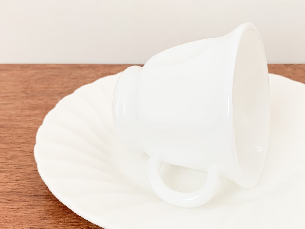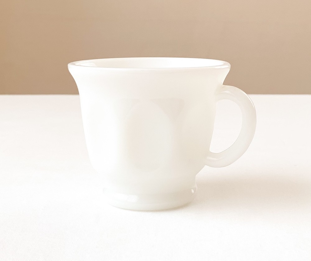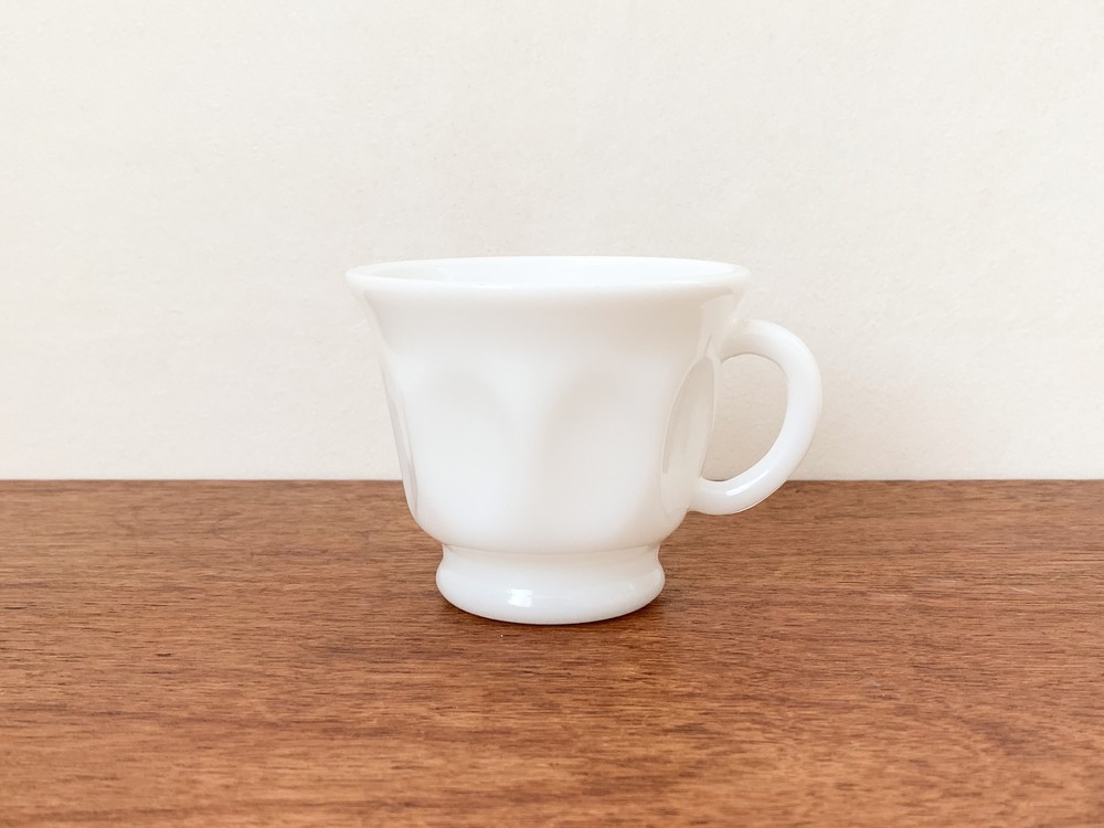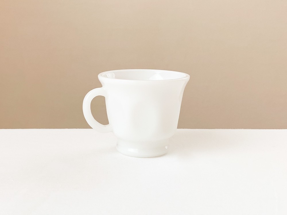 헤이즐 글라스컴퍼니의 밀크글라스 찻잔입니다. 헤이즐은 1800년대 후반 워싱턴에서 시작 된 브랜드 입니다. 몰드를 사용해 만드는, 고른 모양과 일정한 품질의- 집안에서 사용하는 메탈웨어와 글라스웨어를 주로 제작했습니다. 보편적인 소재, 편리함을 우선으로 고안 된 아름다운 모양으로 넓은 범위에서 큰 인기를 가졌으며- 한 번 만들어진 제품은 다시 만들지 않고, 시대의 구분이 명확하게 가능한 새로운 패턴을 만들어내는 부지런함은 당대에도 지금도 수집가들의 마음을 움직이기에 충분한 가치의 바탕이 됩니다. 소개해드리는 제품은 1960년대에 만들어진 찻잔입니다. 깨끗한 하얀색의 밀크글라스를 소재로 합니다. 위를향해 넓게 펼쳐진 잔의 가장자리, 잔의 겉면에 빙둘러 보여지는 오목한 장식, 도톰한 링모양의 베이스와 손잡이로 구성 되었습니다. 둥근 면들, 과감한 듯 섬세한 장식들과 함께- 환한빛들이 여러방향에서 포근히, 살며시 스며드는 밀크글라스 고유의 분위기가 무척 아름답게 보여집니다. 크림을 얹은 커피를 마시는 잔으로, 여름의 베리를 곁들여 아이스크림은 담아내는 디저트 그릇으로 사용하기에 잘 어울립니다.
