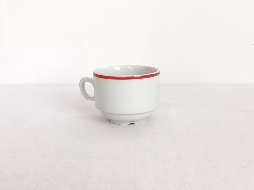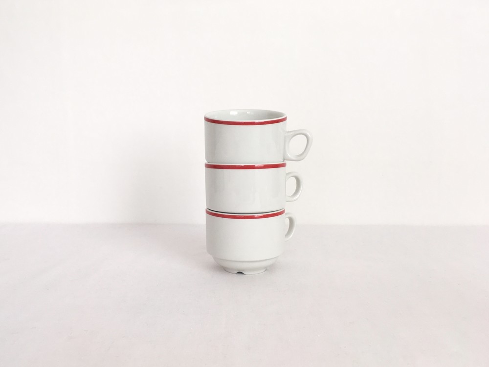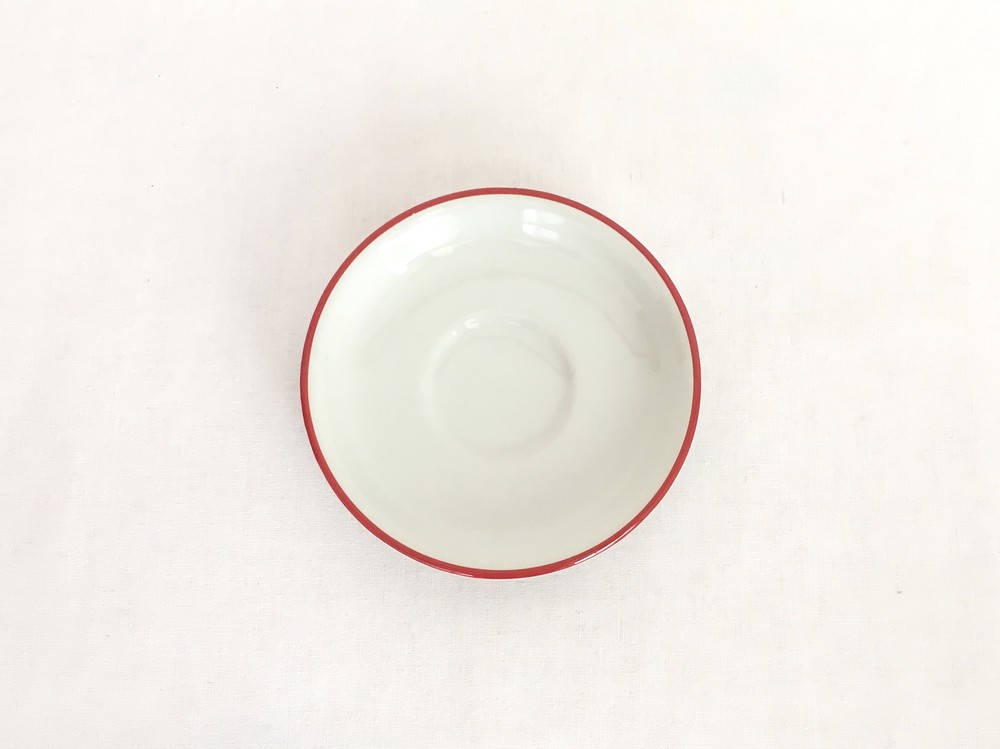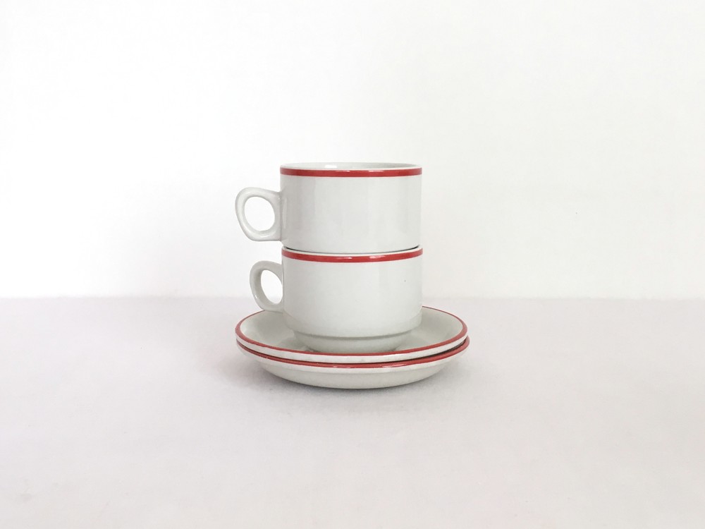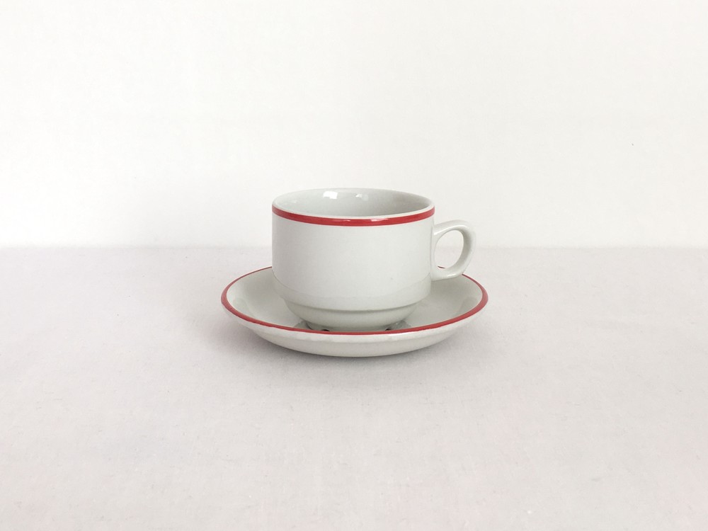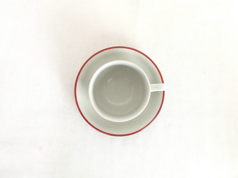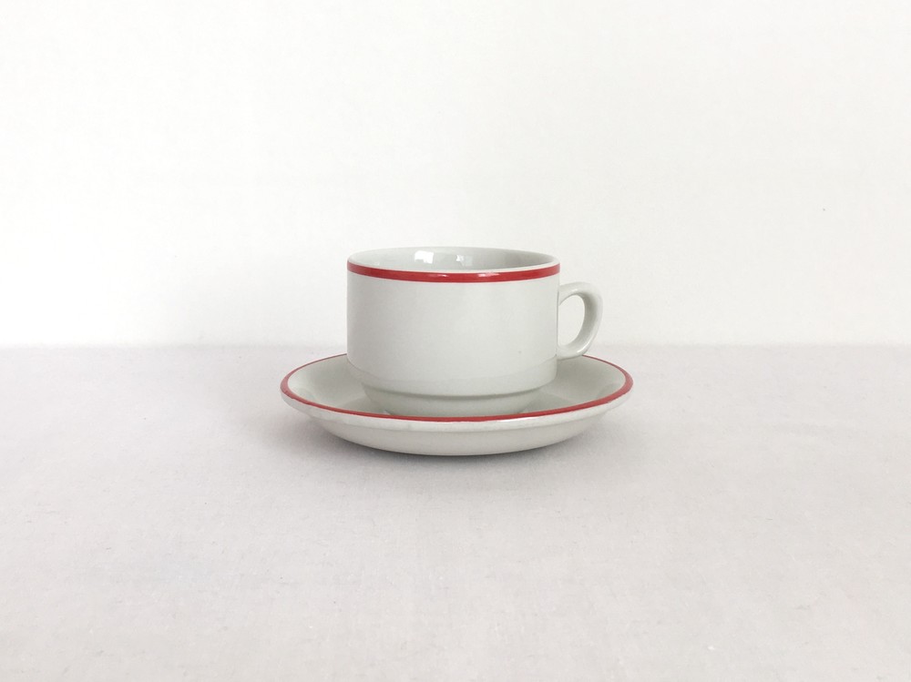 브리짓우드는 1795년 영국 도자기의 중심지인 스토크온트렌트의 롱턴지역에서 스톤웨어를 주된 소재로한, 보편적으로 사용될 수 있는 테이블웨어를 만들었던 브랜드입니다. 영국적인 색감의 사용과 약간의 비정제된 모습안에 단정함이 깃든 묵직한 분위기의 도자기들로 명성을 쌓아가며 점차적으로 브랜드가 확장되지만, 스튜디오 규모의 생산을 유지하며 마스터의 감각을 온전히 담아내는 제품을 꾸준히 제작했습니다. 유앤웬즈데이에서 종종 소개해드리고있기도 하며, 브리짓우드와 동시대에 설립된- 실용성에 초첨을 둔 대표적인 영국 테이블웨어인 처칠의 방향성에도 많은 영향을 준 브랜드이기도 합니다. 소개해드리는 찻잔세트는 1960년대 초반에 제작된 것으로, 깨끗하고 부드러운 빛을 띈 하얀색의 스톤웨어를 소재로 합니다. 반듯하고 단순한 선과, 손에 잡기 편한- 섬세한 각들로 만들어진 손잡이, 정리정돈을 위한 바닥면의 스태킹스탠드(켜켜이 쌓아질 수 있는 굽 모양) 가 보여지는 찻잔과, 도톰한 두께의 넓직하게 펼쳐진 동그라미의 잔받침으로 구성된 제품입니다. 잔과 잔받침의 가장자리에는, 밝은 햇빛을 가득 머금은듯한 사과의 색을 닮은- 선명한 빨강의 줄무늬가 그려져있습니다. 밝고 경쾌한- 말끔한 모습을 전해주는 찻잔세트입니다. 촘촘한 거품을 올린 따뜻한 라테 또는 핫초콜렛을 담아 좋은 계절을 만끽하는 한 때를 보내는 잔으로 잘 어울리며, 우유를 담는 잔- 빵한조각을 구워내는 접시로 잔받침을 활용해 간단한 식사시간을 위한 그릇으로 사용하기에도 알맞습니다.