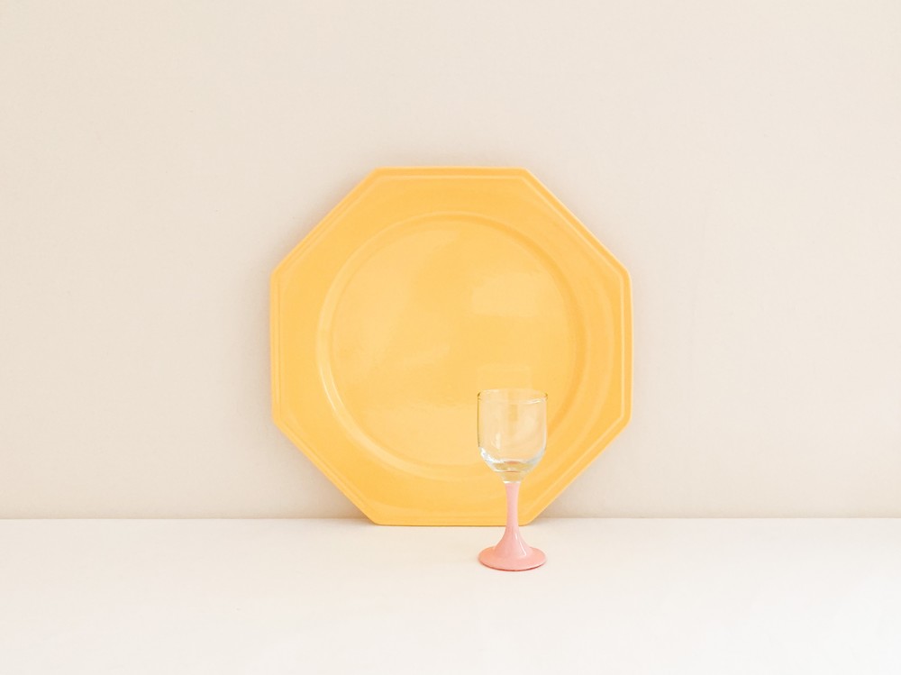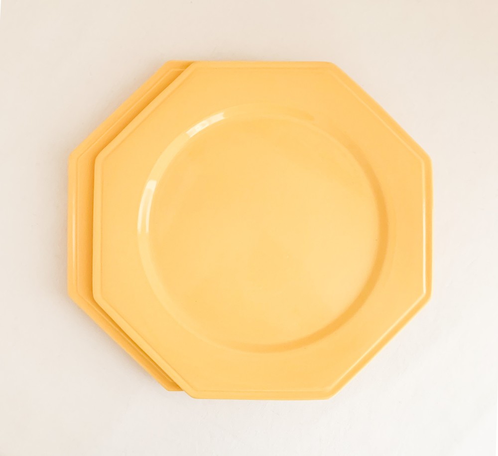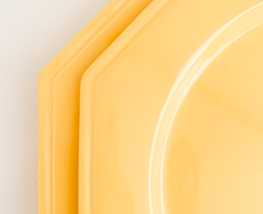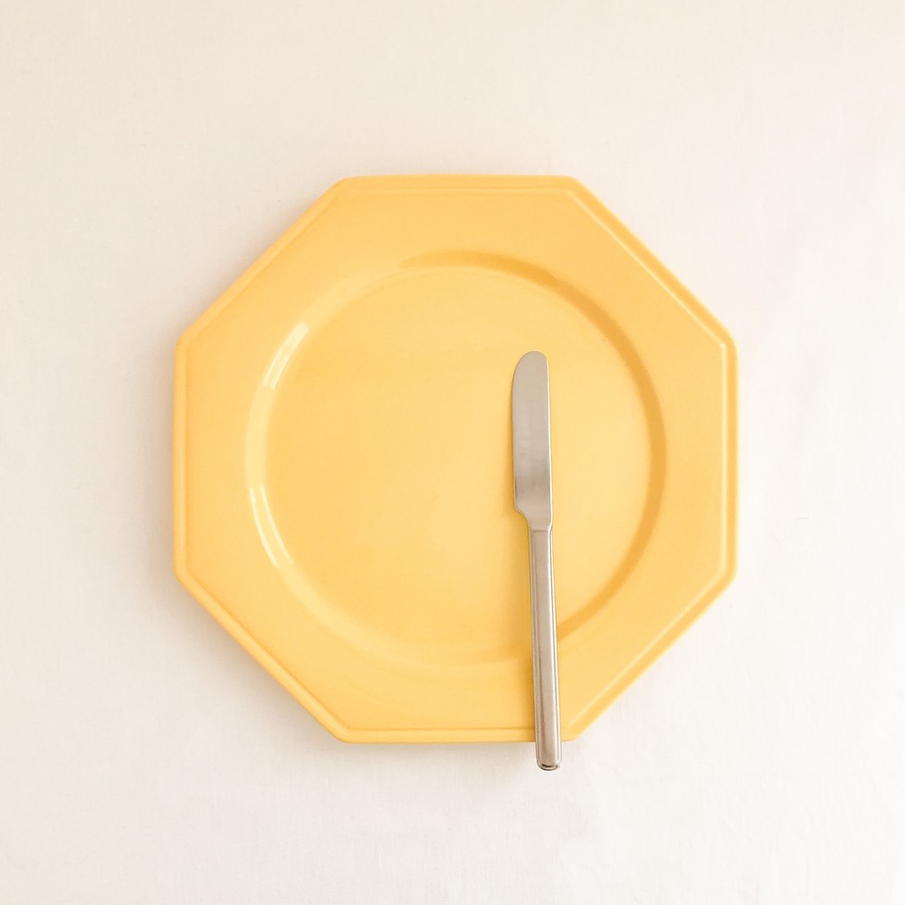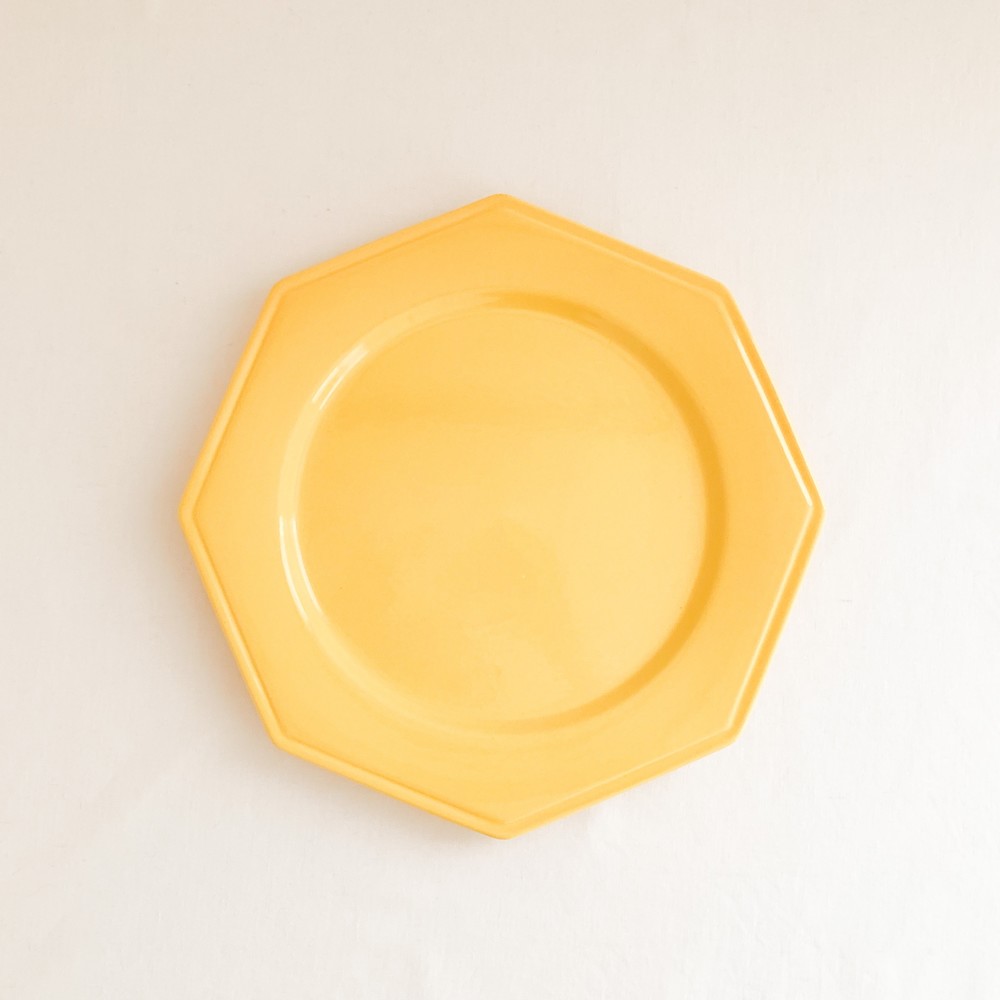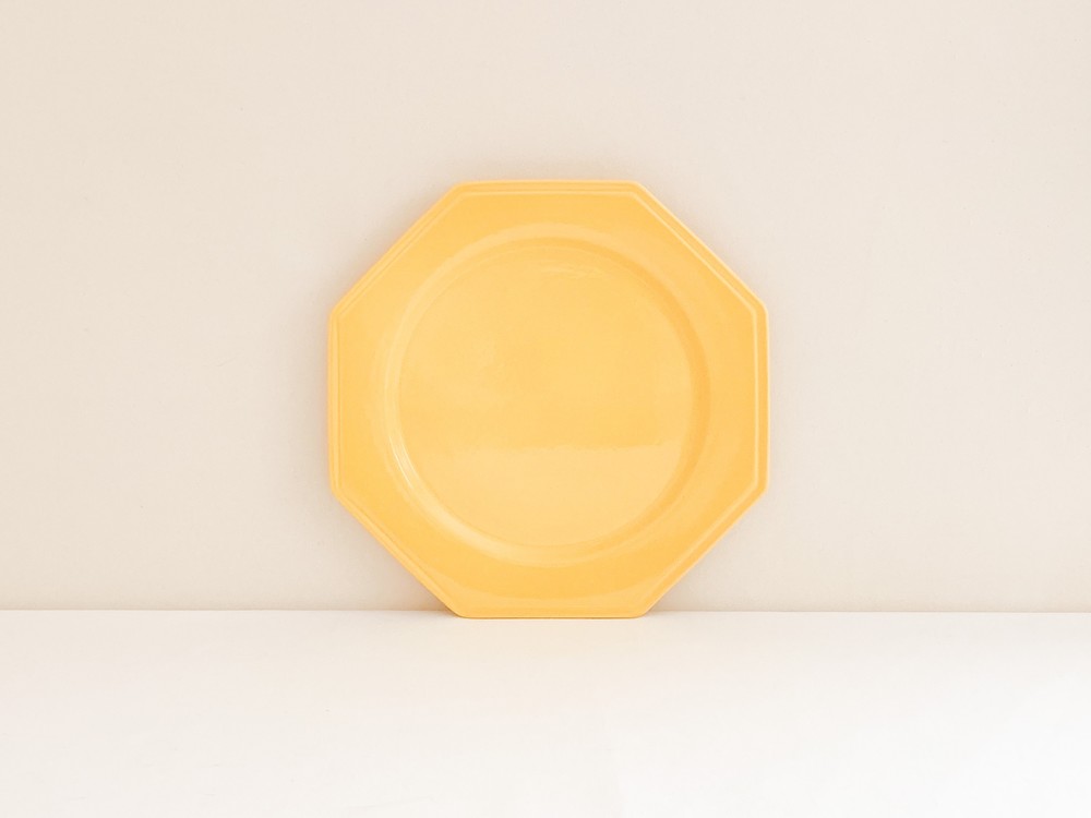 소개해드리는 제품은 1960년대에 만들어진 몰린샤롤르의 디너플레이트입니다. 샤롤르의 상징이라할 수 있는 팔각형의 접시는 두터운 포슬린을 소재로합니다. 접시의 겉면에 부드러운 흐름으로 입혀진 선명한 노랑은- 접시가 만들어질 60년대 당시의 단조로운듯 화사하며 경쾌한 분위기를 전해주며, 가운데에 보여지는 평평한 동그라미, 그 주변을 감싸는 반듯한 면들로 구성된 가장자리의 모습은 완벽에 가까운 균형을 보여줍니다. 느긋한 식사시간을 위한 넉넉한 그릇으로 , 작고 예쁜 테이블위의 물건들을 정돈하는 트레이로 사용하기에 잘 어울립니다.