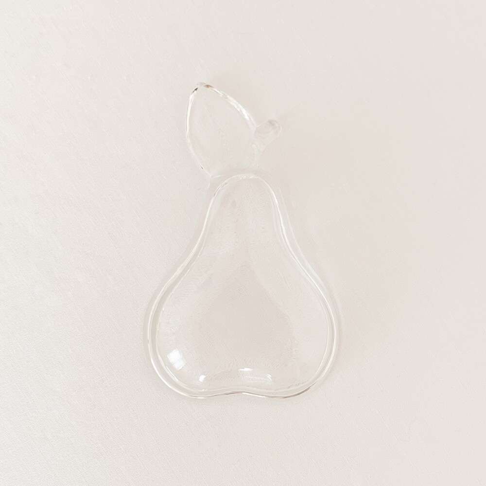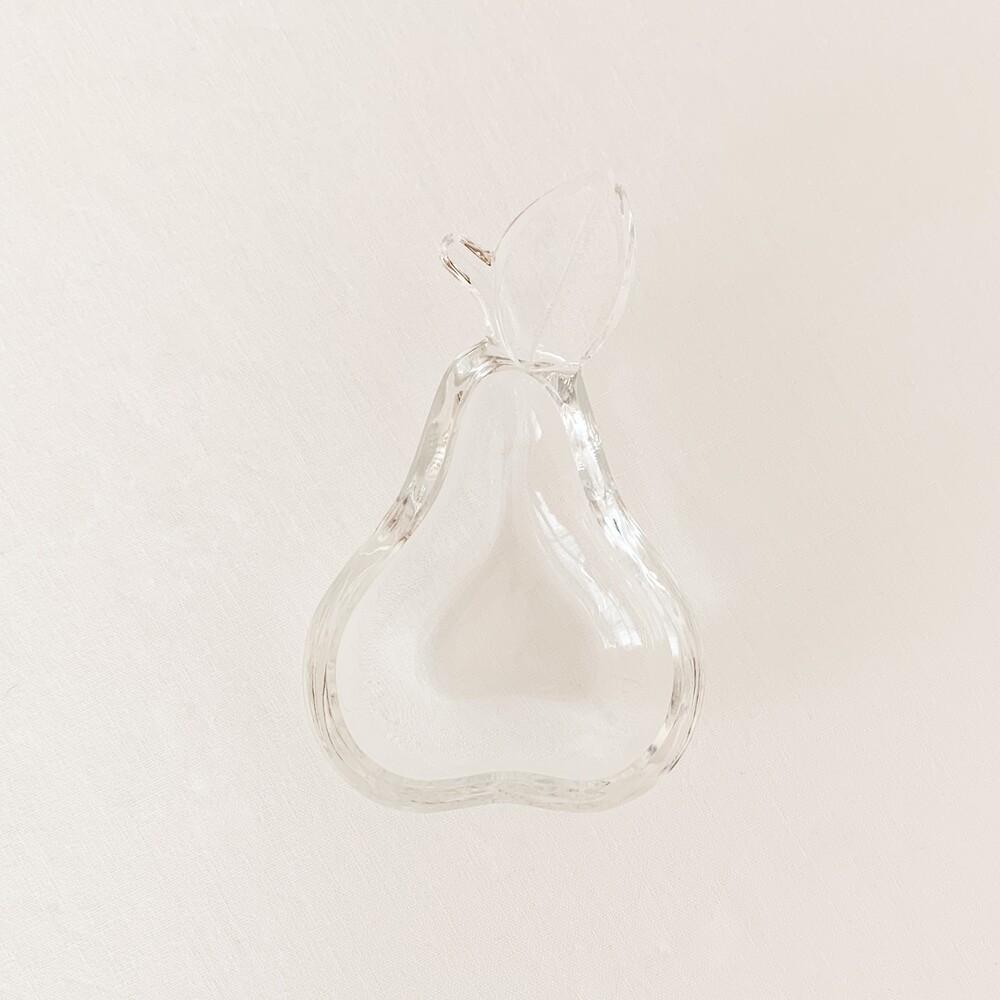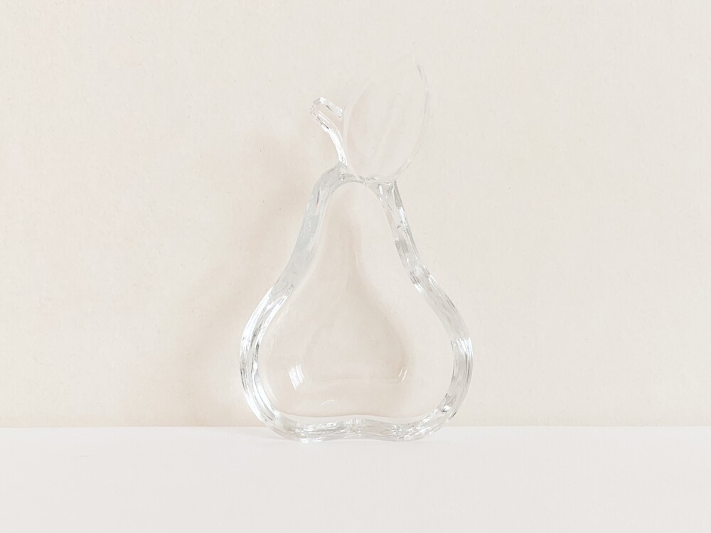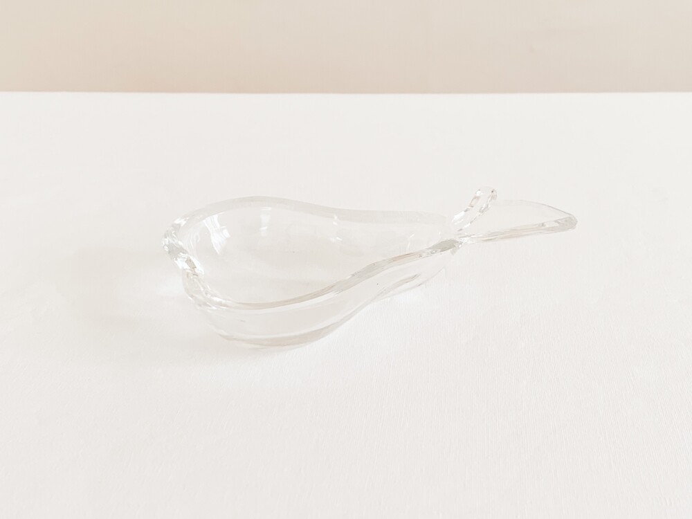 1960년대 영국에서 만들어진 빈티지 핀디쉬입니다. 세미크리스탈을 소재로, 서양배 모양을 모티브로 하여 만들어졌습니다. 유리의 안정감있는 질감과 크리스탈의 맑고 청아한 빛을 살펴볼 수 있습니다. 배의 열매는 오목한 접시가 되고, 스탬과 잎사귀는 귀여운 반짝임의 장식이 되었습니다. 접시의 둘레는 세 면의 컷팅을 더해- 반짝이는 소재 고유의 미감을 돋보이게 하고 실루엣을 단정하게 정돈했습니다. 소재와 표현이 만들어내는 보기좋은 리듬과 모티브가 가지고 있는 풍성한 분위기가 아름답게 어울립니다. 공간을 채워주는 빛나는 오브제로, 작은 물건들을 정돈하는 그릇으로 사용하기에 알맞습니다.
