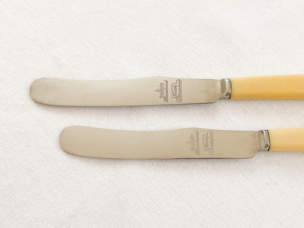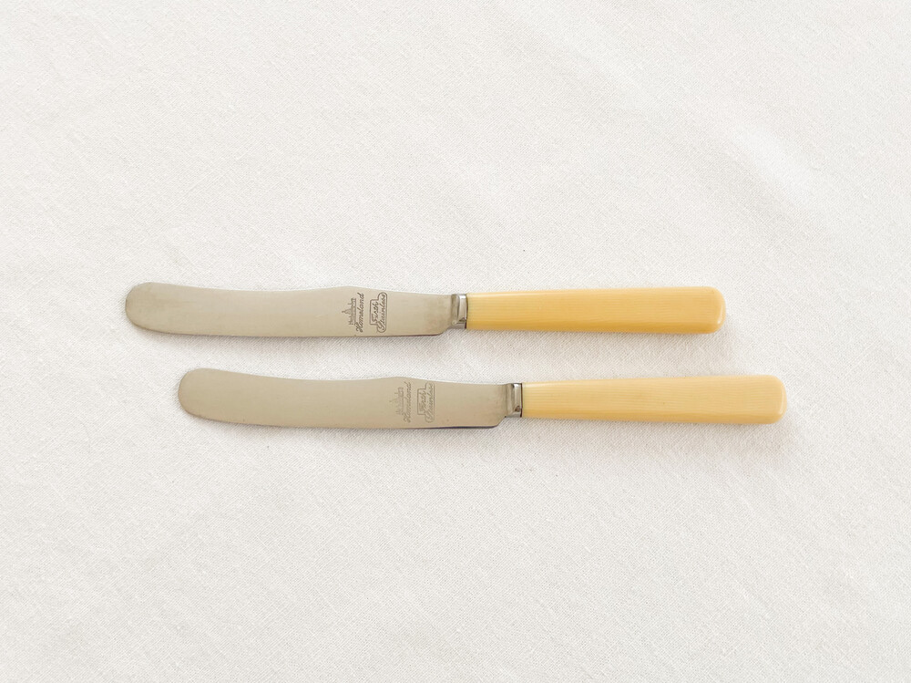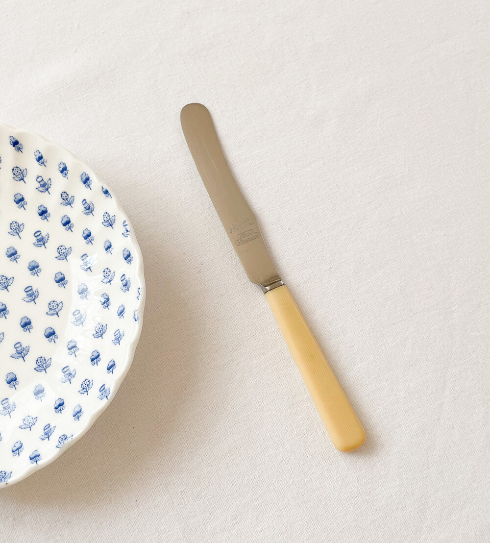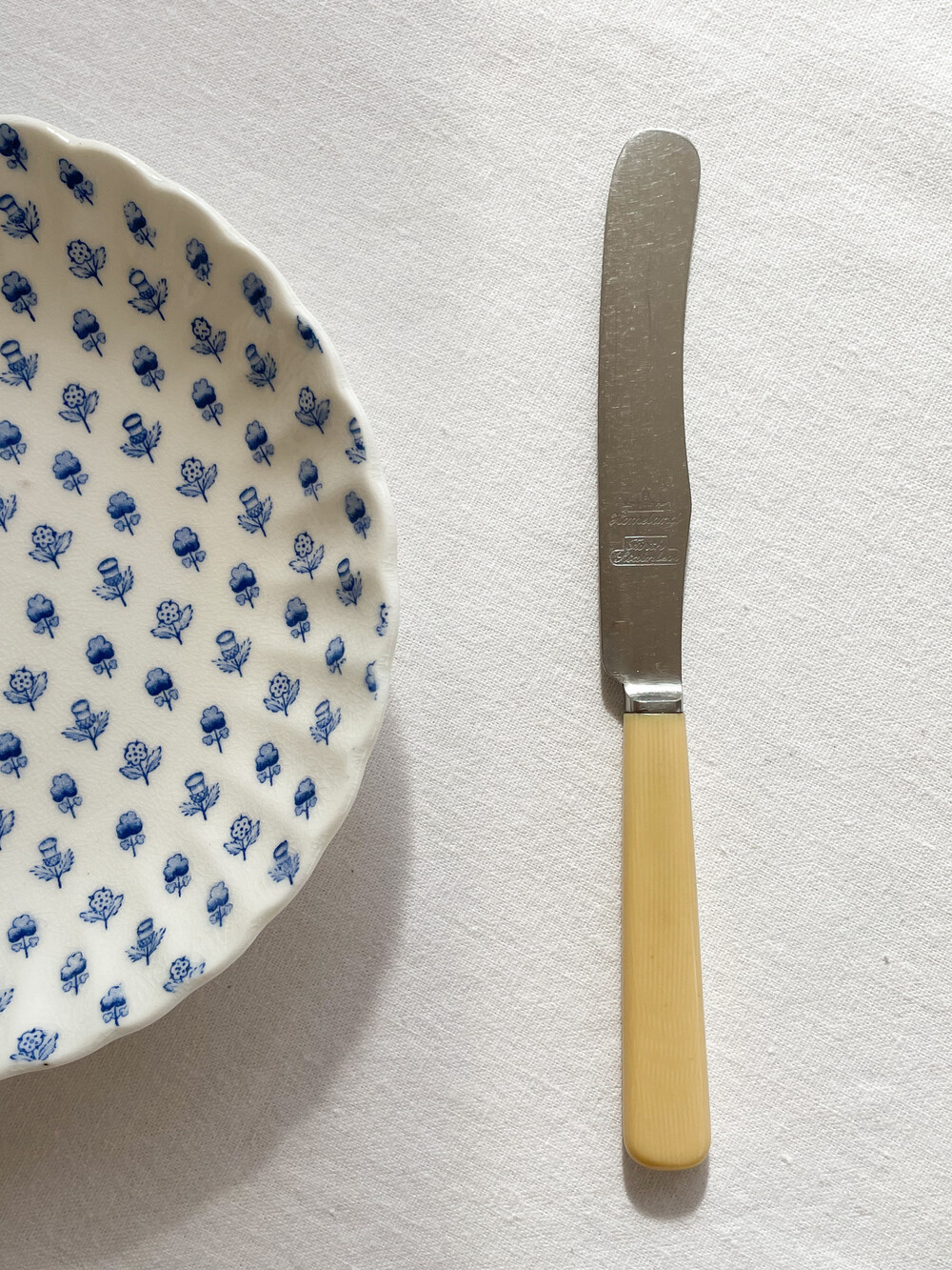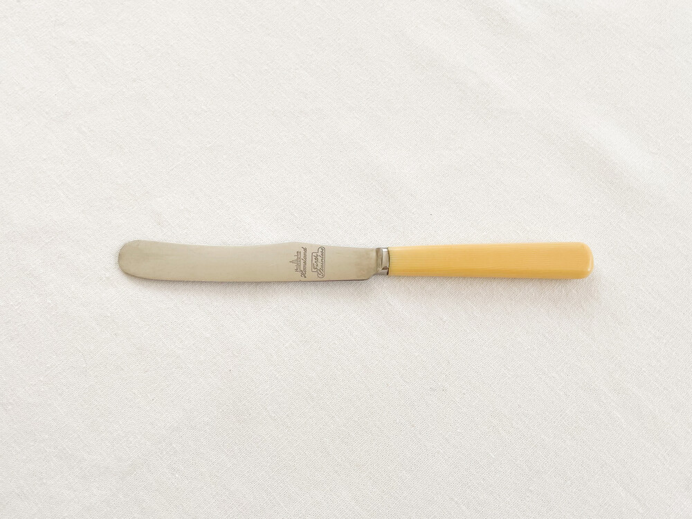 1960년대 초중반에 만들어진 퍼스스틸의 빈티지 나이프입니다. 퍼스스틸은 금속세공업이 발달한 영국의 셰필드지방에서 1902년부터 생활에 필요한 금속세공 제품을 만드는것을 시작했습니다. 설립자인 존 브라운은 제품을 구성하는 소재에대한 관심이 많았었고, 이러한 과심은 물건들의 쓰임새가 오래도록 유지 될 수 있는 소재를 연구하는 스튜디오의 설립으로 이어집니다. 퍼스스틸은 아름다운 빛과 내구성을 가진 소재들로 영국과 유럽의 다양한 계층들로 부터 큰 인기를 끌게됩니다. 소개해드리는 제품은 잼이나 버터를 바르는 용도의 나이프로, 따뜻한 색의 베이클라이트와 매끄러운 스테인리스스틸을 소재로 합니다. 나이프 날의 한쪽 면에는 소재와 게런티, 시리즈의 이름, 브랜드를 나타내는 글자가 새겨져 있습니다. 날의 윗 부분에 보여지는 둥근 곡선은, 잼이나 버터가 고르고 말끔하게 펼쳐질 수 있도록 만들어진 장치로- 단순하지만 섬세한, 실제의 쓰임새에 특별한 관심이 많았던 퍼스스틸의 특징이 보여집니다. 식탁의 가운데에 두는 잼&버터 나이프로, 티테이블의 과일이나 파이를 위한 나이프로 사용하기에 잘 어울립니다.