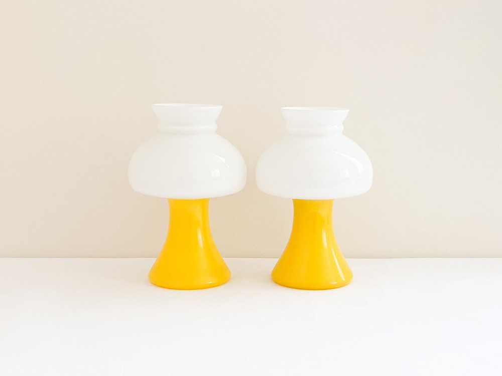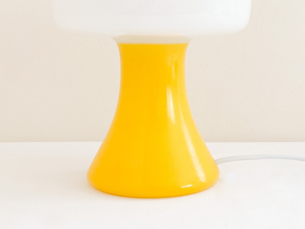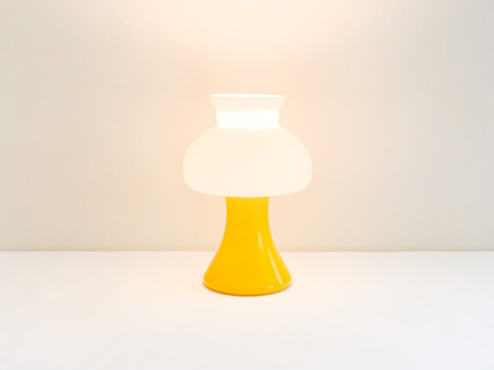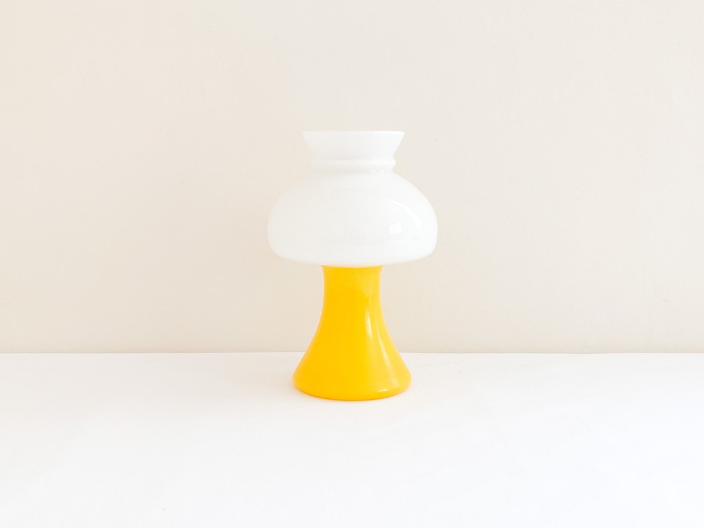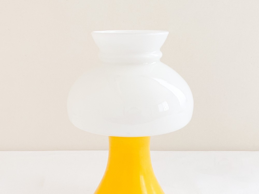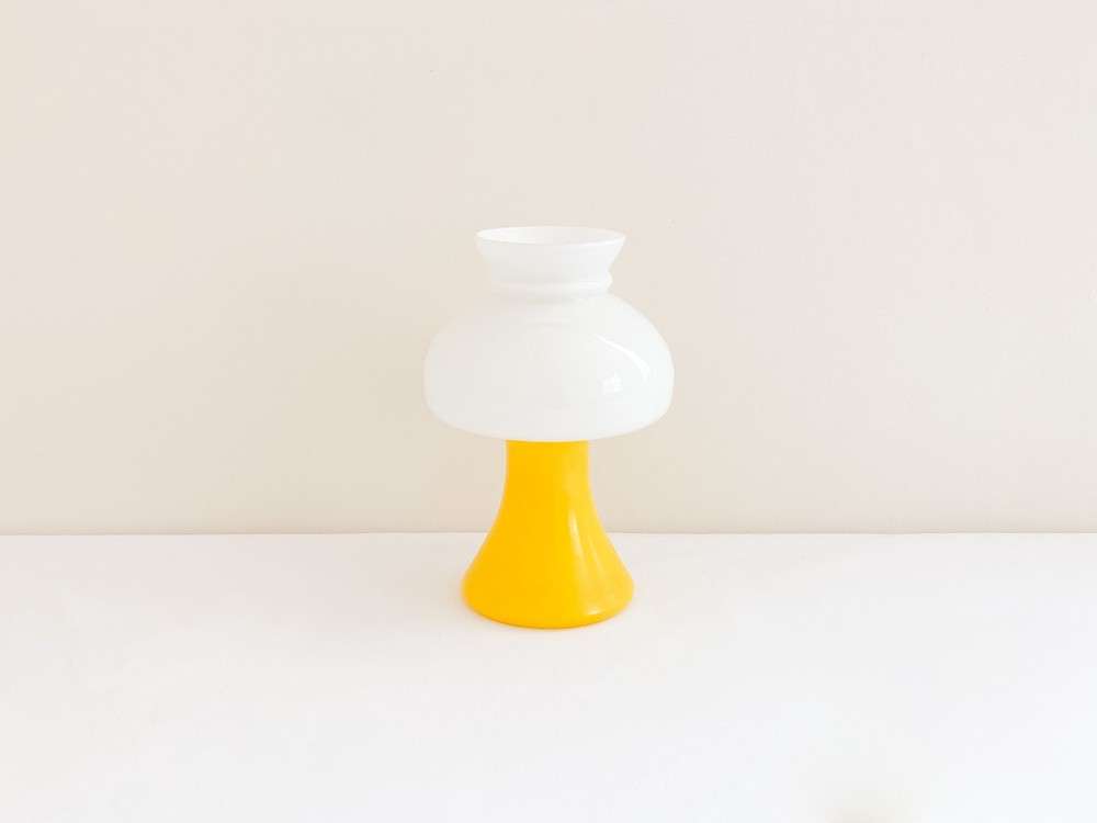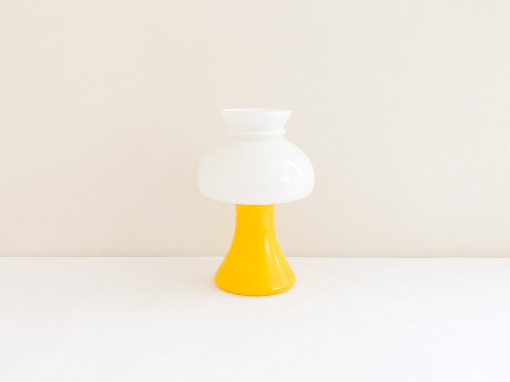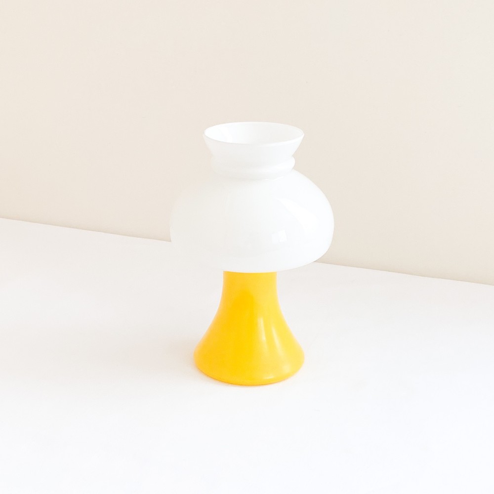 1960년대 프랑스에서 제작된 빈티지 유리램프입니다. 높은밀도와 묵직한 무게를 가진- 매끄러운 표면의 밀크글라스로 만들어진 제품입니다. 어느 공간에서든지 어울리기쉬운 실용적인 소재와 간결한 모양을 가지고있습니다. 둥글고 풍성한 셰이드, 완만한 곡선의 스템과 둥근 베이스이루어진 고전적인 테이블램프를 모티브로하며, 이음새가 없이 연결되는 하나의 선과 면들이 그려내는 아름다운 선들을 살펴 볼 수 있습니다. 밀크글라스 고유의 깨끗한 색감이 보여지는 하얗고 매끄러운 셰이드, 밝은 노랑의 유리질 안료가 고르게 입혀진 베이스로 구성되어있으며- 램프가 만들어질 60년대 당시의 밝고 위트있는 감수성이 전해집니다. 셰이드의 윗부분 가장자리에 살며시 봉긋한 모양으로 만들어진 리본을 두른듯한 장식에서는 프랜치 특유의 담담한 우아함이 발견되기도 합니다. 불을 켰을 때 램프전체에 은은하게 빛이 채워지는 모습으로- 침실이나 거실한켠에서 편안한 분위기로 사용하기에 잘 어울리며, 화사한 분위기를 채워주는 하나의 오브제로 두기에도 적당합니다.