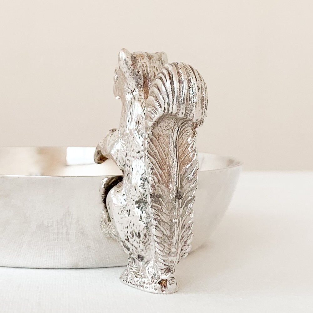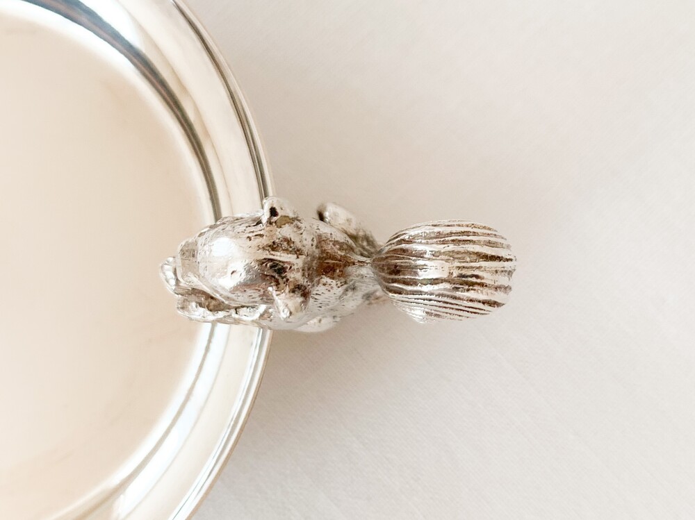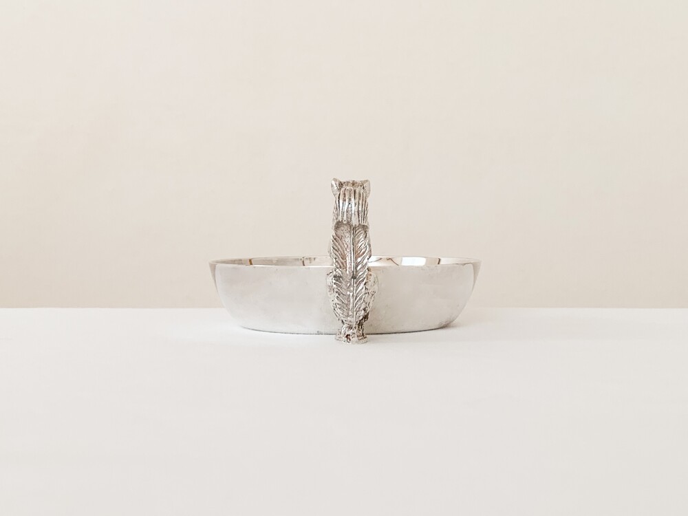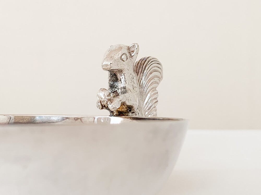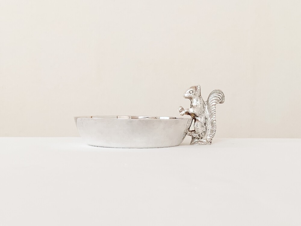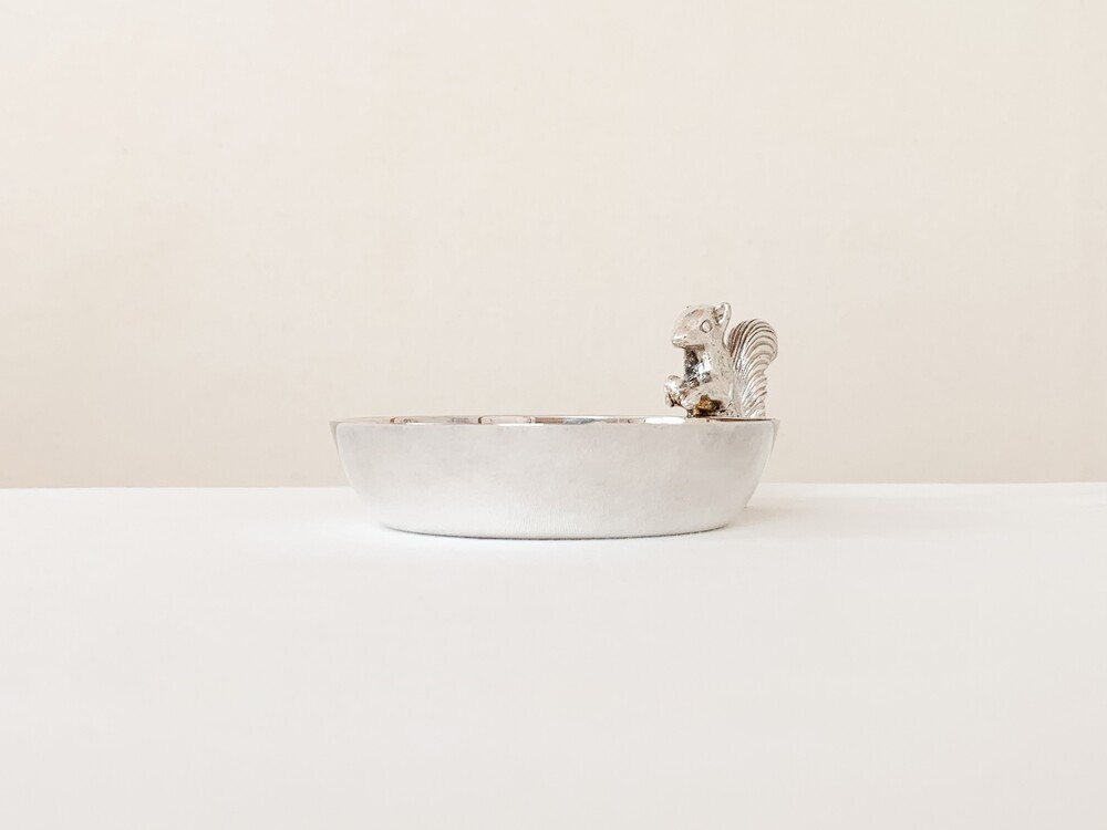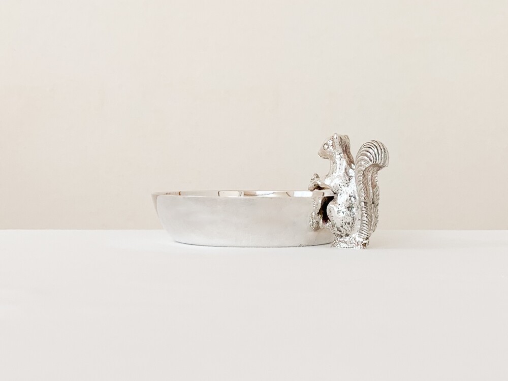해리슨브라더스의 너츠디쉬를, 1960년대 중반 즈음 바이너스에서 복각한 빈티지 제품입니다. 해리슨브라더스는 1808년부터 영국의 셰필드지역에서 해리슨가에의해 시작된, 은세공품을 제작했던 브랜드입니다. 커틀러리와 접시 또는 컵같은 테이블위에 꼭 필요한 물건들을 주로 만들었고- 실용적인 카테고리안에서 아주 장식적인 섬세함을 더해낸 디테일을 가진 제품들을 제작했습니다. 1900년대에 들어 해롯이나 메이페어의 수준높은 상점들을 위한 제품들을 제작하며 큰 명성을 얻게되었지만, 브랜드가 추구했던 수준의 품질을 유지하기위해 스튜디오규모의 제품제작을 유지하며 브랜드의 가치를 더욱 견고히합니다. 바이너스 또한 헤리슨브라더스가 공식적으로 복각을 허락할 만큼, 전통적인 방법과 동시대의 흐름의 알맞은 균형을 잘 맞추어가던 브랜드 입니다. 바이너스는 헤리슨브라더스와 이웃이라 할 수 있는 셰필드인근에서 1901년부터 시작 되었으며, 오랬동안 은세공품을 제작해 오던 실버스미스가문의 아돌프 바이너로부터 설립되었습니다. 소개해드리는 제품은 도토리를 들고있는 다람쥐모양의 손잡이로 장식된- 단정한 동그라미의접시입니다. 은관악기를 만드는데 사용되는 소재인 니켈실버위에 순은을 입힌- 실버플레이티드 제품이며, 영국적인 위트와 해리슨브라더스 고유의 섬세하고 우아한 분위기가 담겨있습니다. 환하고 고운 색감과 은은한 광택의 표면, 세심한 결로 다듬어진 다람쥐의 모습이 매우 아름답습니다. 본래의 용도에 맞춰 견과류나 초콜릿 같은 간식을 담아두는 그릇으로, 초를 켜거나 작은 오브제들을 올려두는 트레이로 사용하기에 잘 어울립니다.
