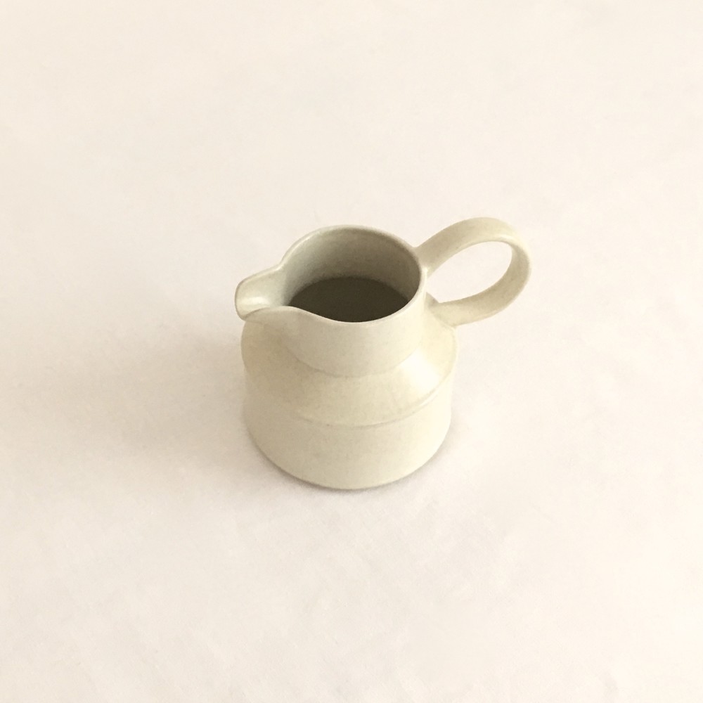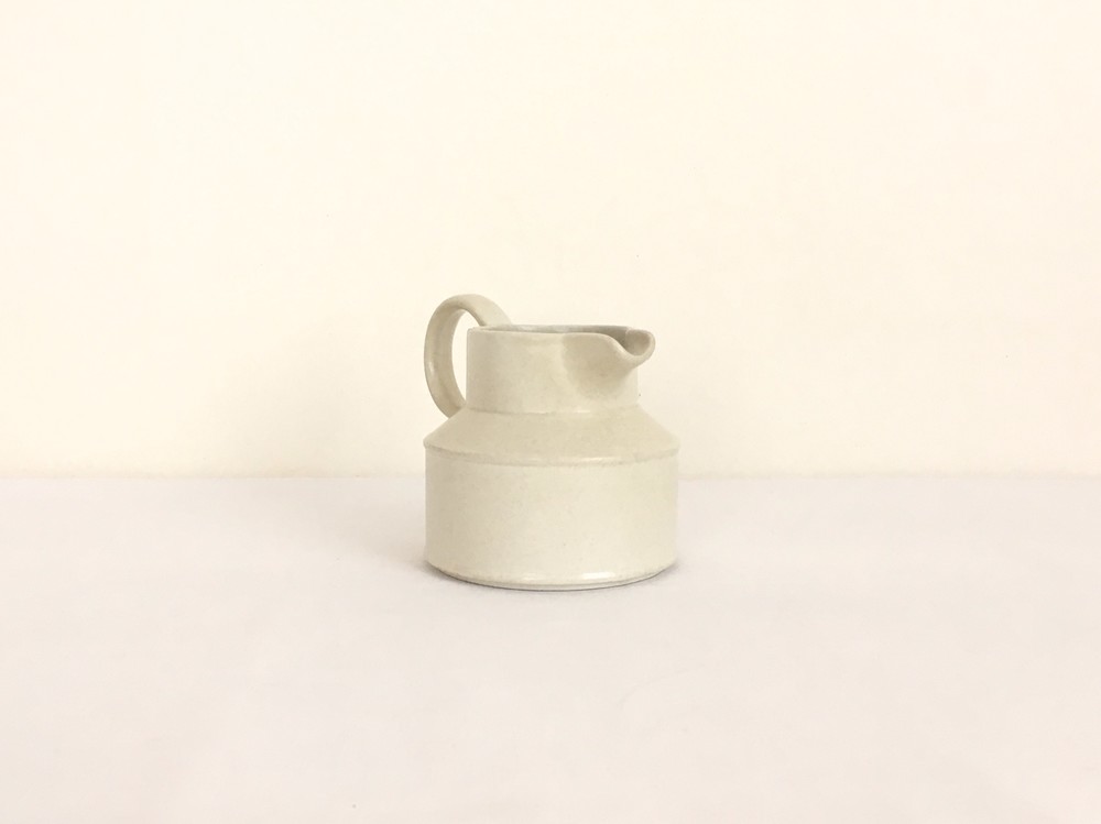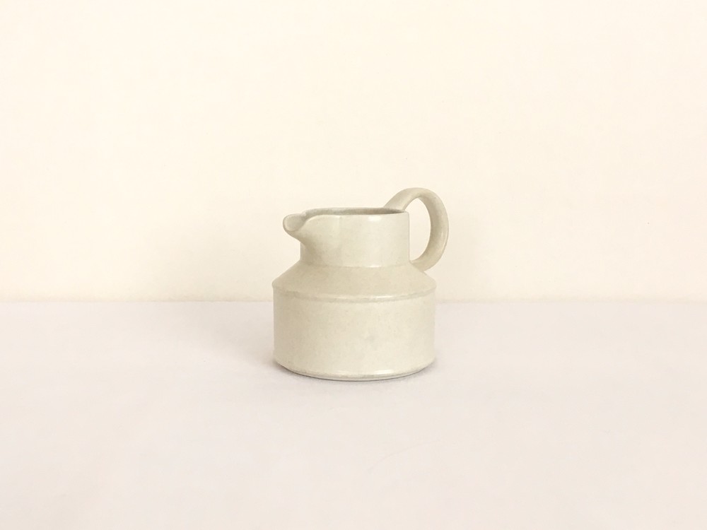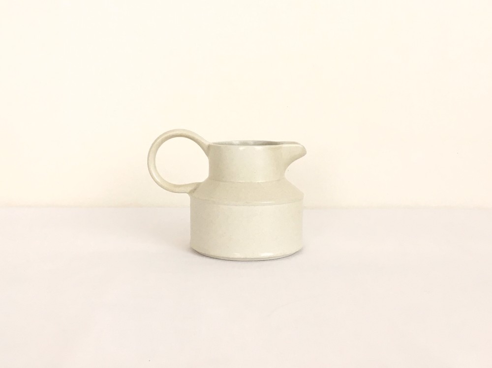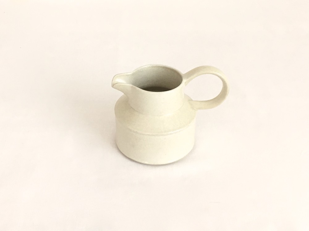 미드윈터는 잉글랜드 중부지방의 버슬렘지역에서 1910년에 부터 시작된 테이블웨어 브랜드입니다. 소개해드리는 밀크저그는 1960년대에 제작되었습니다. 크림색의 스톤웨어가 재료로 사용되었으며, 소재 자체에 스며들어있는 아주 작은 스파클링 무늬가 저그전체에 보여집니다. 부드럽고 단정한 선들이 돋보이는 저그는- 전체의 분위기와 잘 어울리는 엷고 잔잔한 광택의 유약이 겉면에 입혀져 있으며, 잘 정돈된 둥그런 면들이 만들어내는 레이어가 미드윈터 특유의 경쾌한 우아함과 편안한 분위기를 전해줍니다. 커피와 차에 곁들이는 크림이나 우유를 담아내는 저그로 사용하기에 알맞으며, 티팟 또는 몇송이 꽃을 담아 두는 화병으로도 사용하기에도 아주 잘 어울립니다.