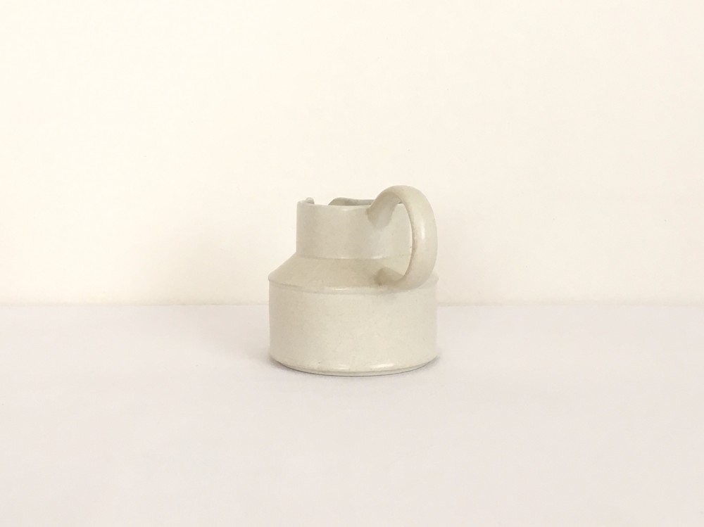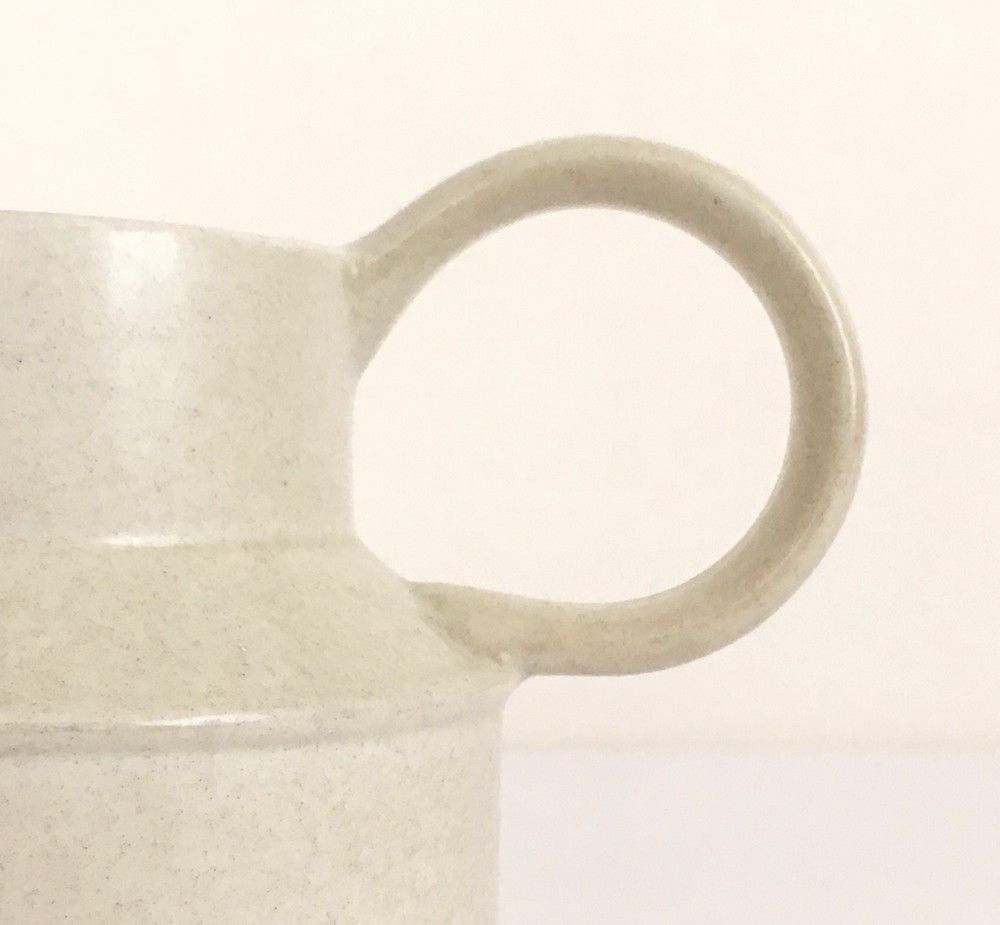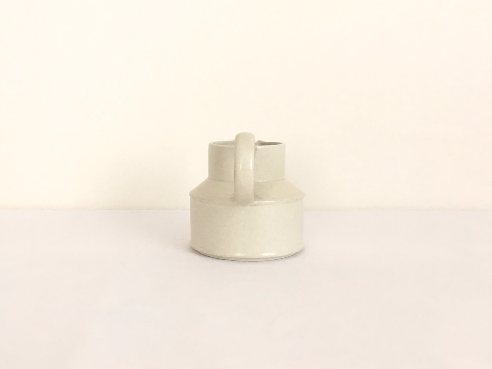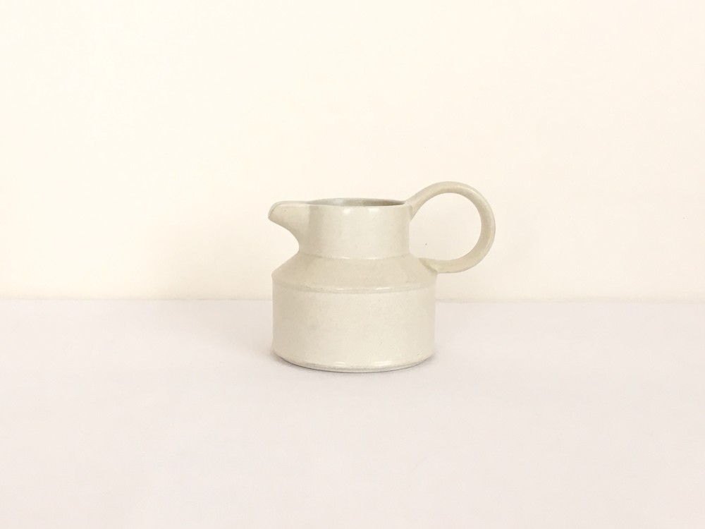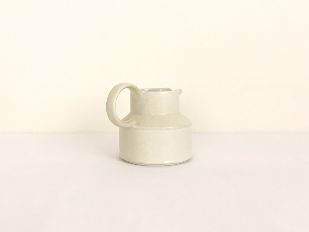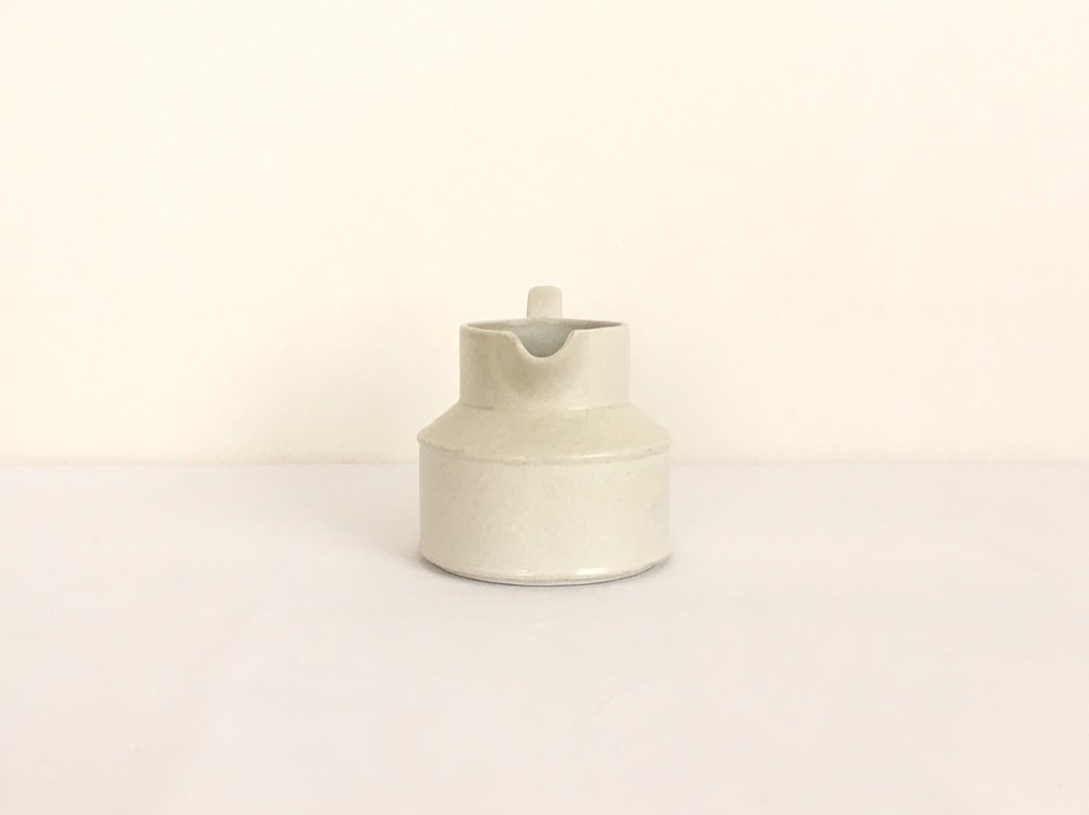 미드윈터는 잉글랜드 중부지방의 버슬렘지역에서 1910년에 부터 시작된 테이블웨어 브랜드입니다. 소개해드리는 밀크저그는 1960년대에 제작되었습니다. 크림색의 스톤웨어가 재료로 사용되었으며, 소재 자체에 스며들어있는 아주 작은 스파클링 무늬가 저그전체에 보여집니다. 부드럽고 단정한 선들이 돋보이는 저그는- 전체의 분위기와 잘 어울리는 엷고 잔잔한 광택의 유약이 겉면에 입혀져 있으며, 잘 정돈된 둥그런 면들이 만들어내는 레이어가 미드윈터 특유의 경쾌한 우아함과 편안한 분위기를 전해줍니다. 커피와 차에 곁들이는 크림이나 우유를 담아내는 저그로 사용하기에 알맞으며, 티팟 또는 몇송이 꽃을 담아 두는 화병으로도 사용하기에도 아주 잘 어울립니다.