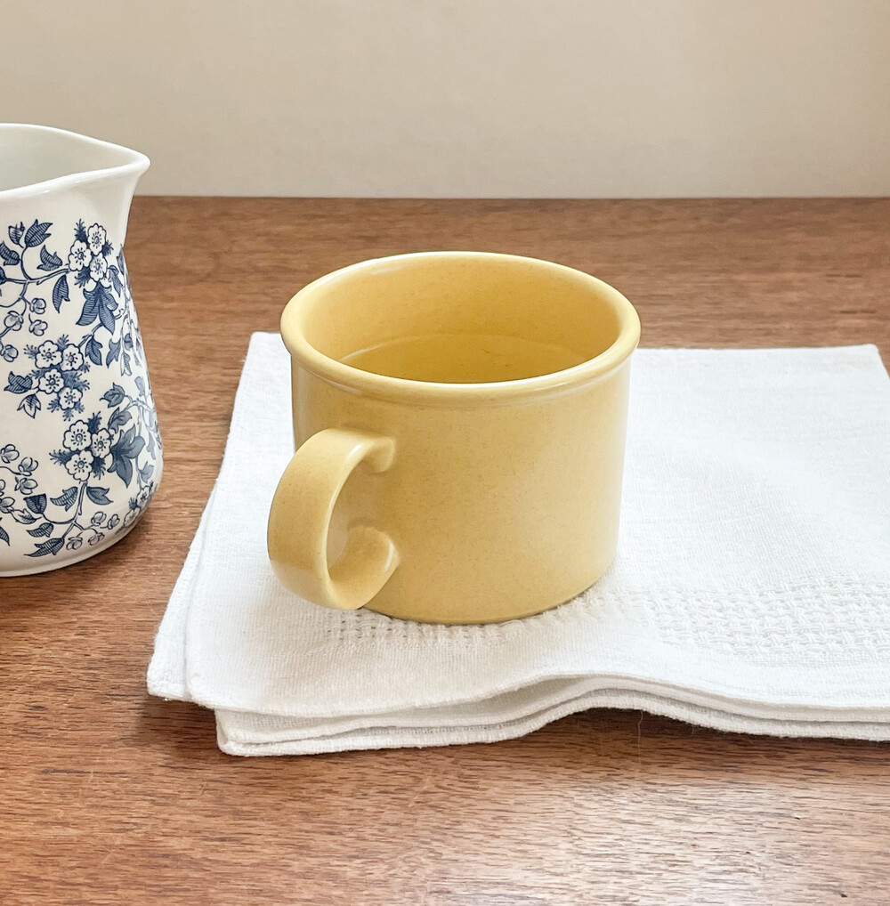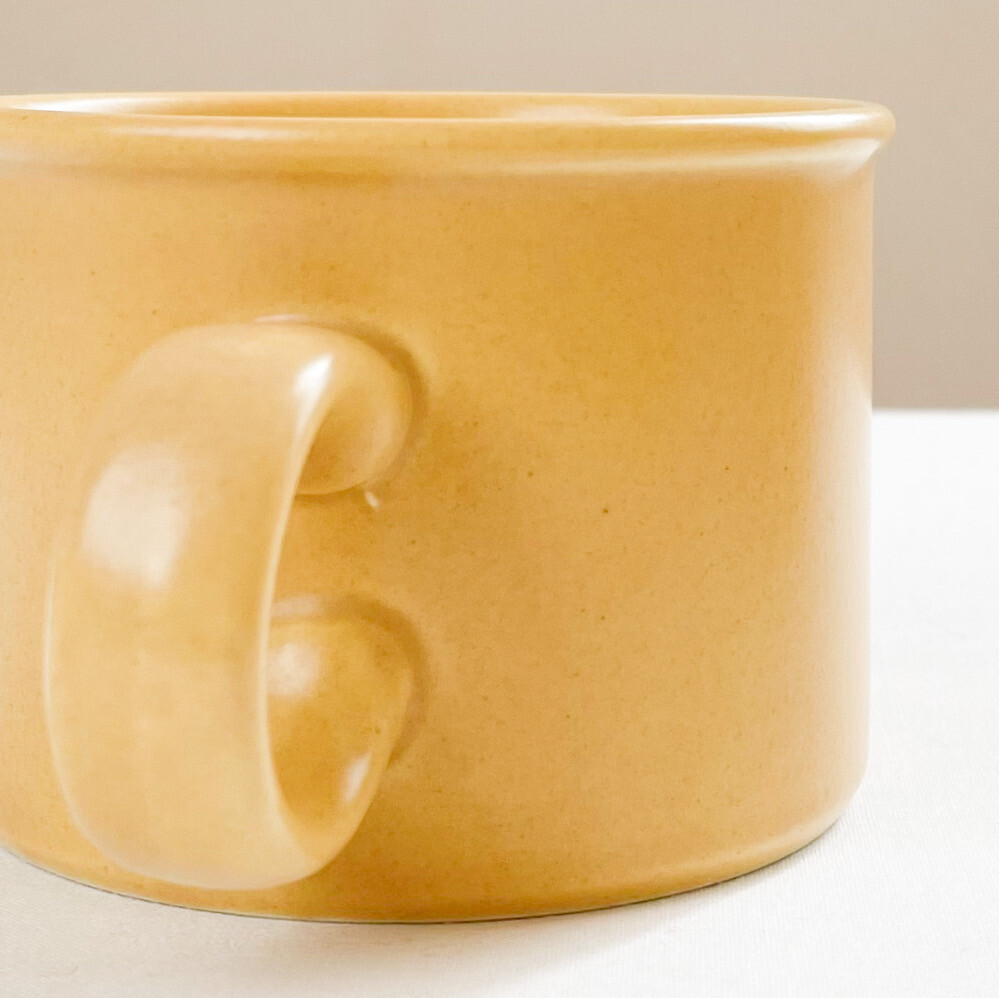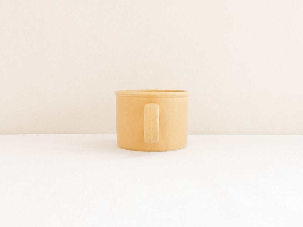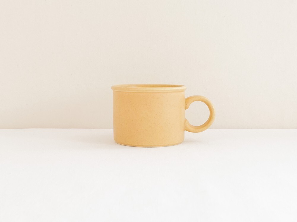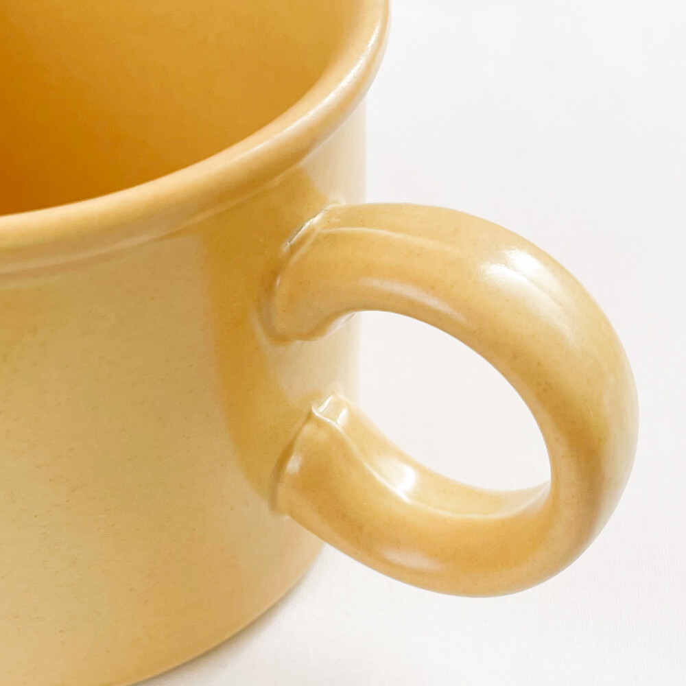 미드윈터는 잉글랜드 중부지방의 버슬렘지역에서 1910년에 부터 시작된, 그 당시의 세련된 트렌드를 이끌어 가던 테이블웨어 브랜드입니다. 소개해드리는 찻잔은 1960년대 후반에 생산 된 제품으로, 밝은 베이지색을 바탕으로 아주 작은 스페클 무늬가 나타난 스톤웨어를 소재로 만들어졌습니다. 동그란 손잡이가 귀여운 넓직한 크기의 찻잔의 겉면에는 환하고 차분한 머스터드색의 유약이 입혀져있으며- 잔받침에는 소재고유의 결이 잔잔하게 보여집니다. 따스한 색감들이 전해주는 편안하고 다정한 리듬과 둥그런 선들이 만들어내는 레이어가 아름답습니다. 아침식탁의 따뜻한 오트밀이나 뮤즐리를 위한 그릇으로, 카페오레나 밀크티를 넉넉히 담아마시는 컵으로 사용하기에 잘 어울립니다.