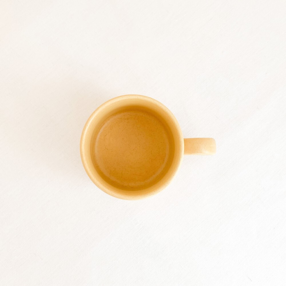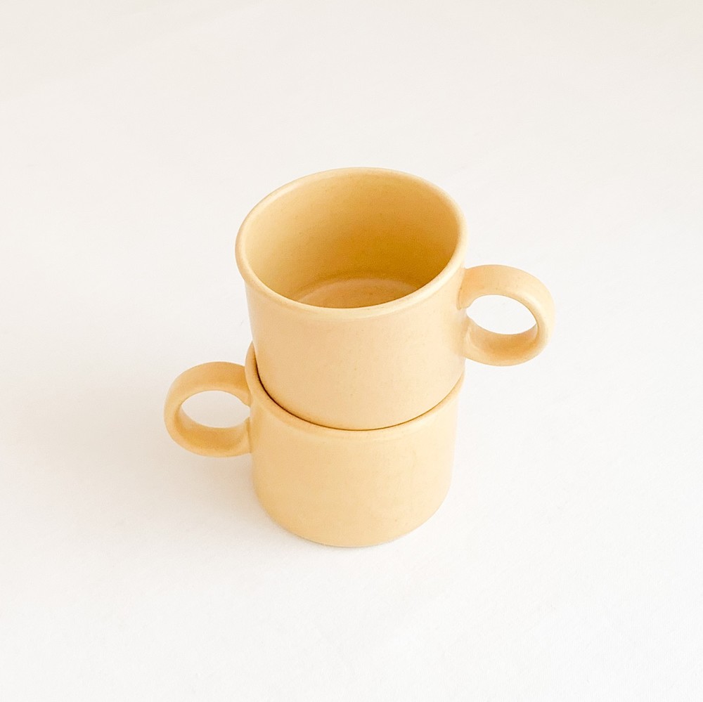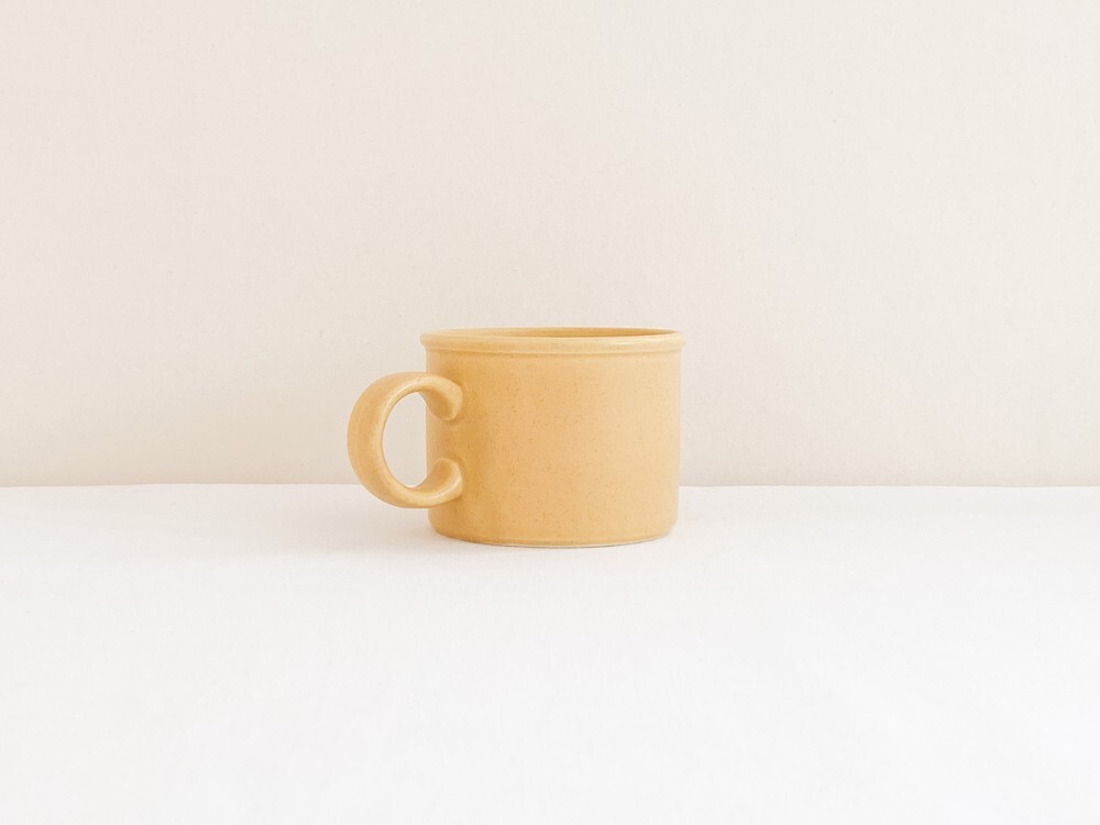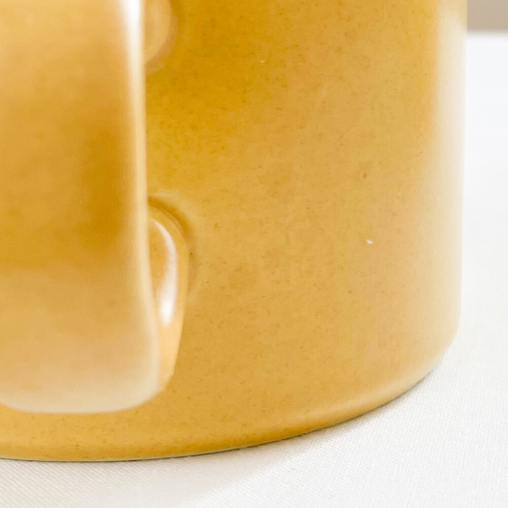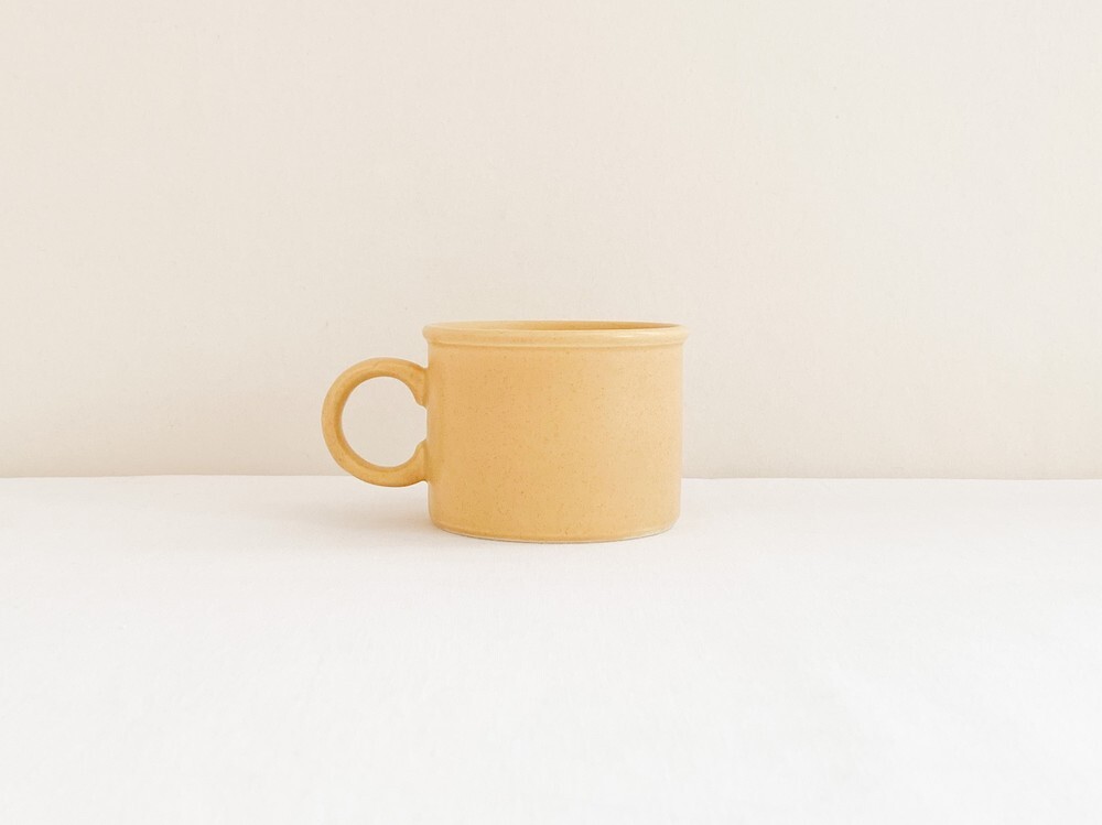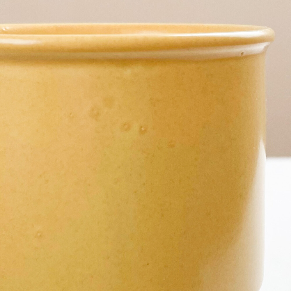 미드윈터는 잉글랜드 중부지방의 버슬렘지역에서 1910년에 부터 시작된, 그 당시의 세련된 트렌드를 이끌어 가던 테이블웨어 브랜드입니다. 소개해드리는 찻잔은 1960년대 후반에 생산 된 제품으로, 밝은 베이지색을 바탕으로 아주 작은 스페클 무늬가 나타난 스톤웨어를 소재로 만들어졌습니다. 동그란 손잡이가 귀여운 넓직한 크기의 찻잔의 겉면에는 환하고 차분한 머스터드색의 유약이 입혀져있으며- 잔받침에는 소재고유의 결이 잔잔하게 보여집니다. 따스한 색감들이 전해주는 편안하고 다정한 리듬과 둥그런 선들이 만들어내는 레이어가 아름답습니다. 아침식탁의 따뜻한 오트밀이나 뮤즐리를 위한 그릇으로, 카페오레나 밀크티를 넉넉히 담아마시는 컵으로 사용하기에 잘 어울립니다.