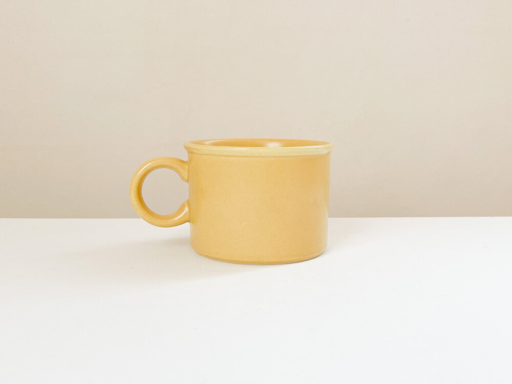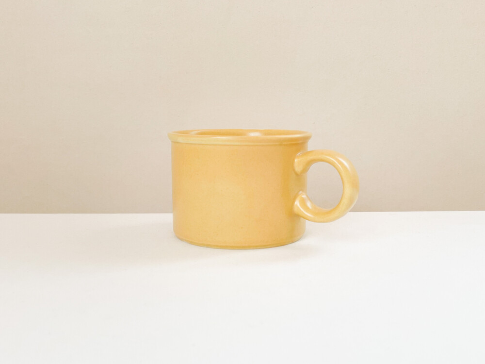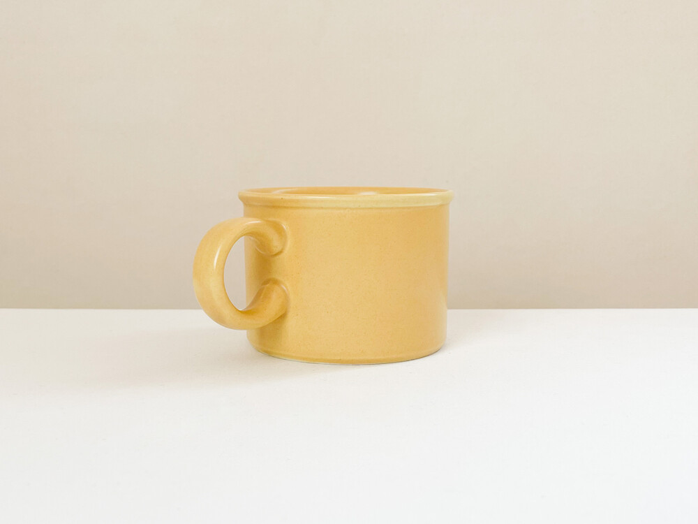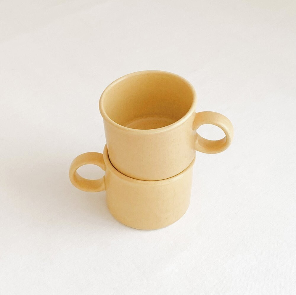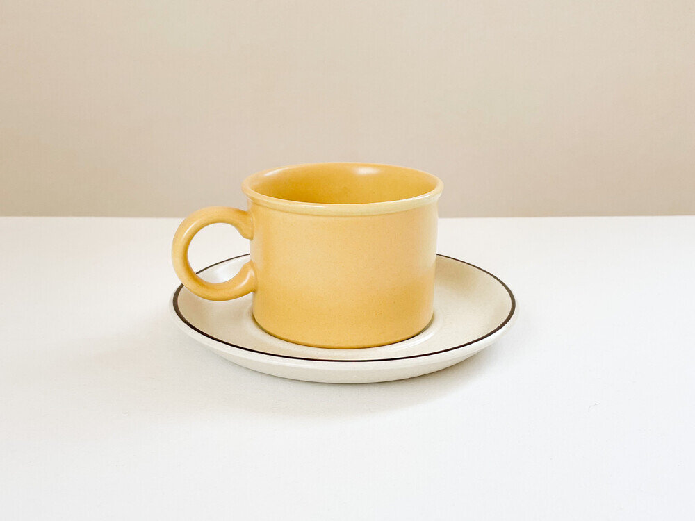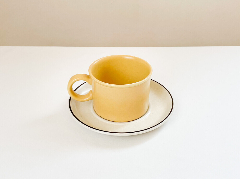 미드윈터는 잉글랜드 중부지방의 버슬렘지역에서 1910년에 부터 시작된, 그 당시의 세련된 트렌드를 이끌어 가던 테이블웨어 브랜드입니다. 소개해드리는 찻잔세트는 1960년대 후반에 생산 된 제품으로, 밝은 베이지색을 바탕으로 아주 작은 스페클 무늬가 나타난 스톤웨어를 소재로 만들어졌습니다. 동그란 손잡이가 귀여운 넓직한 크기의 찻잔의 겉면에는 환하고 차분한 머스터드색의 유약이 입혀져있으며- 잔받침에는 소재고유의 결이 잔잔하게 보여집니다. 따스한 색감들이 전해주는 편안하고 다정한 리듬과 둥그런 선들이 만들어내는 레이어가 아름답습니다. 비교적 넉넉한 크기를 가진 제품으로 가까이에 두고 자주 사용하기에 적당합니다. 아침식탁의 따뜻한 오트밀이나 뮤즐리를 담아내는 그릇으로, 카페오레를 담아마시는 컵으로 사용하기에 잘 어울립니다.