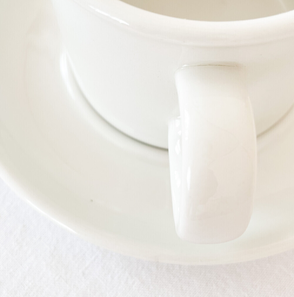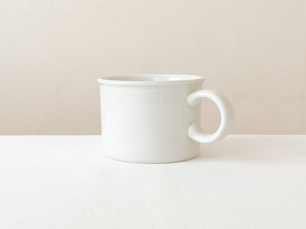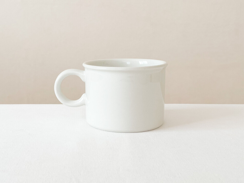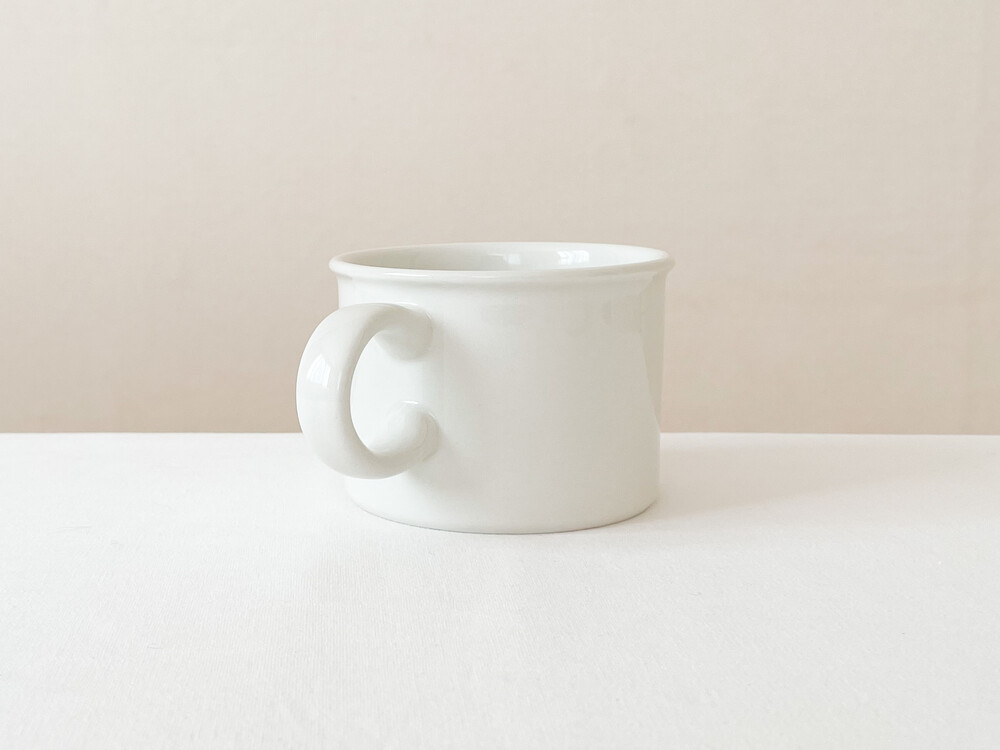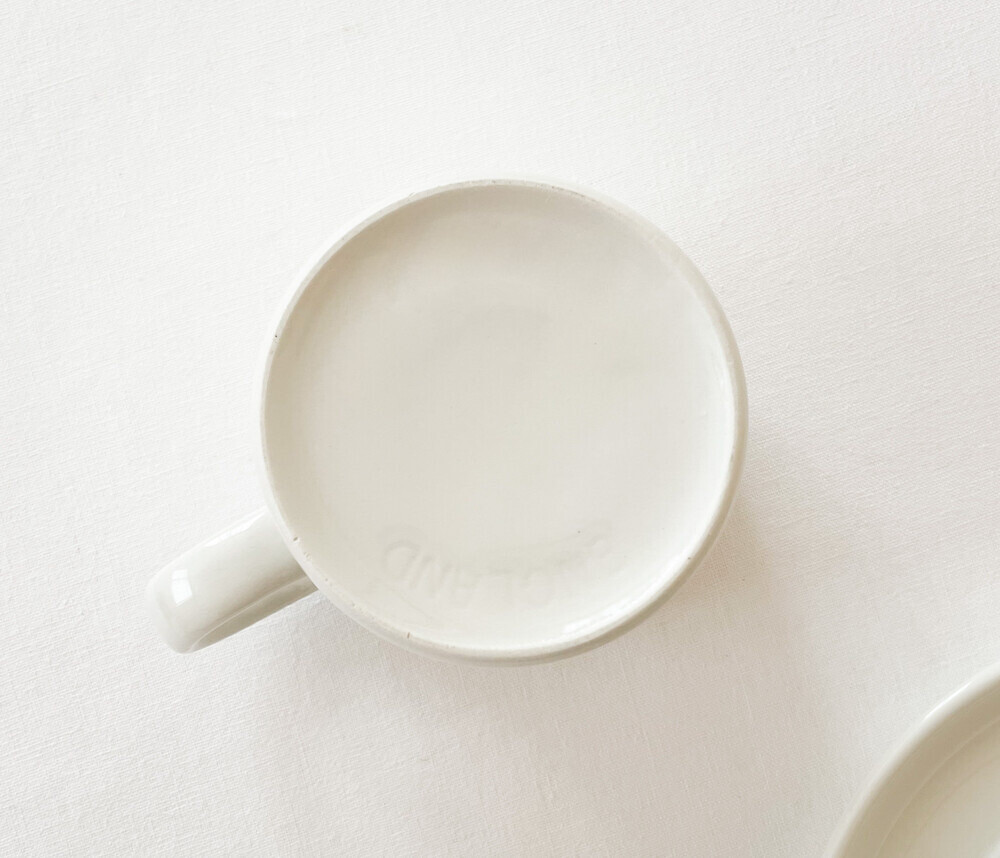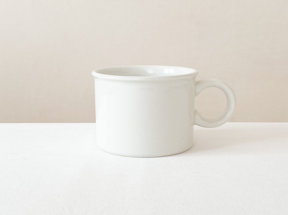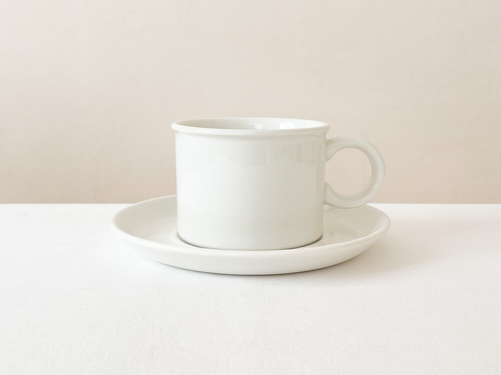 미드윈터는 잉글랜드 중부지방의 버슬렘지역에서 1910년에 부터 시작된, 당시의 세련된 트렌드를 이끌어가던 테이블웨어 브랜드입니다. 소개해드리는 찻잔세트는 1960년대 후반의 것으로, 맑은 하얀색의 스톤웨어를 소재로 만들어졌습니다. 단정하고 안정감있는 선들로 이루어진 찻잔과 비교적 높은 가장자리를 가진- 평평한 동그라미의 잔받침으로 구성되어있으며, 겉면에는 매끄러운 유약이 얇고 단단하게 입혀져 있습니다. 소재에 스며있는 편안하고 화사한 빛이 전해주는 다정한 분위기와 찻잔의 곳곳에서 살펴볼 수 있는 동그라미들이 만들어내는 겹들이 아름답습니다. 간결한 식사를 위한 시리얼이나 과일을 담는 그릇으로 알맞으며, 넉넉히 마시는 카페오레나 수프을 담아내는 컵으로 사용하기에도 잘 어울립니다.