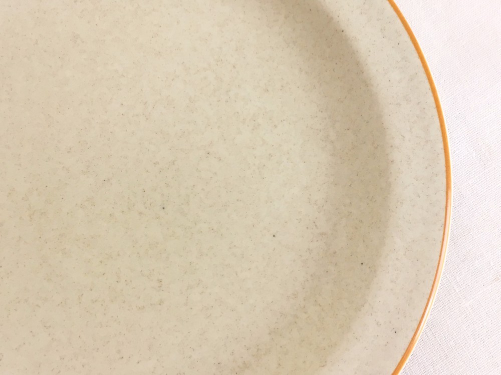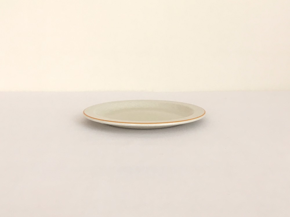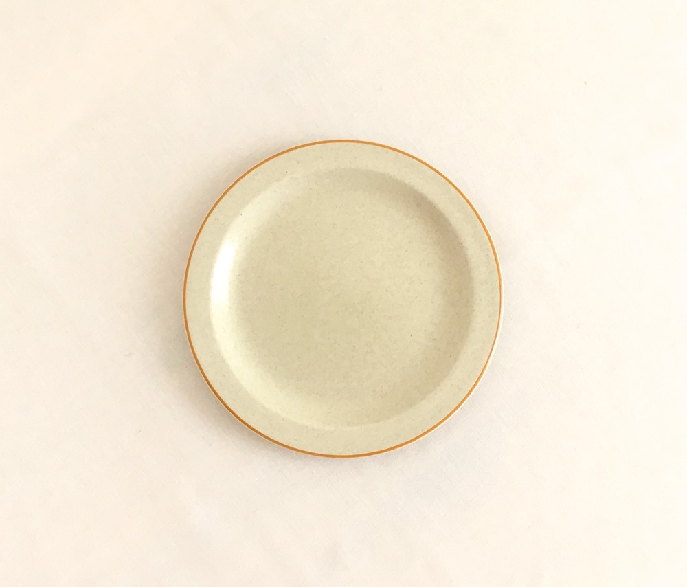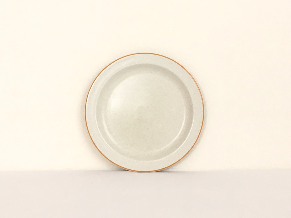 미드윈터는 잉글랜드 중부지방의 버슬렘지역에서 1910년에 부터 시작된, 그 당시의 세련된 트렌드를 이끌어 가던 테이블웨어 브랜드입니다. 소개해드리는 제품은 1960년대에 만들어진 티플레이트입니다. 밝은 베이지를 바탕으로 잔잔하고 부드러운 느낌의 스파클링 무늬가 보여지는, 스톤웨어를 소재로 만들어졌습니다. 좁은 가장자리를 가진 넓은 동그라미로 만들어진 티플레이트는, 배경이 되는 베이지의 스톤웨어와 잘 어울리는 오렌지빛을 띈 짙은 노랑의 줄무늬가 가느다랗게 그려져있습니다. 선명한 색들과 둥그런 선들로 완성된 단정한 모습이 아름답습니다. 비교적 넉넉한 크기를 가진 제품으로, 다정하고 밝은 분위기를 가지고있으며, 가까이에 두고 자주 사용하는 그릇들로 적당합니다. 시럽을 넉넉히 끼얹은 팬케이크를 담아내고- 짙은 커피를 함께내는 아침식탁위의 그릇으로, 아이스크림이나 과일을 담는 디저트그릇으로 사용하기에 잘 어울립니다.