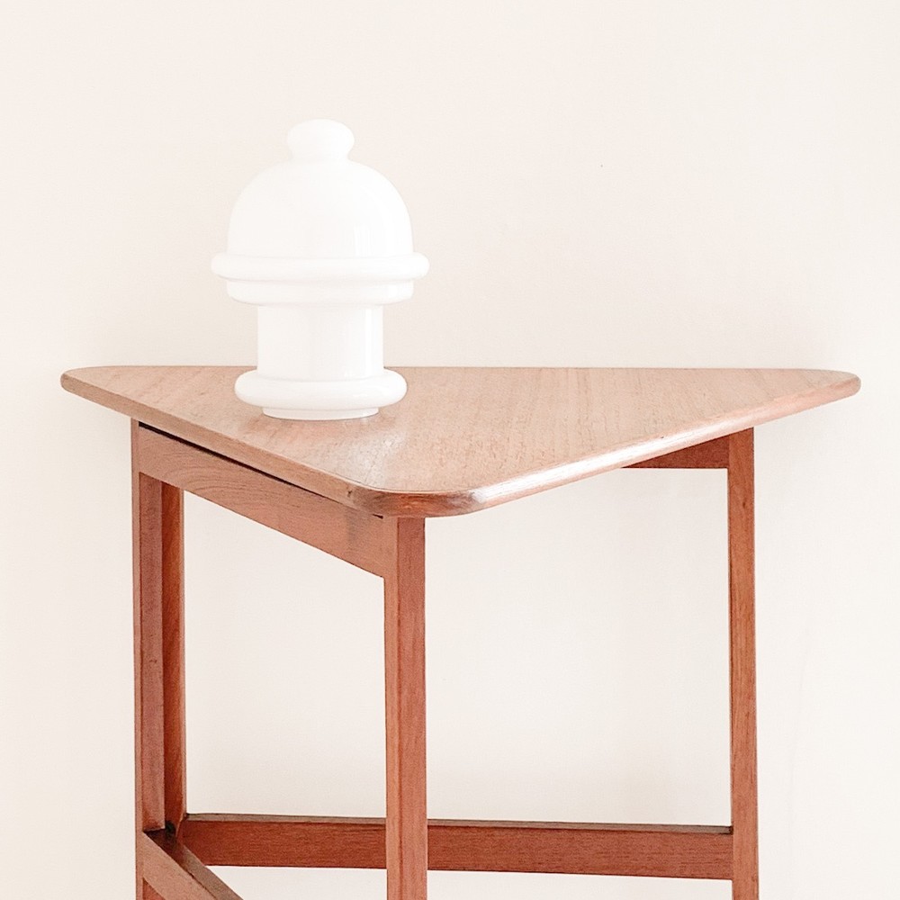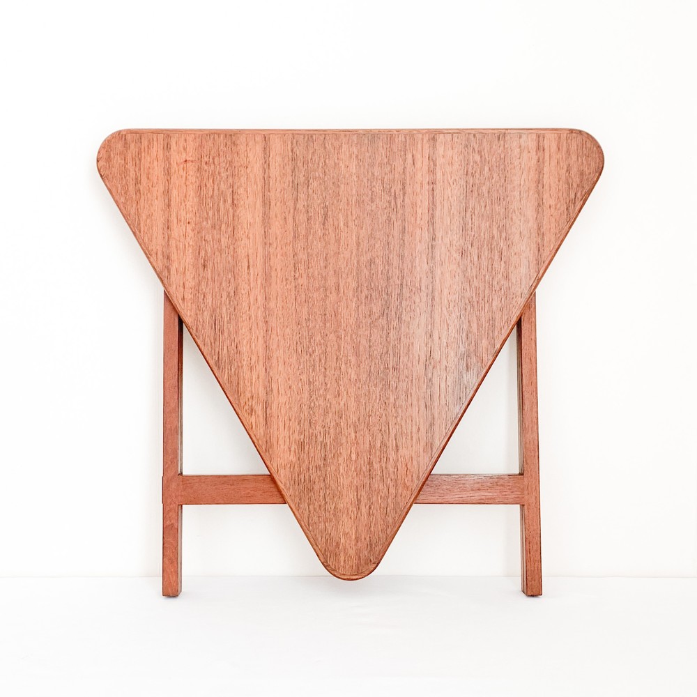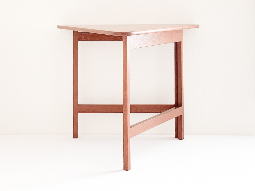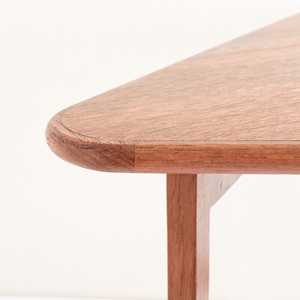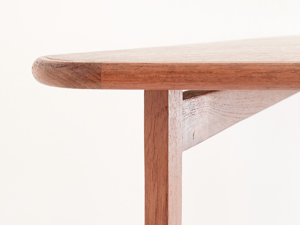 소개해드리는 테이블은 덴마크의 실케보르지역에서 제작되었습니다. 모서리가 둥근 정삼각형의 테이블탑과, 반듯한 H모양의 다리로 구성되었습니다. 두 개의 다리와 테이블탑은 정확한 분할로 다듬어져 연결되어 있으며- 하나의 다리는 테이블탑으로부터 움직여 접혀지고 펼쳐지도록, 다른 하나는 양옆으로 움직여 테이블탑을 지지하도록 만들어졌습니다. 테이블을 이루는 모든부분들에서 섬세한 재단을 바탕으로 이루어진 완벽한 매무새가 보여집니다. 티크고유의 결이 잘 보여지는 차분하고 짙은 나무색과 오렌지오일로 마무리된 잔잔한 광택이 보여지는 테이블로, 어느 공간에나 잘 어울릴 수 있는 자연스러움을 가지고 있으며- 얇게 접혀질 수 있는 모양은, 가구의 유연한 배치가 필요한 곳에서 사용하기에도 알맞습니다. 간결하고 섬세한 매무새와 견고한 소재의 분위기에서 전해지는 미드센츄리의 세련됨이 잘 보여지는 테이블입니다. 발코니에서 사용하거나 소풍을 갈때 가지고 나가는 간편한 테이블로 알맞으며, 소파나 침대곁에 두어 조명이나 작은 물건들을 정리하는 가구로 잘어울립니다.