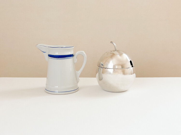 1960년대 영국에서 제작된 빈티지 잼팟입니다. 금관악기의 재료로 사용되기도 하는 실버니켈위에 순은을 고르게 입혀낸 실버플레이티드 제품입니다. 소재의 은은하고 화사한 반짝임과 좋은 어울림을 만들어내는 사과열매를 모티프로 합니다. 사과는 고전에서 사랑, 지혜, 기쁨을 의미합니다. 담겨있는 의미의 결이 전해지는 풍성하고 단정한실루엣이 보여집니다. 고르고 매끄러운 터치와 색의 흐름이 아름다우며, 시간의 깊이가 전해지는 소재에는 우아함이 깃들어 있습니다본래의 용도에 맞춰 잼이나 꿀을 담아두는 테이블 가운데에 놓아두거나, 초를 담아켜거나 작은 물건들을 정돈하는 그릇으로 사용하기에 잘 어울립니다.