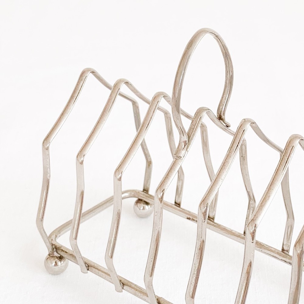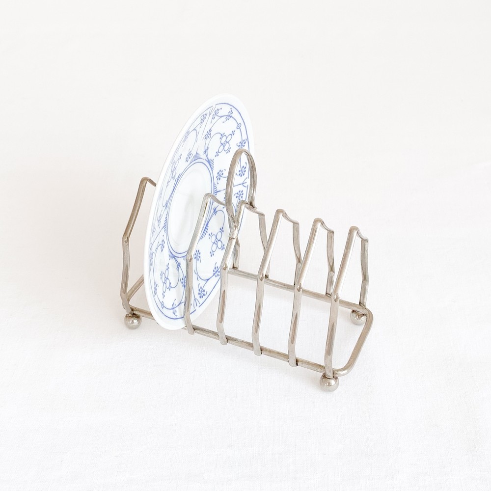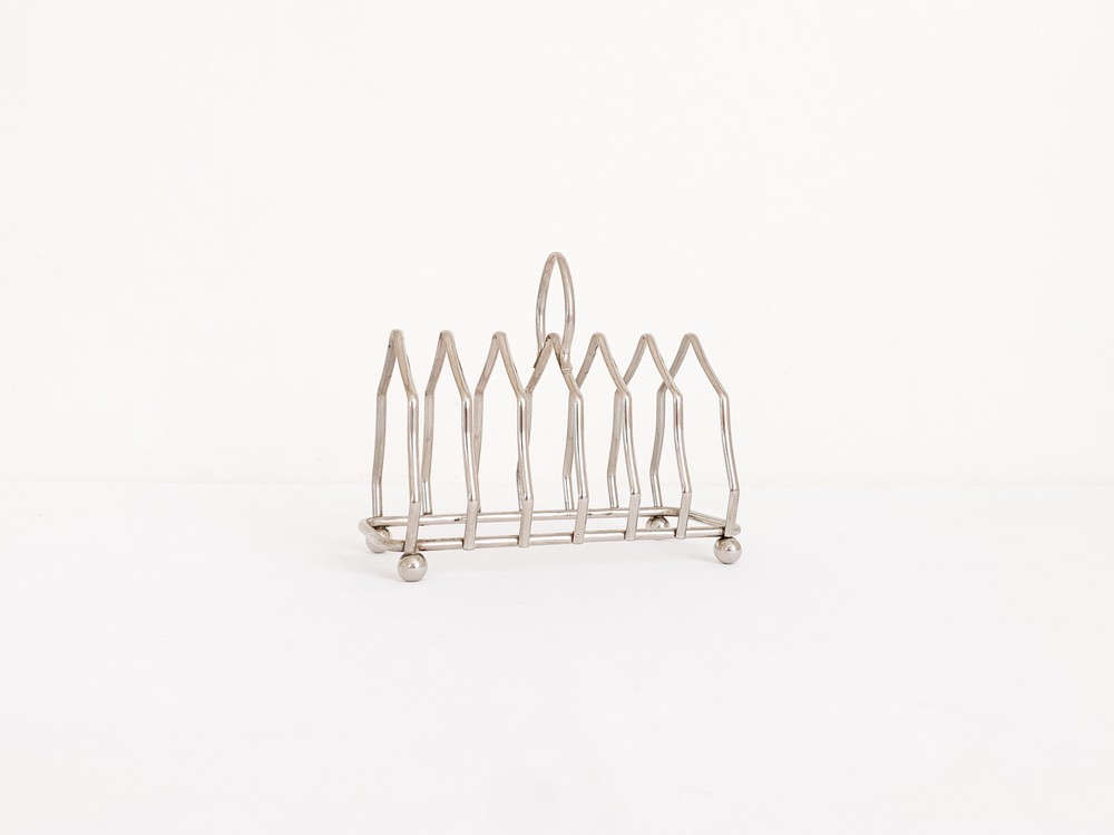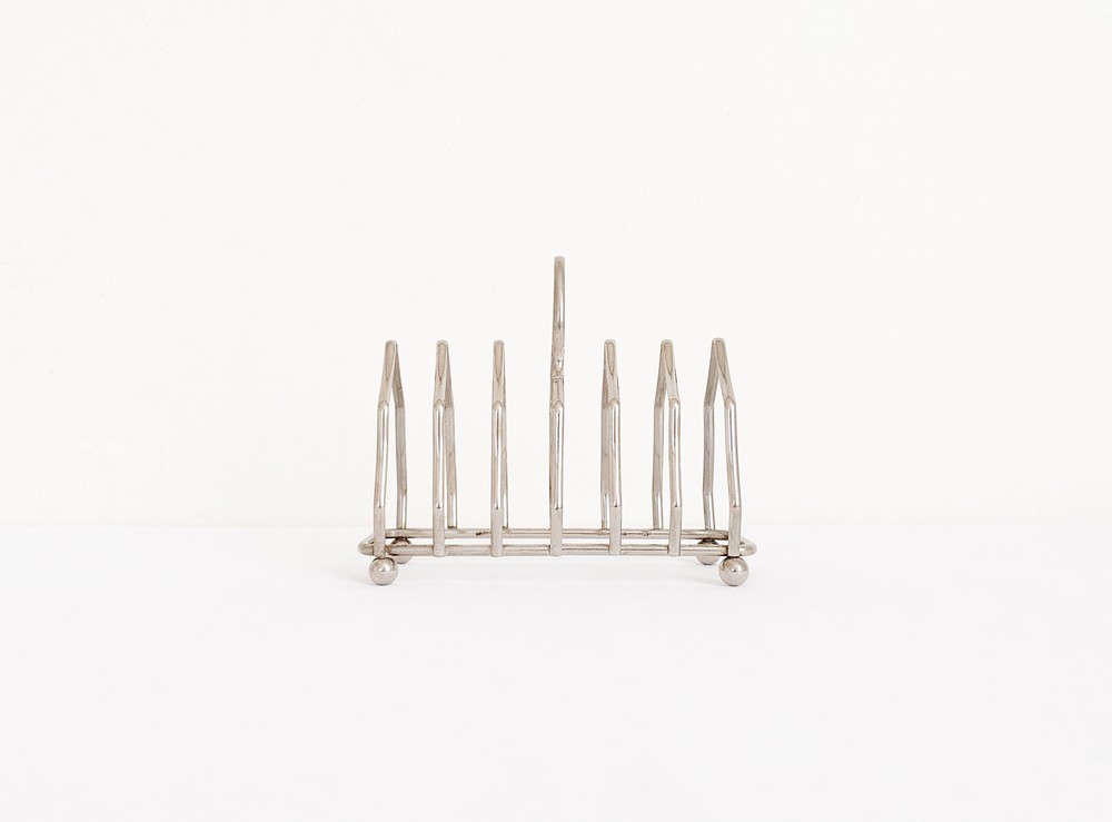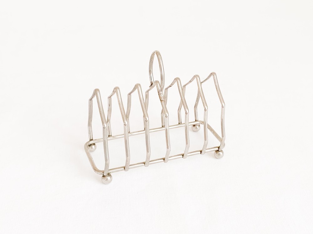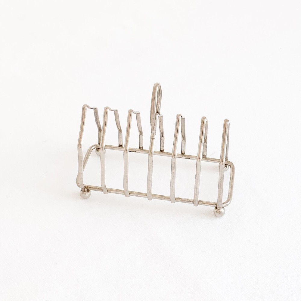 1950년대 후반, 영국의 셰필드지역에서 제작된것으로 전해지는 빈티지 토스트랙입니다. 스테인리스스틸에 순은이 입혀진 소재의 토스트랙은, 반듯한 실버플레이티드 튜브를 정돈해 만들어졌습니다. 여섯개의 토스트를 담아낼 수 있는 가지런한 파티션과 단정한 꽃봉오리를 닮은 손잡이, 동그란 구슬모양의 받침으로 이루어져있습니다. 섬세하고 유연한- 장식적인 실루엣은, 50-60년대 특유의 간결하고 화사한 분위기를 잘 보여줍니다. 잼과 버터와 커피가 놓인 식탁의 가운데에 두는 따뜻하고 바삭한 토스트를위한 식기로, 작은 접시와 클로스들을 정돈하는 트레이로 사용하기에 잘 어울립니다.