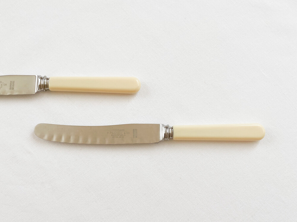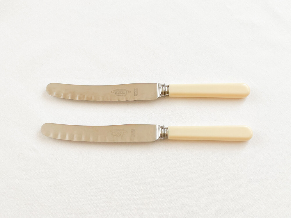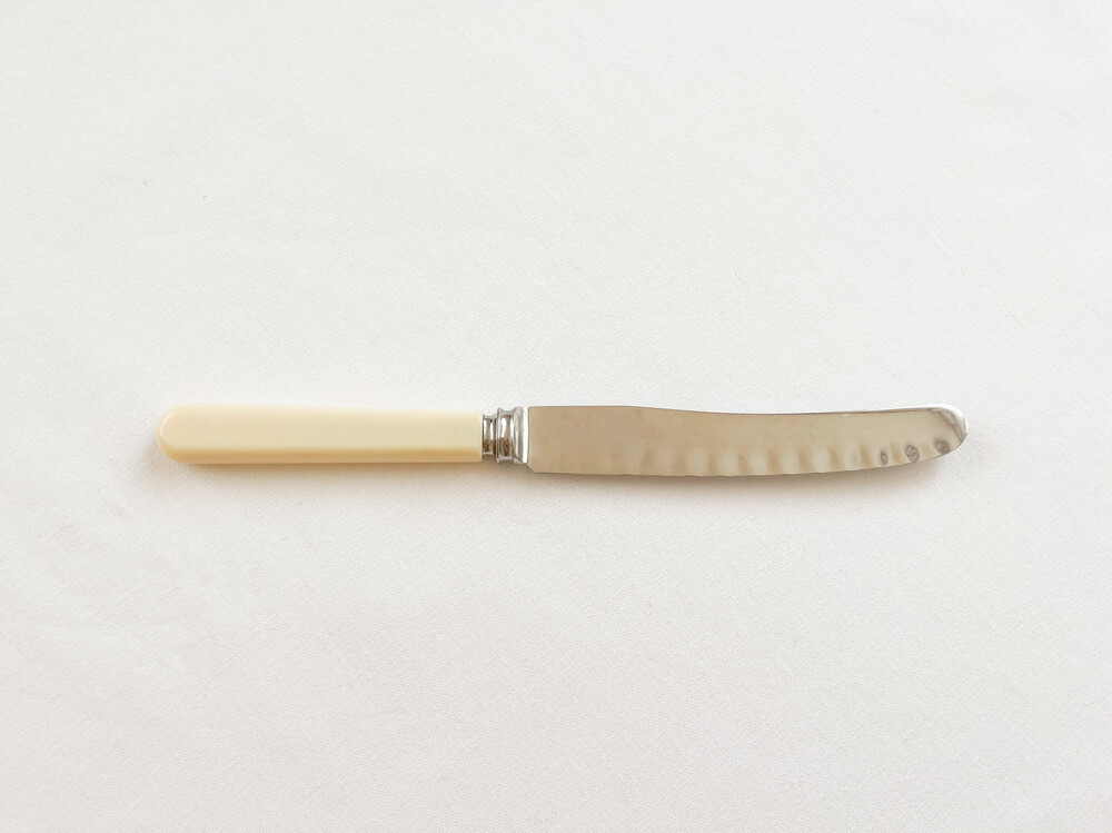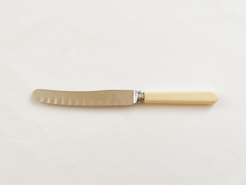 사무엘 피어슨의 빈티지 나이프입니다. 사무엘 피어슨은 1800년대 중반 잉글랜드 요크셔지방에서, 벽돌이나 파이프 등 건축설비를 위한 제품들을 만드는 것으로 시작 된 독특한 이력을 가지고 있는 브랜드입니다. 제한을 두지 않는 넉넉한 경영방법과 섬세함으로, 영국의 상수도나 철도 건설에 큰 기여를 하는 회사가 된 사무엘피어슨은- 1800년대 후반에 들어 헤드쿼터를 런던으로 옮기게 됩니다. 그 이후 일상생활에서 좀 더 밀접하게 접할 수 있는 하우스홀드 하드웨어들을 만들기 시작하고, 자연스래 테이블웨어들을 제작하게 됩니다. 사무엘 피어슨의 테이블웨어들은- 큰 바탕을 가지고 있는만큼 안정적인 품질과 다양한 디테일들로 보편적인 인기를 가지게 됩니다. 소개해드리는 제품은 1960년대에 만들어진 것으로, 스테인리스스틸과 베이클라이트를 소재로 합니다. 단정하고 둥글며 베이클라이트 고유의 매끄런운 질감이 보여지는 손잡이, 사무엘 피어슨만의 완만한 물결모양을 담아낸 무척 가벼운 사용감의 날로 구성 되어있습니다. 내구성이 좋은 소재, 고전을 바탕으로하지만 더 편리한 사용과 새로운 모습으로 부터 전해지는 즐거움이 조화로운 제품입니다. 본래의 용도에 맞춰 테이블위의 과일과 함께 두는 나이프로, 케이크를 나누어담는 가벼운 서버로 사용하기에 알맞습니다.