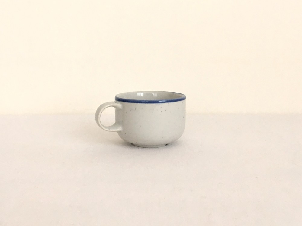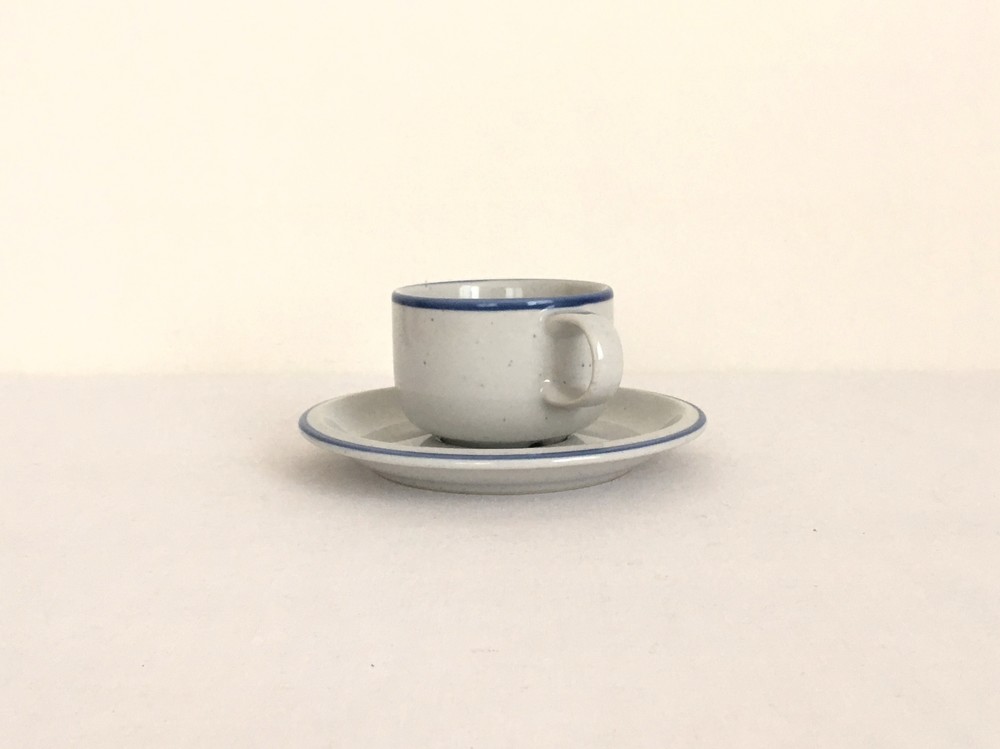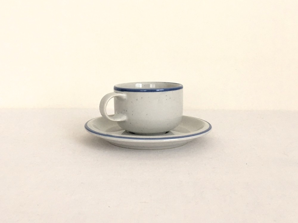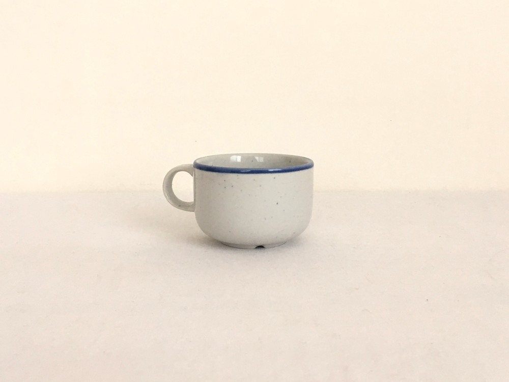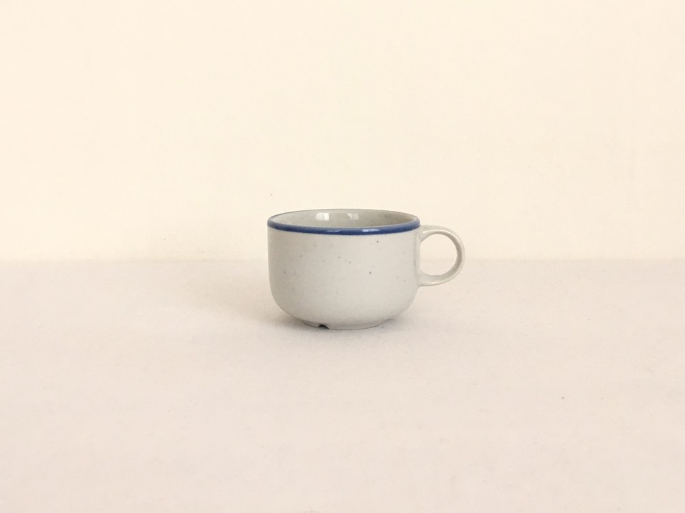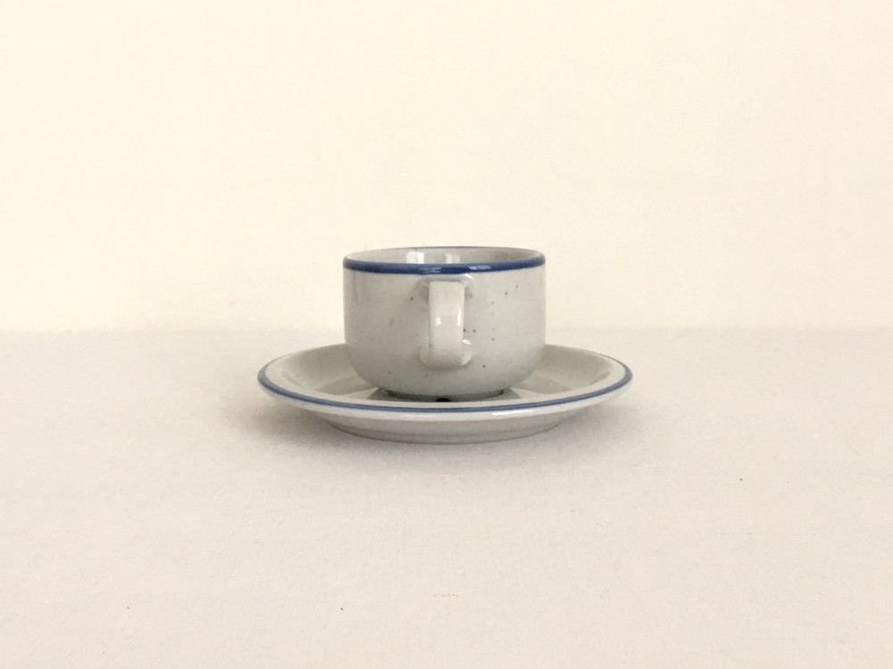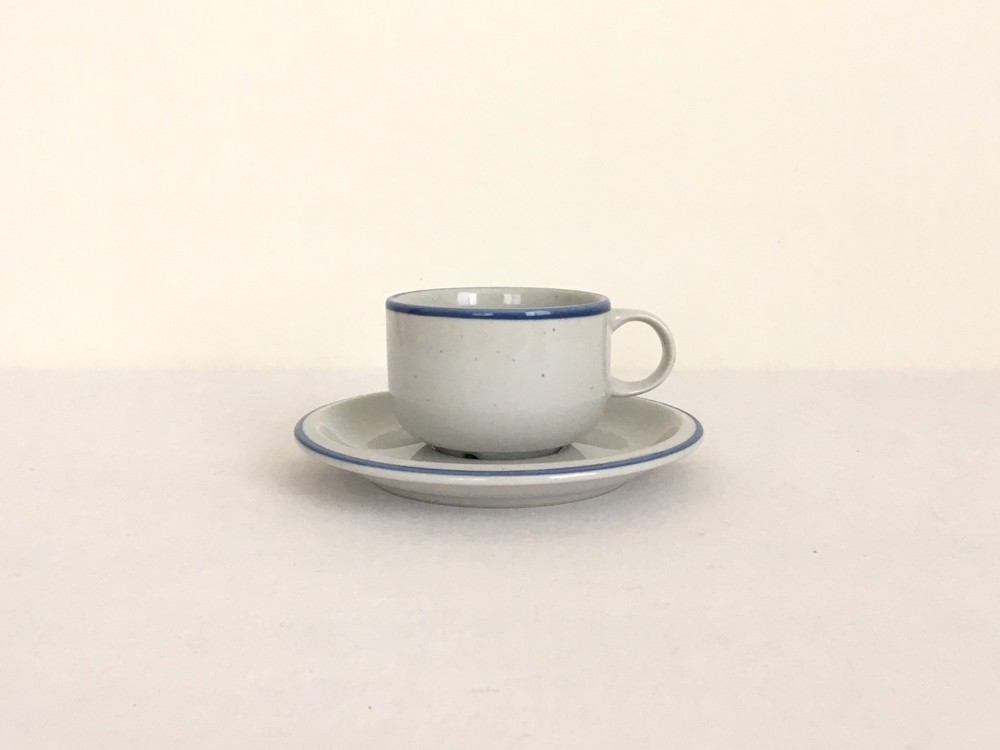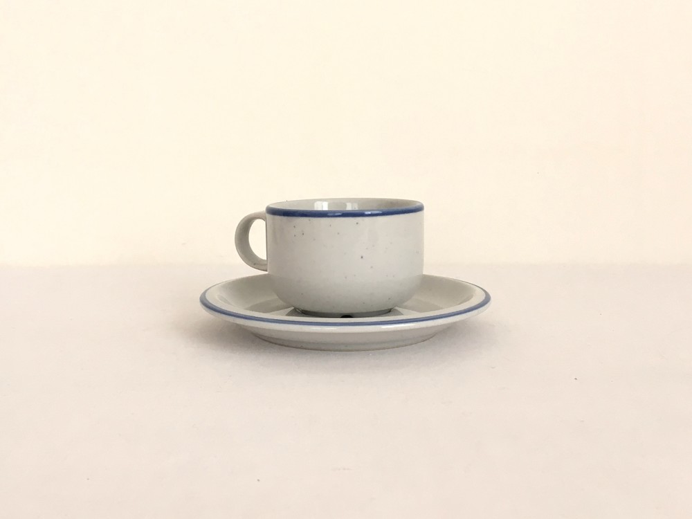 토마스앤코는 1872년 독일의 마르크트레드비츠에서 시작된 테이블웨어 브랜드입니다. 좋은 품질의 원료와 시간과 장소를 아우를 수 있는 도자기를 만드는것을 목적으로 가졌습니다. 단순하지만 특색있는, 고전에서 벗어나지 않은 형태와 색감의 테이블웨어를 제작하며 명성을 가지게 되며- 로젠탈, 웨지우드 등 유럽의 역사깊은 도자기들에 영향을 주는 위치에도 이르게 됩니다. 소개해드리는 제품은 1966년에서 1968년사이에 만들어진 찻잔세트로, 단단하고 묵직한 크림색의 스톤웨어를 소재로합니다. 바탕이되는 스톤웨어 위로는 아주 밝은- 하얀색에 가까운 포근한 회색이 입혀지고, 잔잔하고 차분한 푸른색의 스파클링 무늬가 전체에 그려졌습니다. 동그란 모양이 유독 돋보이는 귀여운 손잡이를 가진 찻잔은 손에 들었을때 아주 편안하고 안정감있는 기분을 전해주는 넉넉한 모양을 가지고 있으며, 넓은 동그라미의 찻잔과 잔받침의 가장자리에는 스파클링 무늬와 같은 푸른색의 줄무늬가 적당한 두께로 둘러져있습니다. 만들어질때에 떠올려졌을 편안하고 따뜻한 아침식탁에 잘어울리는 분위기를 가지고있는 제품으로, 아침의 뜨거운커피나 카페오레를 마시는 잔으로 잘어울리며, 요거트나 과일담아내는 보울로 사용하기에도 적당합니다.
