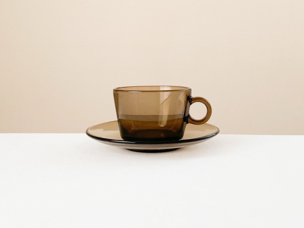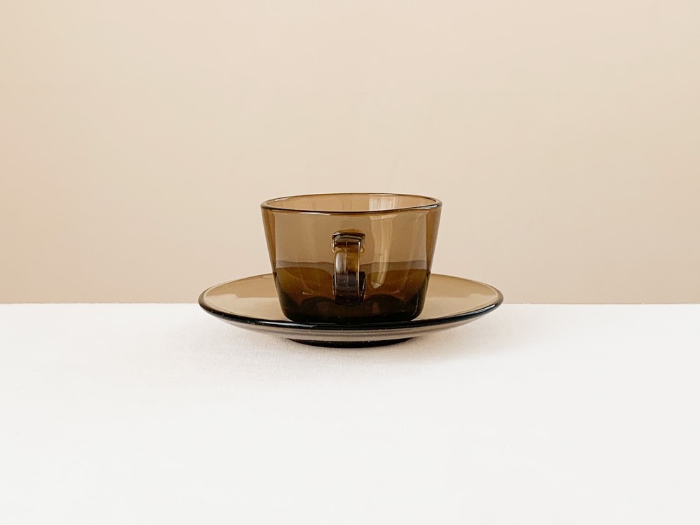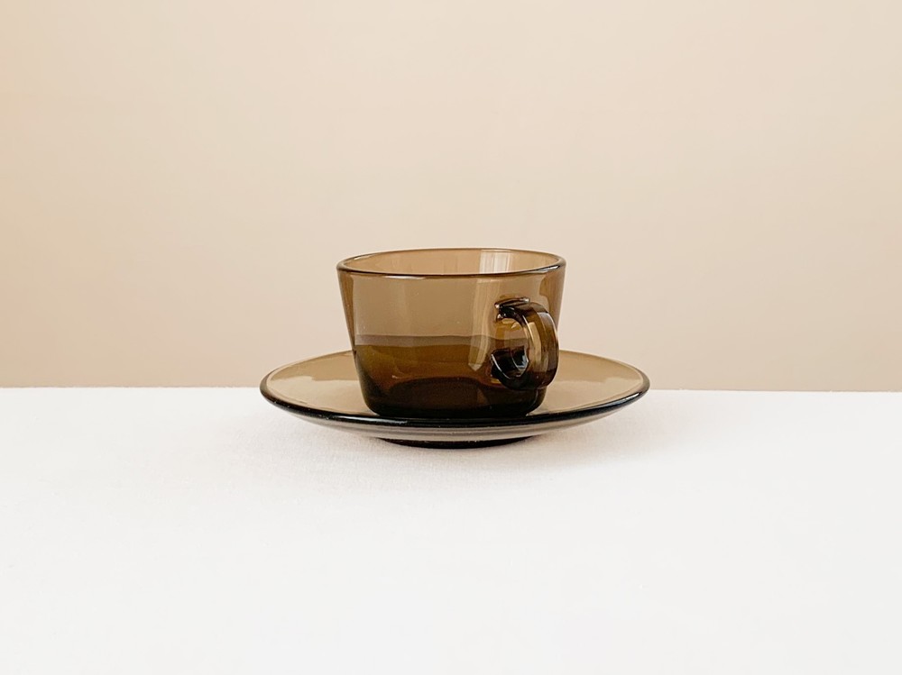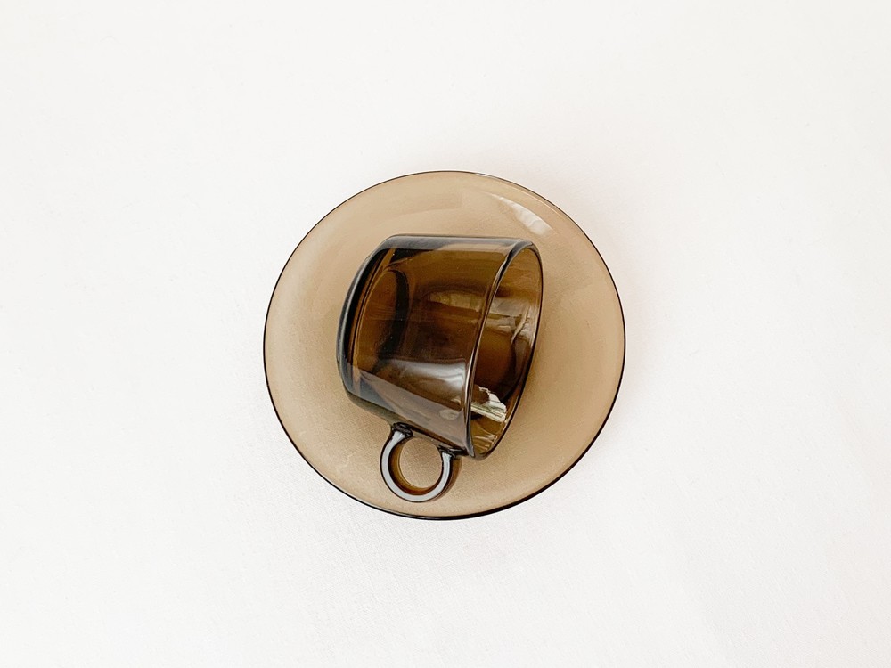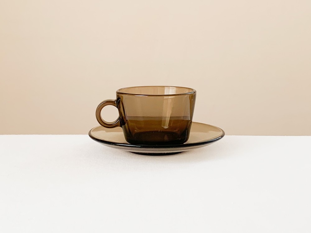 소개해드리는 제품은 1960년대에 제작 된 베레코의 커피컵세트로, 회색의 맑은 유리를 소재로 합니다. 단정하고 둥근 면과 선들로 모양을 갖추고 있으며, 둥글고 매끄러운 실루엣의 찻잔과 시원한 펼쳐짐이 보여지는 잔받침이 짝을 이룹니다. 투명함과 투명함이 만나 보여지는 리듬의 겹쳐짐, 고르게 반짝이는 잔잔한 빛이 아름답습니다. 차가운 크림을 얹은 향긋한 커피나 허브를 얹은 바닐라 아이스크림 같은 로맨틱한 디저트를 담아내는 컵으로 사용하기에 잘 어울립니다.