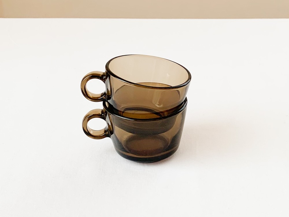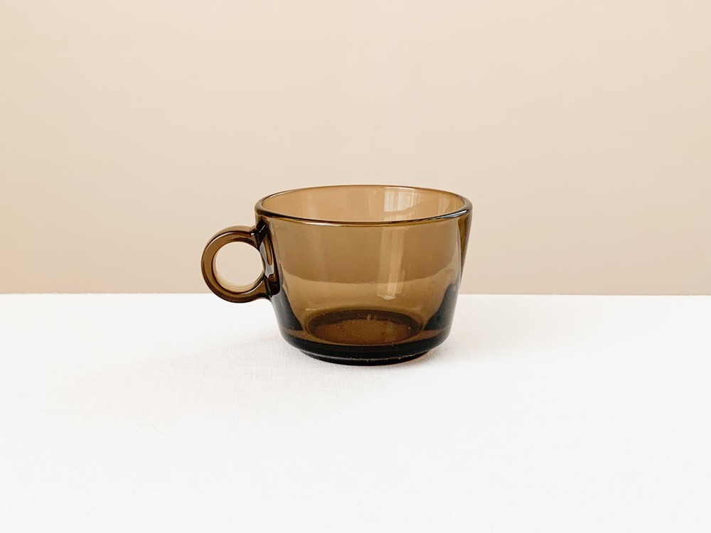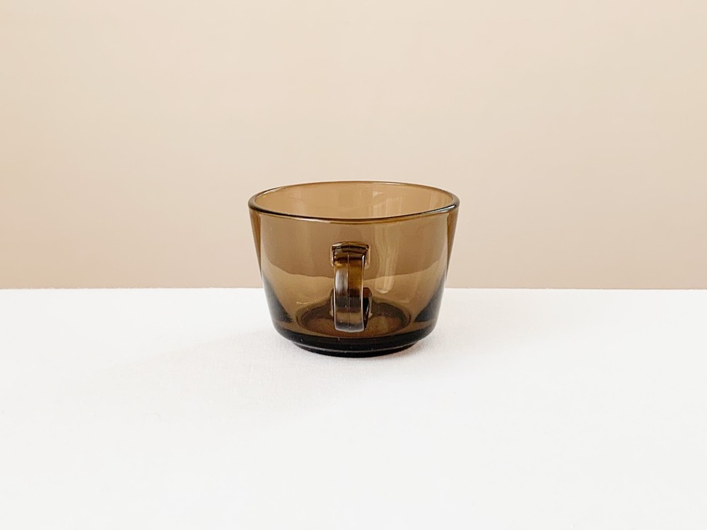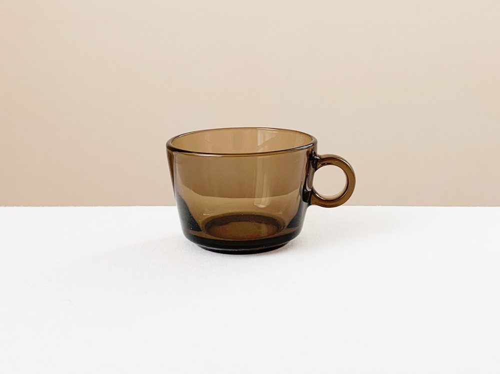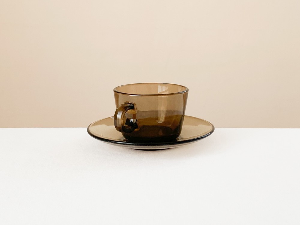 소개해드리는 제품은 1960년대에 제작 된 베레코의 커피컵세트로, 회색의 맑은 유리를 소재로 합니다. 단정하고 둥근 면과 선들로 모양을 갖추고 있으며, 둥글고 매끄러운 실루엣의 찻잔과 시원한 펼쳐짐이 보여지는 잔받침이 짝을 이룹니다. 투명함과 투명함이 만나 보여지는 리듬의 겹쳐짐, 고르게 반짝이는 잔잔한 빛이 아름답습니다. 차가운 크림을 얹은 향긋한 커피나 허브를 얹은 바닐라 아이스크림 같은 로맨틱한 디저트를 담아내는 컵으로 사용하기에 잘 어울립니다.