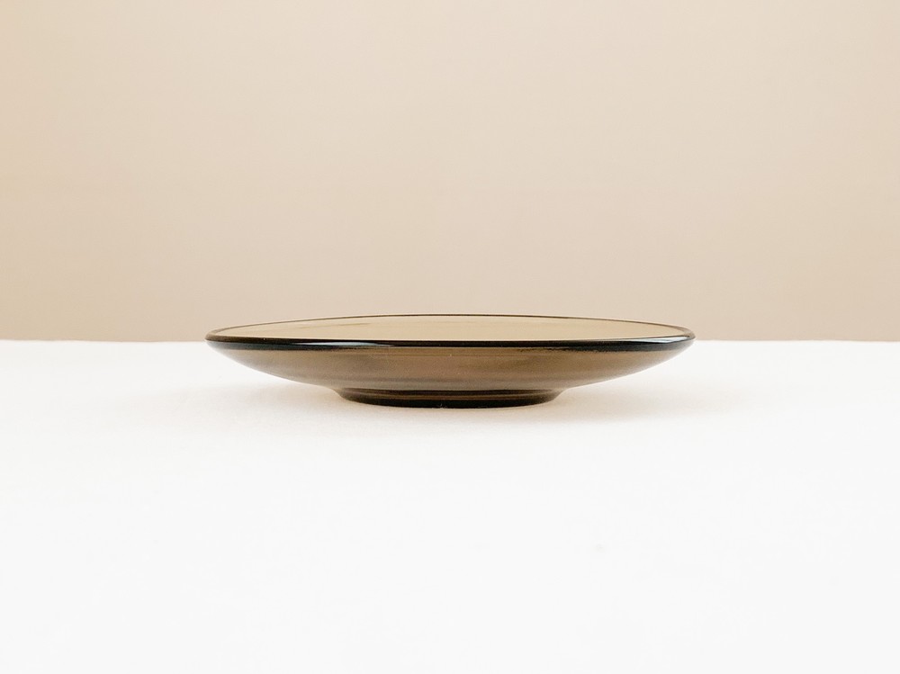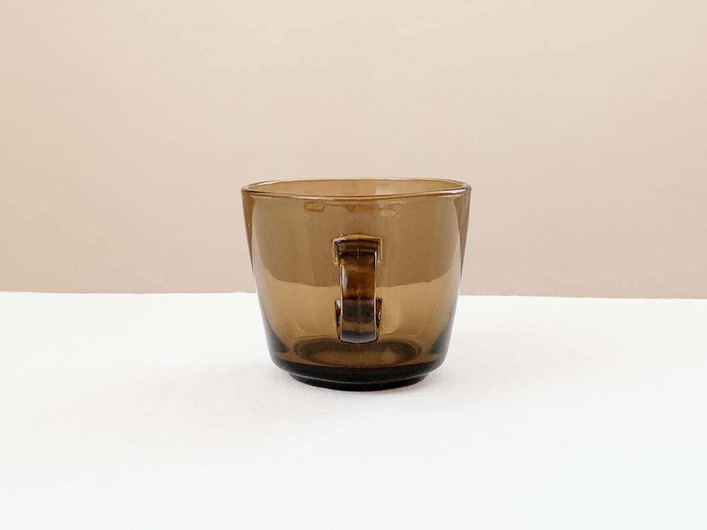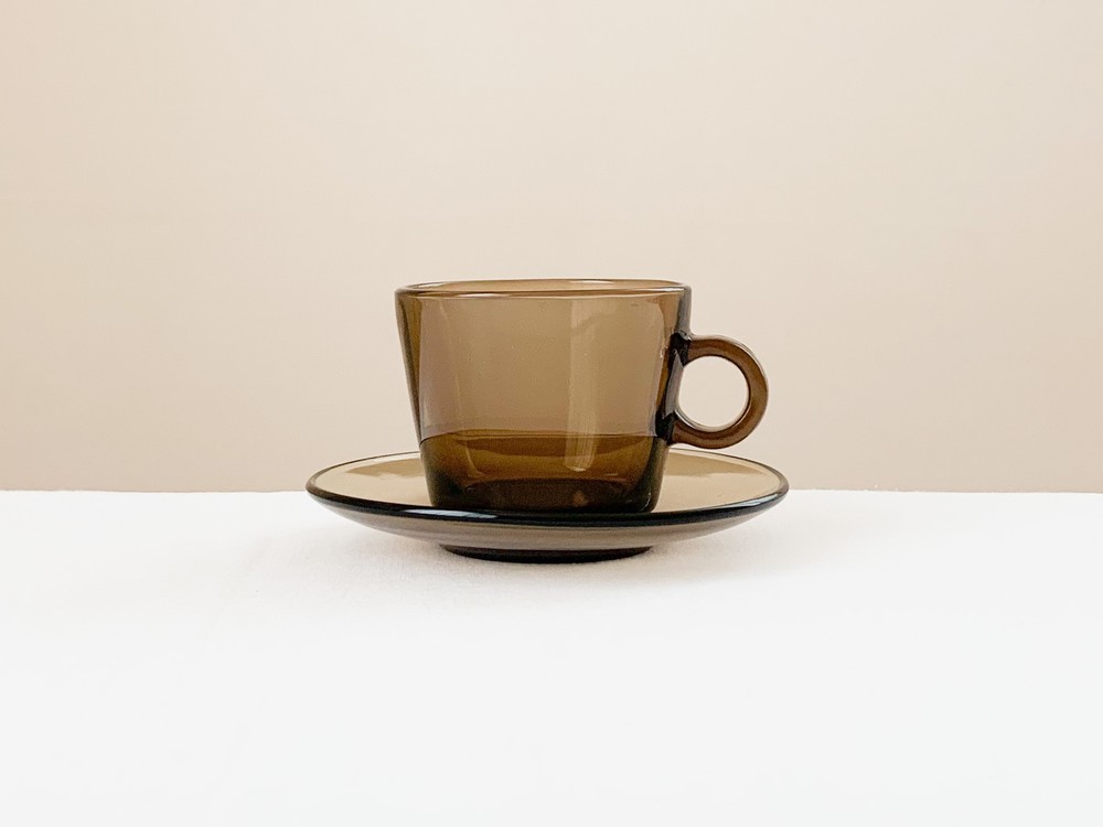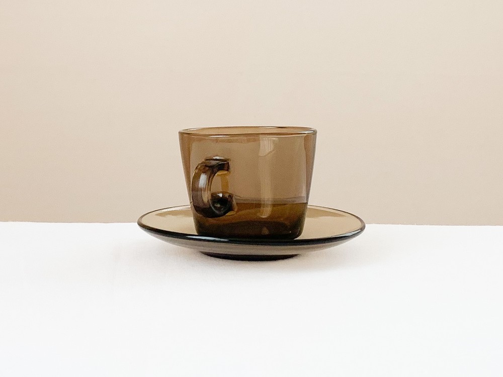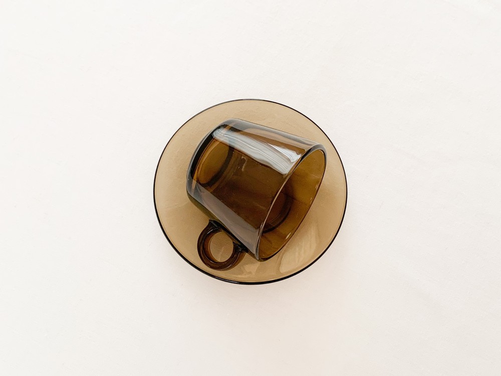 소개해드리는 제품은 1960년대에 제작 된 베레코의 찻잔세트로, 회색의 맑은 유리를 소재로 합니다. 단정하고 둥근 면과 선들로 모양을 갖추고 있으며, 깊고 매끄러운 찻잔과 시원한 펼쳐짐을 가진 잔받침이 짝을 이룹니다. 투명함과 투명함이 만나 보여지는 리듬의 겹쳐짐, 고르게 반짝이는 잔잔한 빛이 아름답습니다. 차가운 크림을 얹은 향긋한 커피나 허브를 얹은 바닐라 아이스크림 같은 로맨틱하고 향기로운 디저트를 담아내는 컵으로 사용하기에 잘 어울립니다.