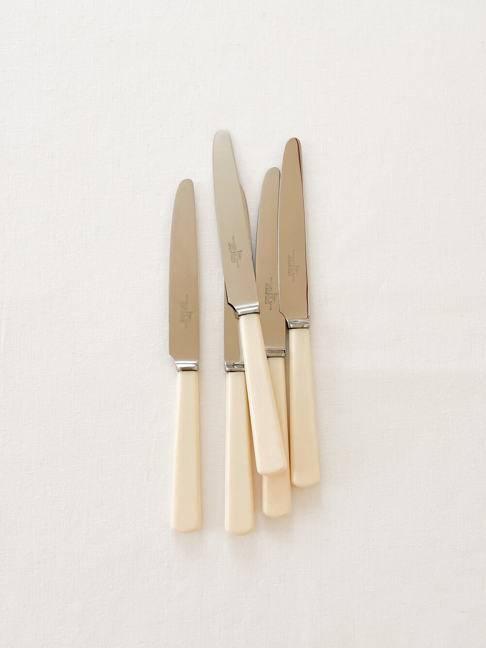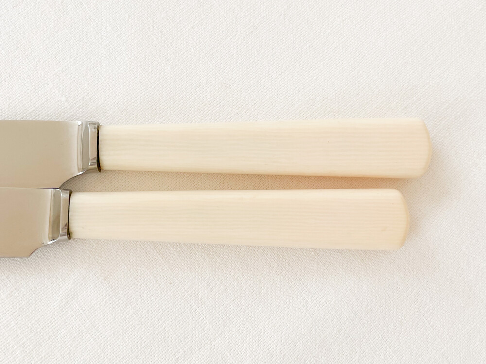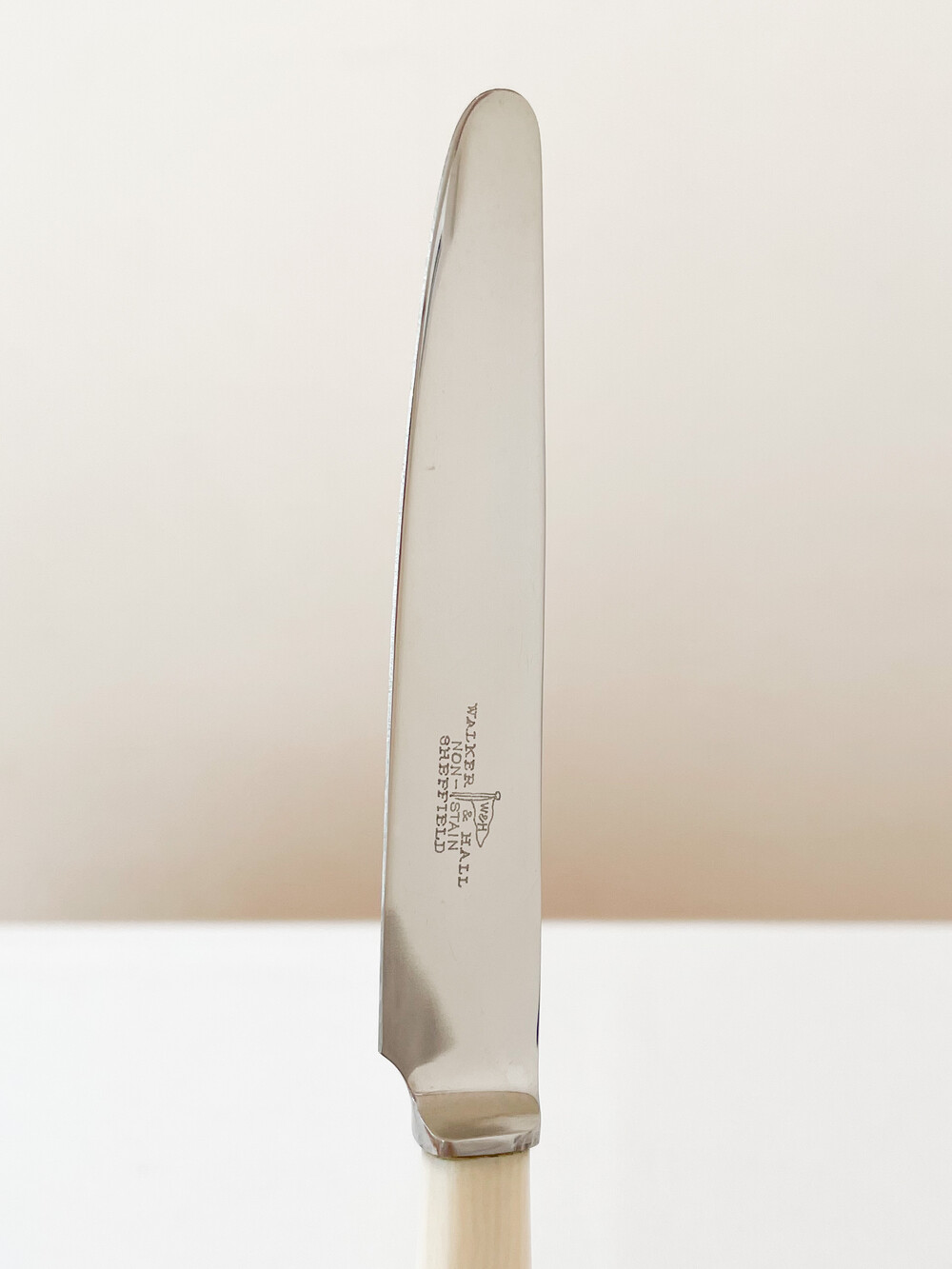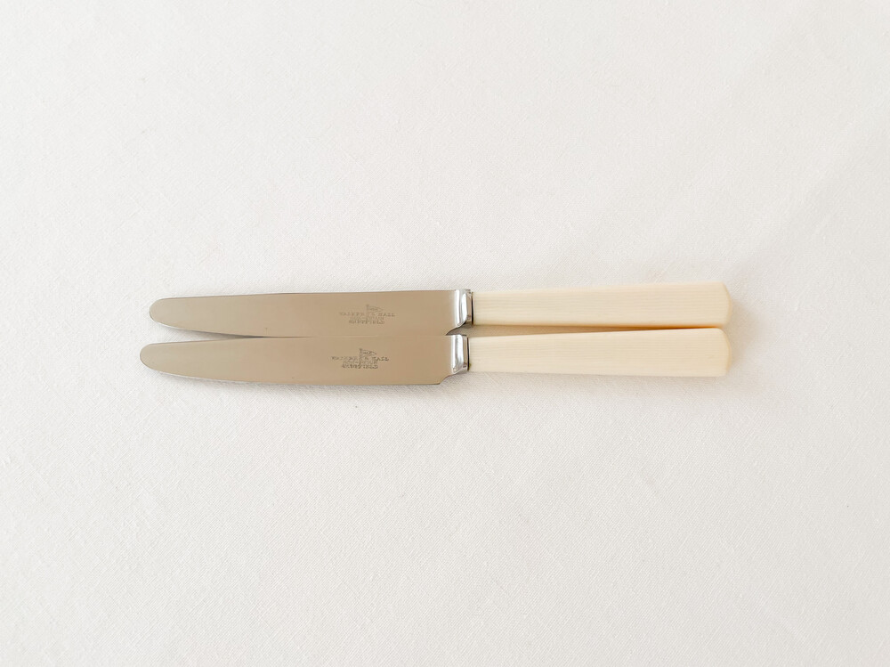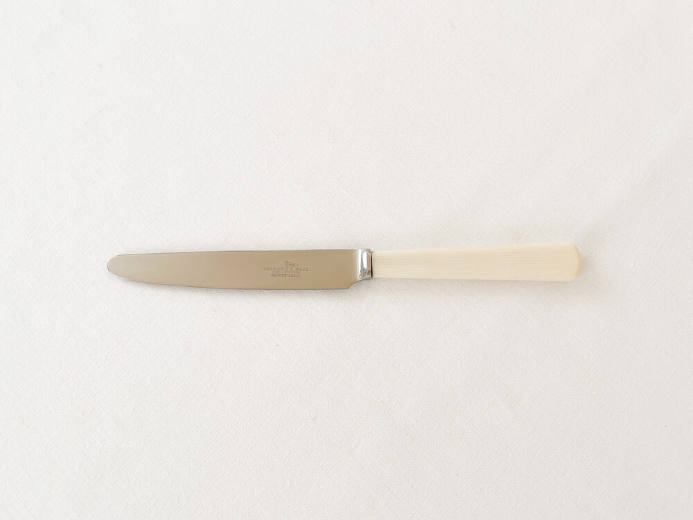 1960년대에 제작된 워커앤홀의 빈티지 나이프 입니다. 워커앤홀은 1845년 셰필드의 명성높은 실머스미스인 조지 워커로 부터 시작 된 브랜드립니다. 영국 금속공예와 상공업의 중요한 지역인 셰필드의 풍부한 인적물적 자원을 바탕으로, 집안을 꾸미는 장식품부터 양질의 테이블웨어를 만들었던 워커앤홀은 브랜드의 시작과 함께 제품의 생산지는 셰필드에- 쇼룸을 런던 홀본에 두어 장인정신의 구현과 비즈니스로서의 성공을 함께 보여주는 표본격의 브랜드로 자리하고 있기도합니다. 소개해드리는 제품은 고전적인 색과 결을 가진 베이클라이트와 적당한 무게와 단단한 질감을 가진 스테인리스 스틸을 소재로 하는 디저트 나이프 입니다. 단정하고 반듯한 실루엣이 화사한 색감, 깨끗한 소재와 아주 좋은 어울림을 보여줍니다. 파이나 샌드위치, 토스티와 함께내는 나이프로- 가벼운 샐러드나 채소요리에 사용하는 나이프로 사용하기에 알맞습니다.
