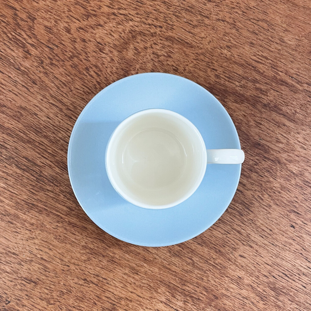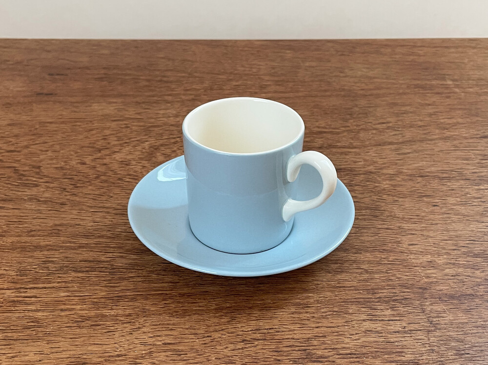1960년대 후반에 만들어진 웨지우드의 빈티지 커피컵세트입니다. 웨지우드는 1759년 부터 영국의 버슬램지역에서 도자기를 만들어온 브랜드입니다. 고급 티웨어와 식기들, 그리고 도자기 장식품들을 만들며 가치를 쌓아오는 웨지우드는 1760년대 부터 왕실에서 사용하는 도자기를 제작하며 웨지우드-퀸즈웨어 라는 명칭을 얻게됩니다. 섬세한 디자인과 좋은 품질의 도자기를 꾸준히 만들어내며, 영국을 비롯한 도자기라는 카테고리를 대표하는 브랜드로 자리잡게 됩니다. 소개해드리는 제품은, 웨지우드 특유의 화사하고 고운결의 크림색의 본차이나를 소재로합니다. 단정한 동그라미 모양의 컵과 컵을 감싸는듯 단정한 실루엣으로 만들어진 잔받침으로 구성되어있습니다. 컵과 잔받침의 겉면에는 부드러운 하늘색이 입혀져 있으며, 컵의 안쪽과 손잡이에는 바탕이되는 크림색의 본차이나가 드러나 포근하고 환한 감정을 전해줍니다. 미드센츄리 특유의 담담하고 섬세한- 밝은 분위기가 담겨있는 제품으로, 짙은 커피나 코코아를 마시는 잔으로, 아이스크림이나 과일을 담아내는 디저트그릇으로 사용하기에 잘 어울립니다.