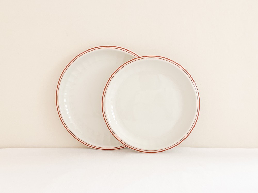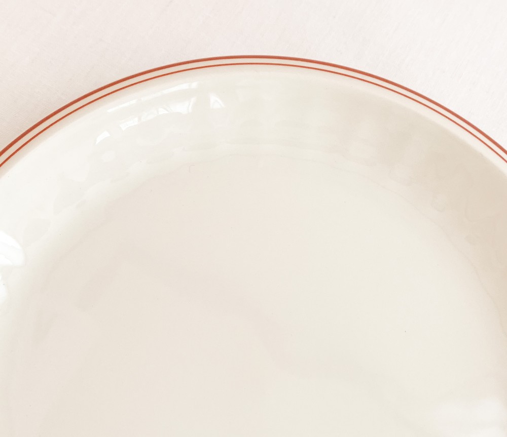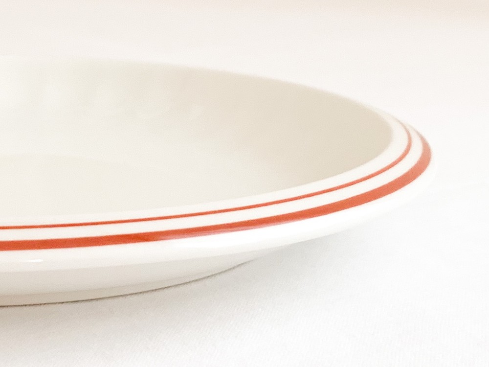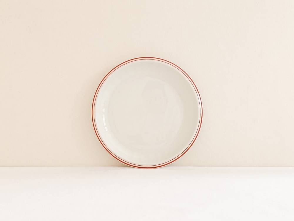 소개해드리는 제품은 하비타트가 문을 연 1964년, 웨지우드와의 협업으로 만들어진 접시입니다. 웨지우드에서 1800년대 후반 부터 1965까지만 제작했던 유니콘 스탬프의 세미포슬린을 소재로 만들어진 것으로, 하비타트의 창립자인 콘란이 직접적으로 하비타트에 관여했을 당시의 제품에 대한 소장가치와 더불어 높은 희소성을 가지고 있습니다. 크림색의 세미포슬린위에 깨끗한 하얀색의 유약이 얇게 입혀진- 평평하고 넓은 동그라미의 접시는 비교적 깊은 깊이를 가지고 있으며, 접시의 바닥면에서 가장자리로 이어지는 면에 은근한 물결문양이 가지런히 장식되어 있습니다. 차분한 빨강의 줄무늬가 그려진 좁은 폭의 가장자리는- 조심스런 실루엣을 그리며 아랫쪽을 향해 내려온 모습으로, 보기드문 세련된 미감을 전해줍니다. 테이블위의 물건을 정돈하는 트레이나 장식품과 양초같은 오브제를 진열하는 그릇으로, 식사시간을 위한 넉넉하고 편안한 접시로 사용하기에 잘 어울립니다.