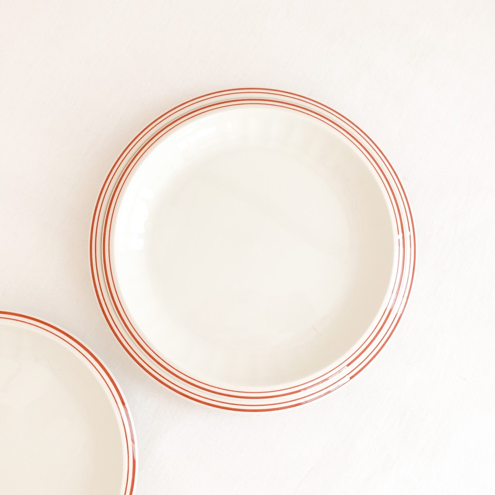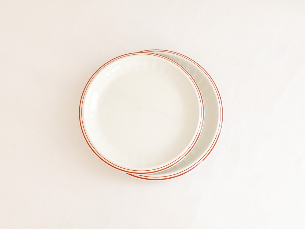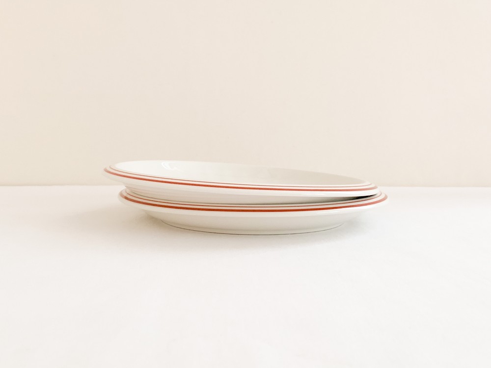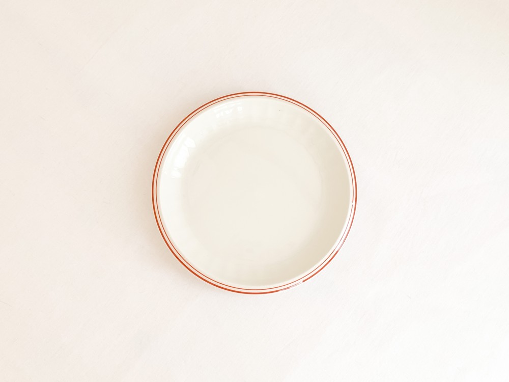 소개해드리는 제품은 하비타트가 문을 연 1964년, 웨지우드와의 협업으로 만들어진 접시입니다. 웨지우드에서 1800년대 후반 부터 1965까지만 제작했던 유니콘 스탬프의 세미포슬린을 소재로 만들어진 것으로, 하비타트의 창립자인 콘란이 직접적으로 하비타트에 관여했을 당시의 제품에 대한 소장가치와 더불어 높은 희소성을 가지고 있습니다. 크림색의 세미포슬린위에 깨끗한 하얀색의 유약이 얇게 입혀진- 평평하고 넓은 동그라미의 접시는 비교적 깊은 깊이를 가지고 있으며, 접시의 바닥면에서 가장자리로 이어지는 면에 은근한 물결문양이 가지런히 장식되어 있습니다. 차분한 빨강의 줄무늬가 그려진 좁은 폭의 가장자리는- 조심스런 실루엣을 그리며 아랫쪽을 향해 내려온 모습으로, 보기드문 세련된 미감을 전해줍니다. 테이블위의 물건을 정돈하는 트레이나 장식품과 양초같은 오브제를 진열하는 그릇으로, 식사시간을 위한 넉넉하고 편안한 접시로 사용하기에 잘 어울립니다.
