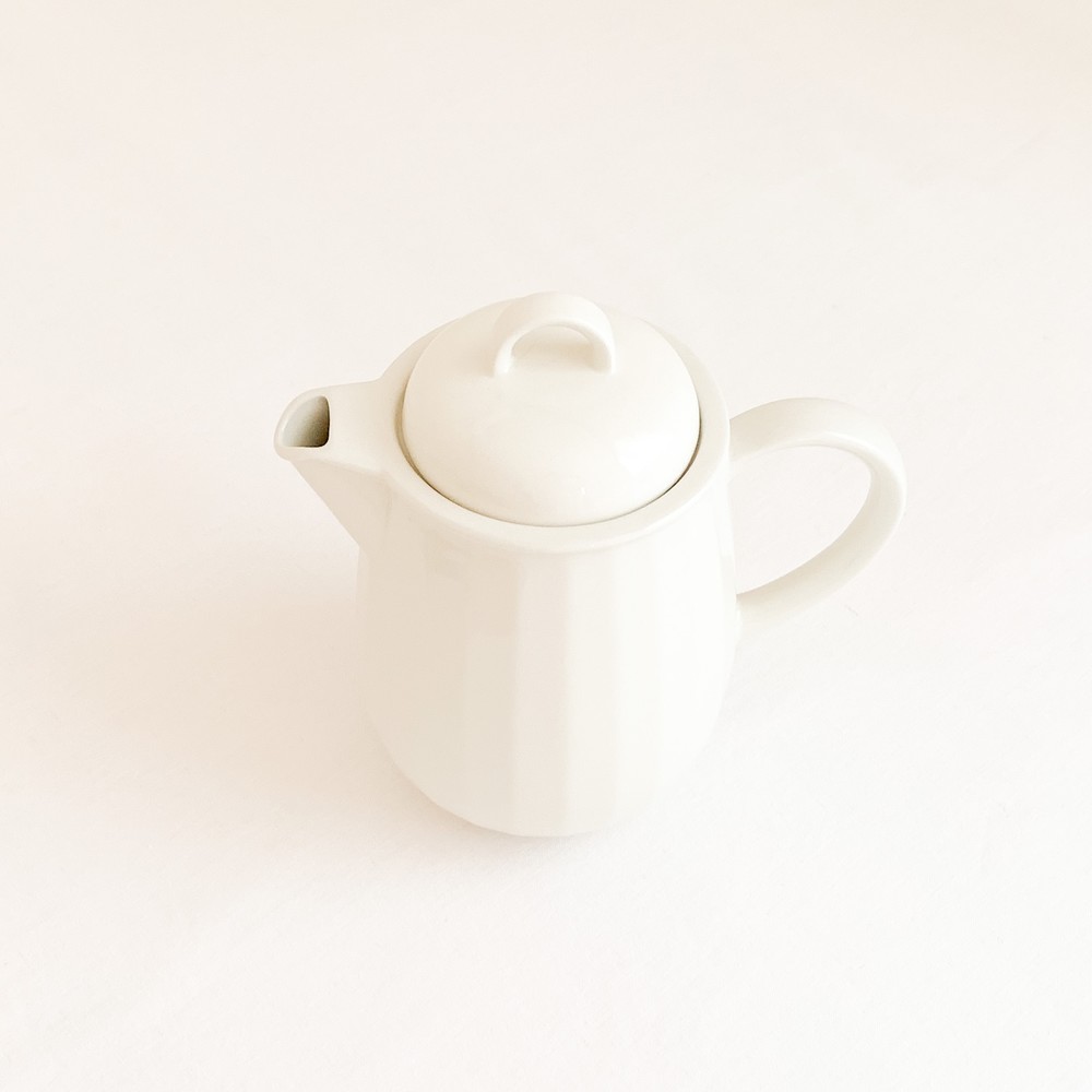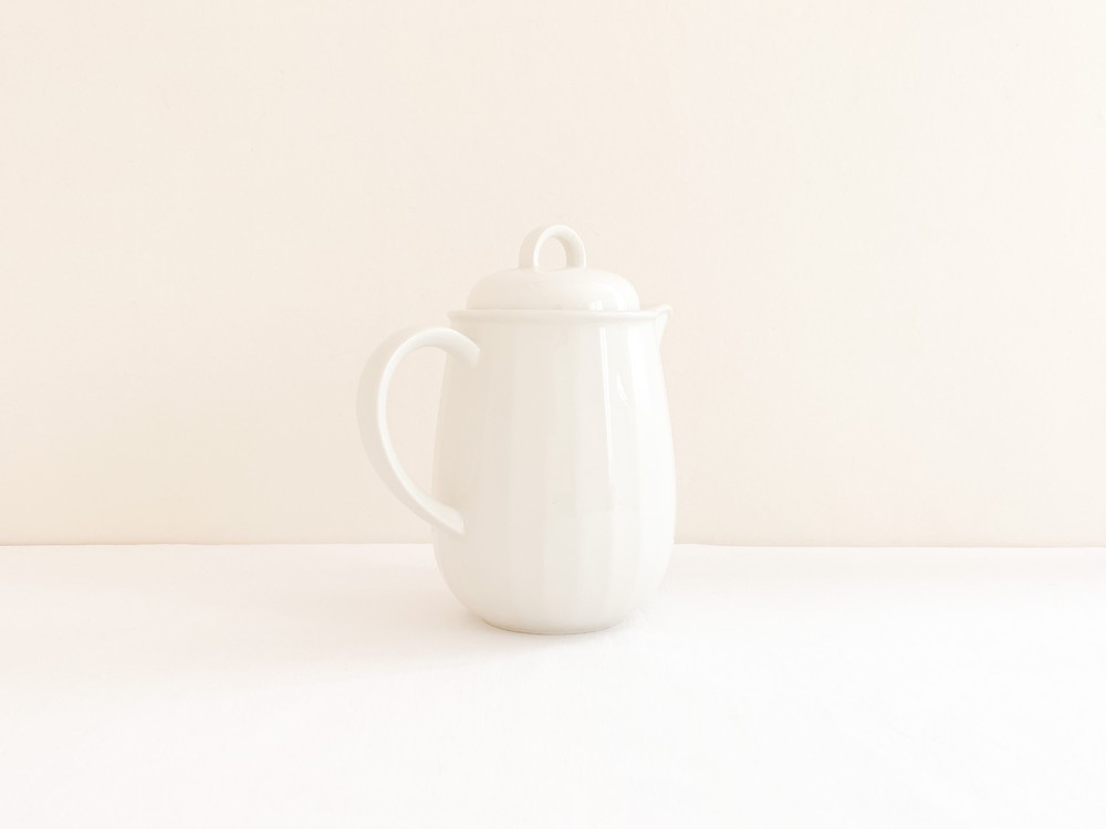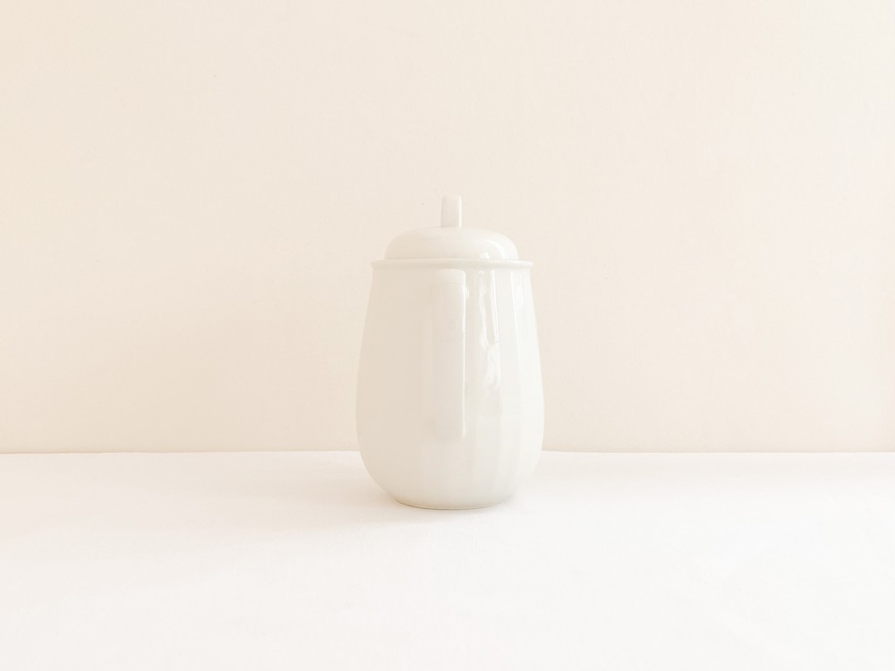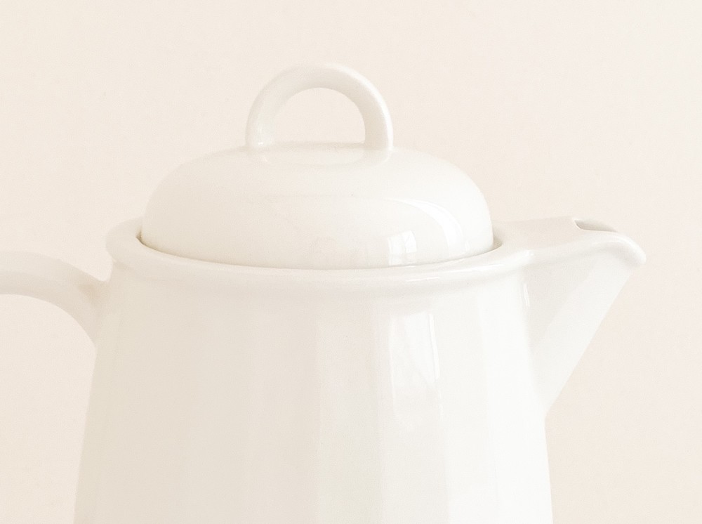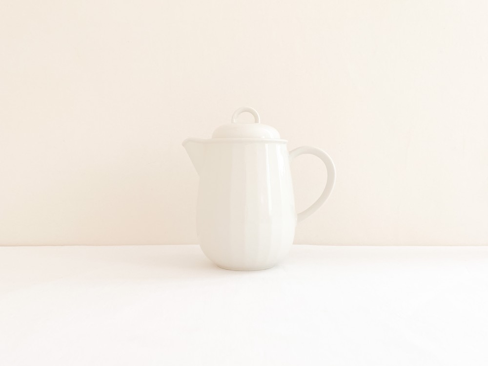 소개해드리는 제품은 하비타트가 문을 연 직후인 1965년, 웨지우드와의 협업으로 만들어진 티팟입니다. 웨지우드에서 1800년대 후반 부터 1965까지만 제작했던 세미포슬린을 소재로 만들어진 것으로- 하비타트의 창립자인 콘란이 직접적으로 하비타트에 관여했을 당시의 제품에 대한 소장가치와 더불어 높은 희소성을 가지고 있으며, 비교적 최근까지 생산된 하비타트의 테이블웨어의 모티브가 되는 오리지널 제품이기도 합니다. 크림색의 세미포슬린위에 깨끗한 하얀색의 유약이 얇게 입혀진 티팟은 풍성하고 단정한 곡선들로 모양을 이루고 있습니다. 겉면에 가지런한 리본무늬가 장식되어 넉넉하지만 둔하지 않은 모습의 둥근보울, 간결한 아치모양의 손잡이와 뚜껑, 짧은 스파우트 등 티팟을 이루는 부분들에서 완벽한 균형이 보여집니다. 식탁위의 넉넉한 찻주전자로, 초록의 잎사귀나 화려한 색의 꽃들을 가득히 담아두는 화병으로 사용하기에 잘 어울립니다.