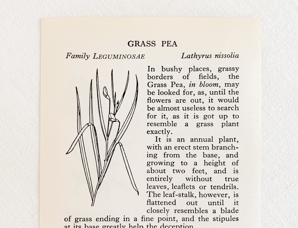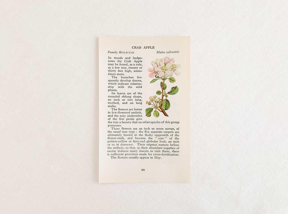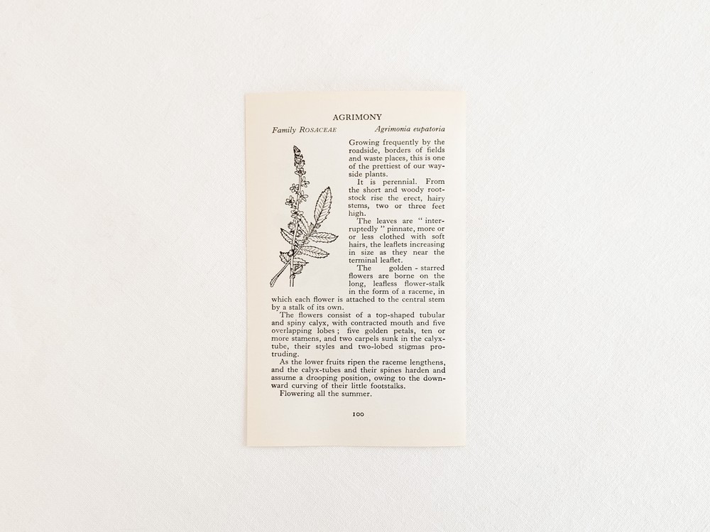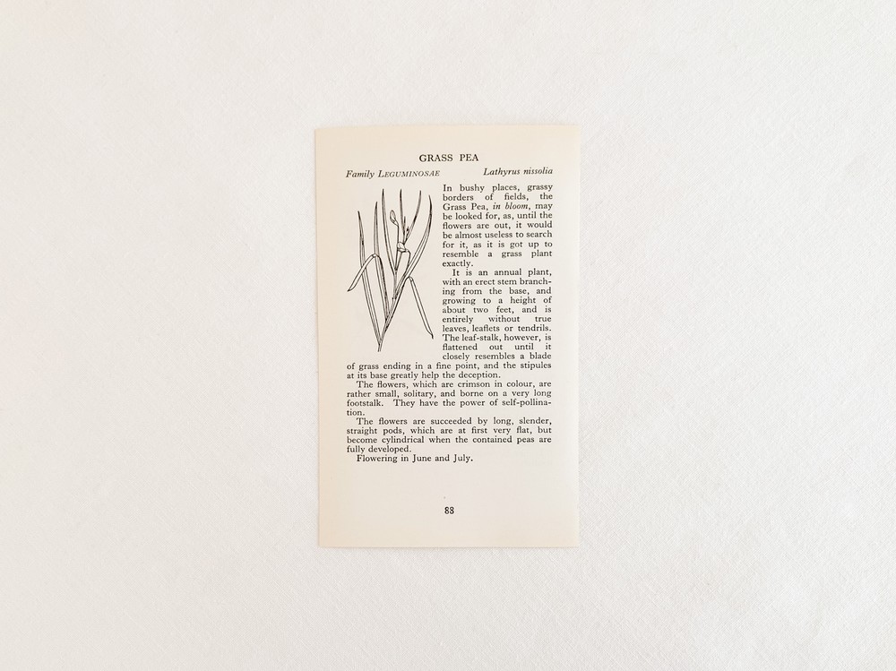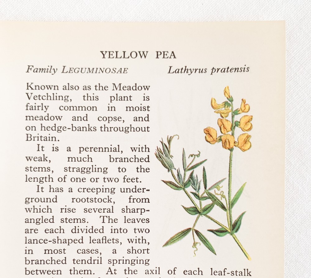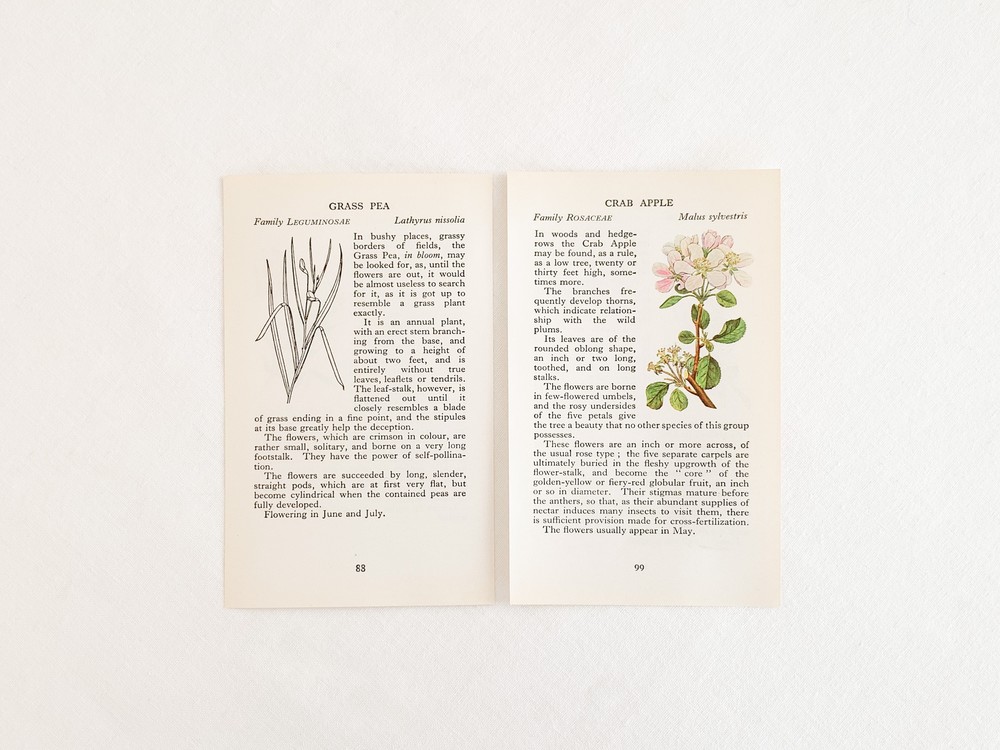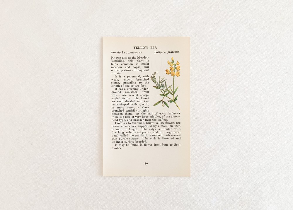 1937년에 영국에서 출간된, 산책자들을 위한 작은 식물도감을 출처로하는 빈티지 프린트입니다. 영국의 히스나 공원을 산책하며 가까이에서 볼 수 있는 식물들을 정리한 책은, 작고 세밀한 일러스트와 함께 식물의 학명이나 과, 잎이나 꽃 등의 생김새, 자라는 환경, 꽃을 피우고 열매를 맺는 계절같은 식물에 관한 어렵지않은 정보를 담아내고 있습니다. 소개해드리는 프린트는 첫 출간이후 다섯 번째로 발행된 1969년에 프린트된 것으로, 콩꽃의 종류와 장미과의 사과꽃- 아그리모이아에 관한 관한 내용을 담고있습니다. 전달하는 내용에따라 조금씩 다른 모양과 크기를 가지고 있는 글자의 배열, 간결하지만 세심한 일러스트를 관찰하는 즐거움을 전해주기도하고- 페이지 안에 묘사된 꽃이 피어있는 장면, 어떤 아름다운 계절을 상상해보며, 느긋한 산책자의 평화로운 기분을 떠올려보기도 합니다. 자연의 흐름을 설명하는- 간결하고 시적인 문장들은, 마음속의 부드러운 감정들을 일깨워줍니다. 사진에서 보여지는 가장자리의 미세한 변색이외에 새것에 가까운 깨끗한 상태를 가지고있습니다. 취향과 공간의 분위기에 따라 한 면을 선택하여 장식할 수 있습니다.