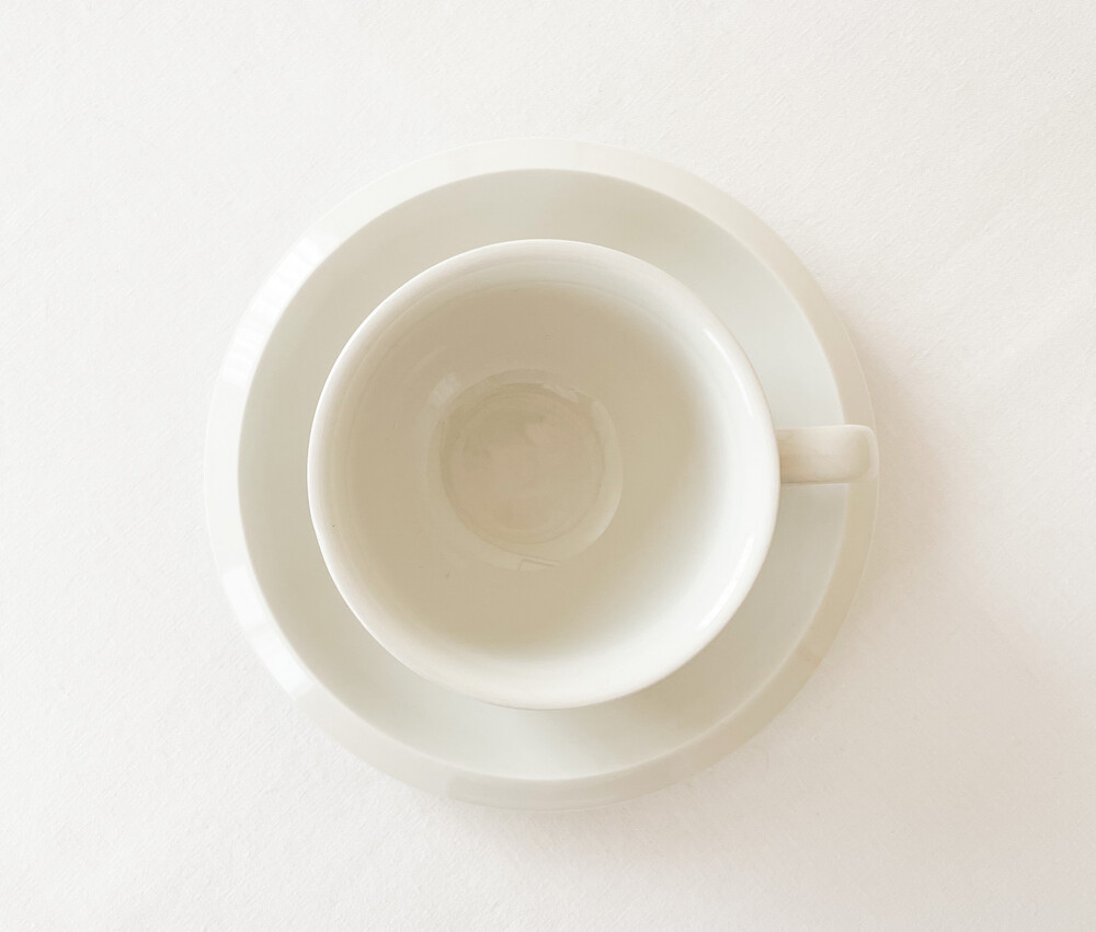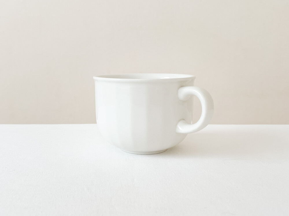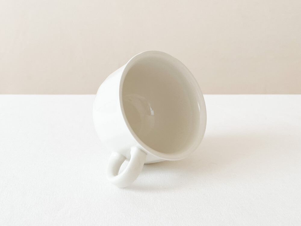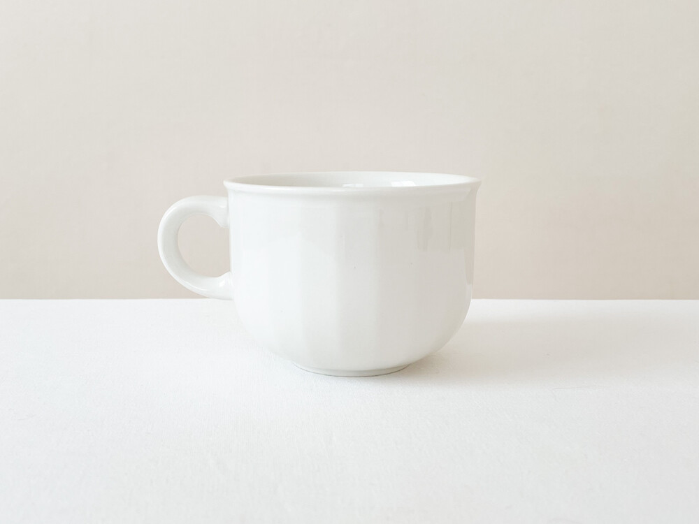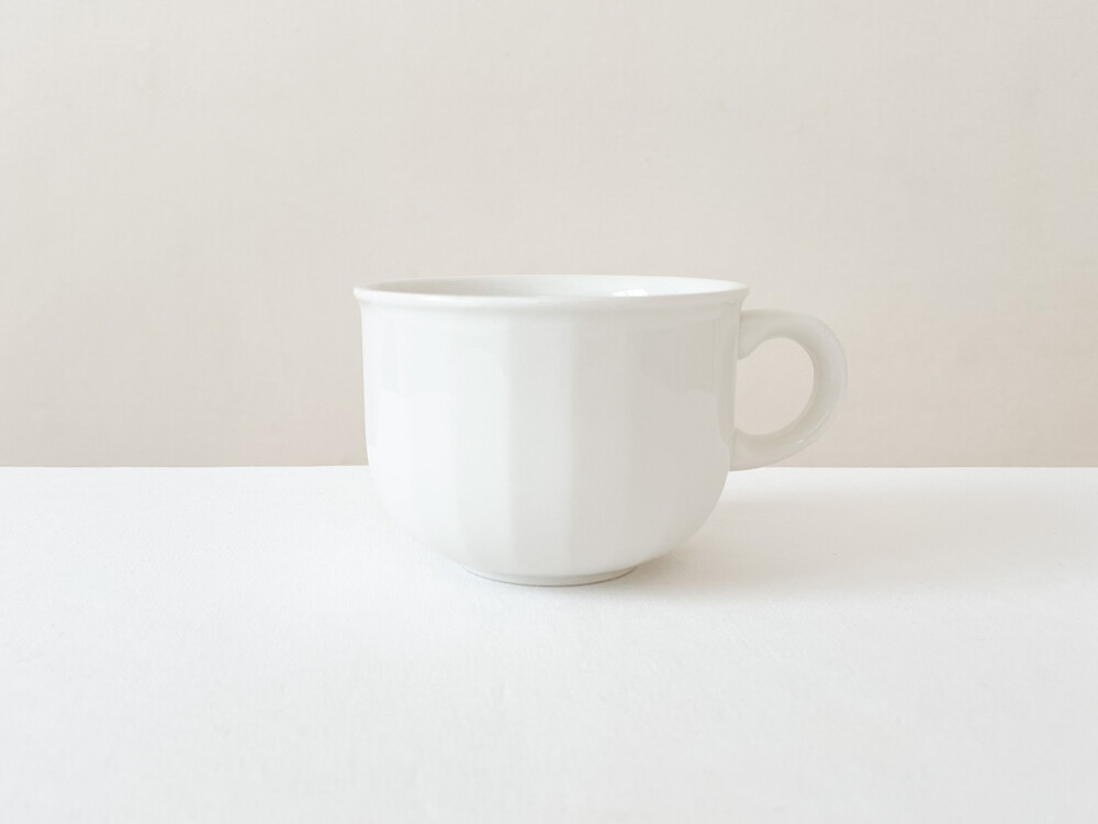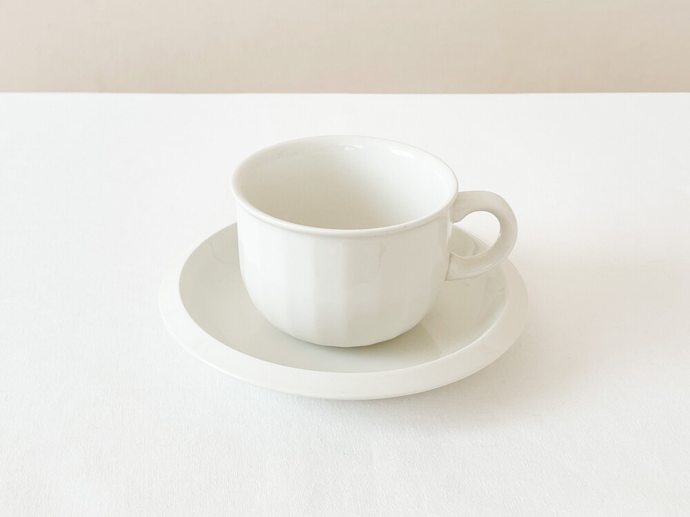 소개해드리는 제품은 하비타트의 초창기인 1970년대 초반의것으로, 1965년 웨지우드와의 협업으로 만들어진 첫 번째 제품의 뒤를 이어, 전체의 역사에서는 두 번째- 하비타트만의 이름으로는 첫 번째에 자리한 찻잔세트입니다. 하비타트의 창립자인 콘란이 직접적으로 하비타트에 관여했을 당시의 제품에 대한 소장가치와 더불어 높은 희소성을 가지고 있으며, 비교적 최근까지 생산된 하비타트의 테이블웨어의 모티브가 되는 제품이기도 합니다. 크림색의 세미포슬린위에 깨끗한 하얀색의 유약이 얇게 입혀진 찻잔세트는 풍성하고 단정한 곡선들로 모양을 이루고 있습니다. 겉면에 가지런한 리본무늬가 장식된 넉넉한 깊이의 둥근 찻잔, 조심스런 실루엣을 그리며 아랫쪽을 향해있는 가장자리의 잔받침으로 구성 된 제품입니다. 여유로운 크기와 안정감 있는 비율, 섬세하게 다듬어져 단조롭지만 세련되고 우아한 미감을 가지고 있는 부분들을 살펴볼 수 있습니다. 카페오레나 밀크티를 마시는 넉넉한 찻잔으로, 시리얼이나 수프를 담아내는 그릇으로 사용하기에 잘 어울립니다.