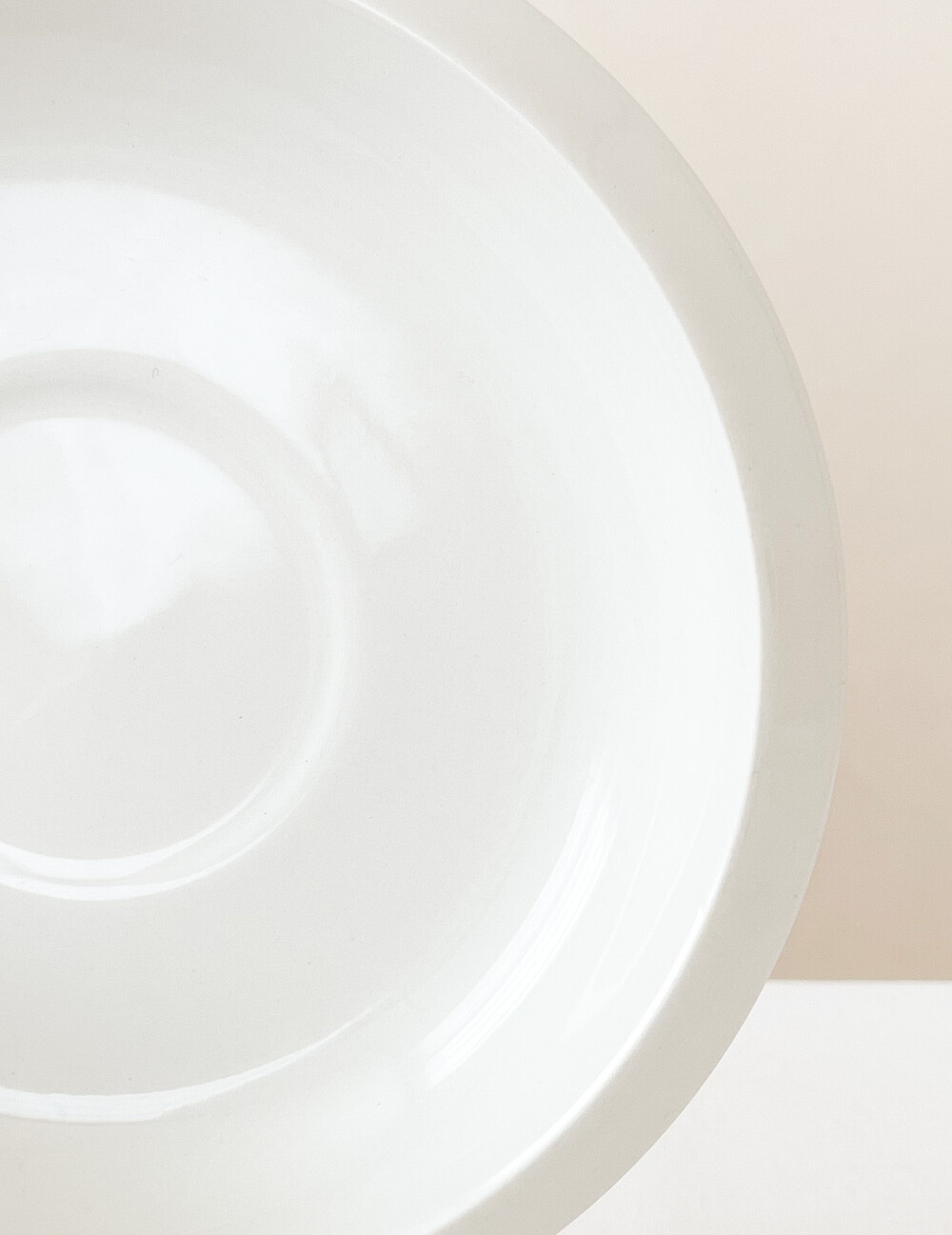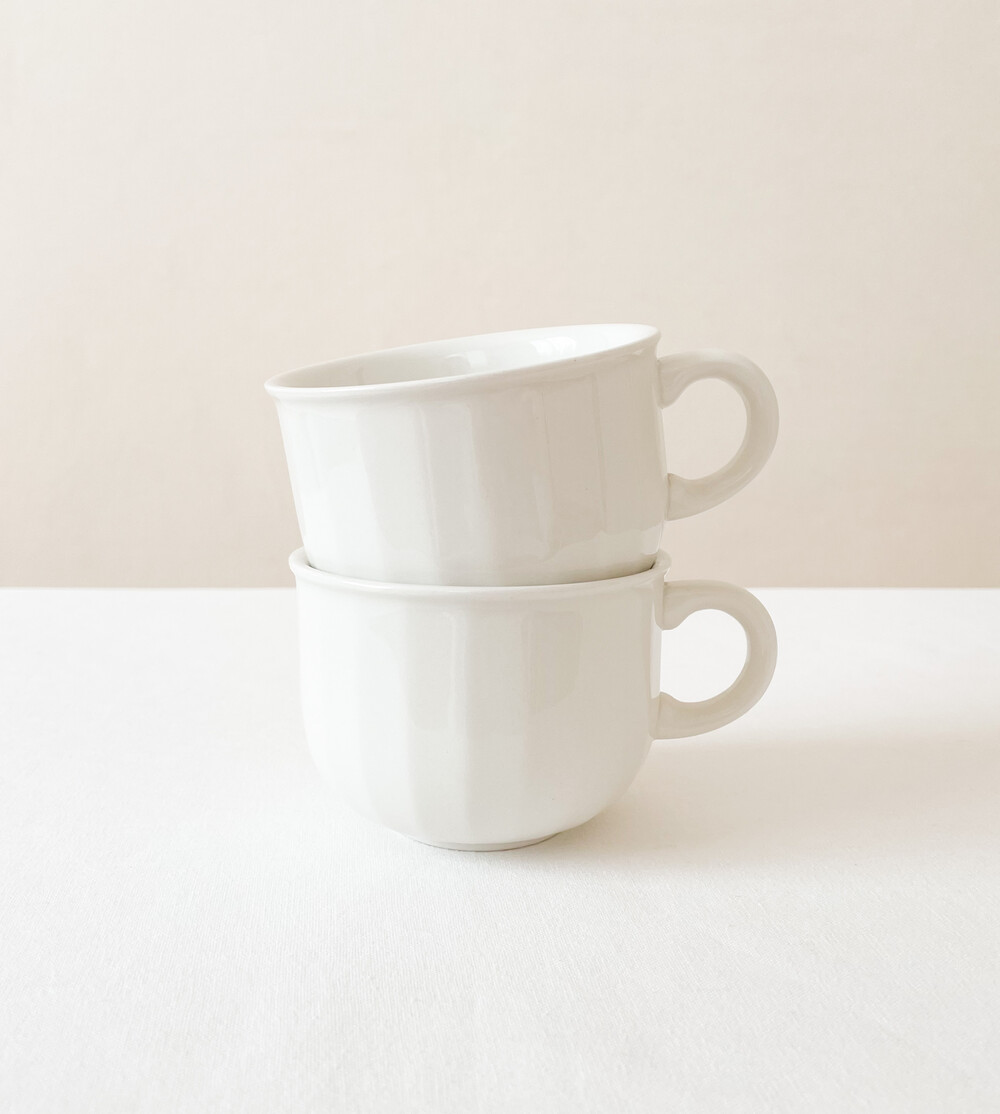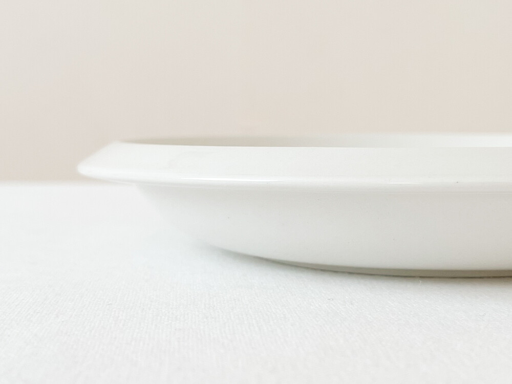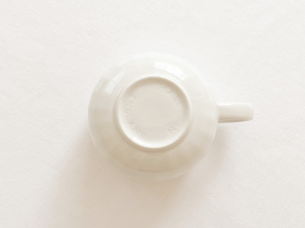 소개해드리는 제품은 하비타트의 초창기인 1970년대 초반의것으로, 1965년 웨지우드와의 협업으로 만들어진 첫 번째 제품의 뒤를 이어, 전체의 역사에서는 두 번째- 하비타트만의 이름으로는 첫 번째에 자리한 찻잔세트입니다. 하비타트의 창립자인 콘란이 직접적으로 하비타트에 관여했을 당시의 제품에 대한 소장가치와 더불어 높은 희소성을 가지고 있으며, 비교적 최근까지 생산된 하비타트의 테이블웨어의 모티브가 되는 제품이기도 합니다. 크림색의 세미포슬린위에 깨끗한 하얀색의 유약이 얇게 입혀진 찻잔세트는 풍성하고 단정한 곡선들로 모양을 이루고 있습니다. 겉면에 가지런한 리본무늬가 장식된 넉넉한 깊이의 둥근 찻잔, 조심스런 실루엣을 그리며 아랫쪽을 향해있는 가장자리의 잔받침으로 구성 된 제품입니다. 여유로운 크기와 안정감 있는 비율, 섬세하게 다듬어져 단조롭지만 세련되고 우아한 미감을 가지고 있는 부분들을 살펴볼 수 있습니다. 카페오레나 밀크티를 마시는 넉넉한 찻잔으로, 시리얼이나 수프를 담아내는 그릇으로 사용하기에 잘 어울립니다.