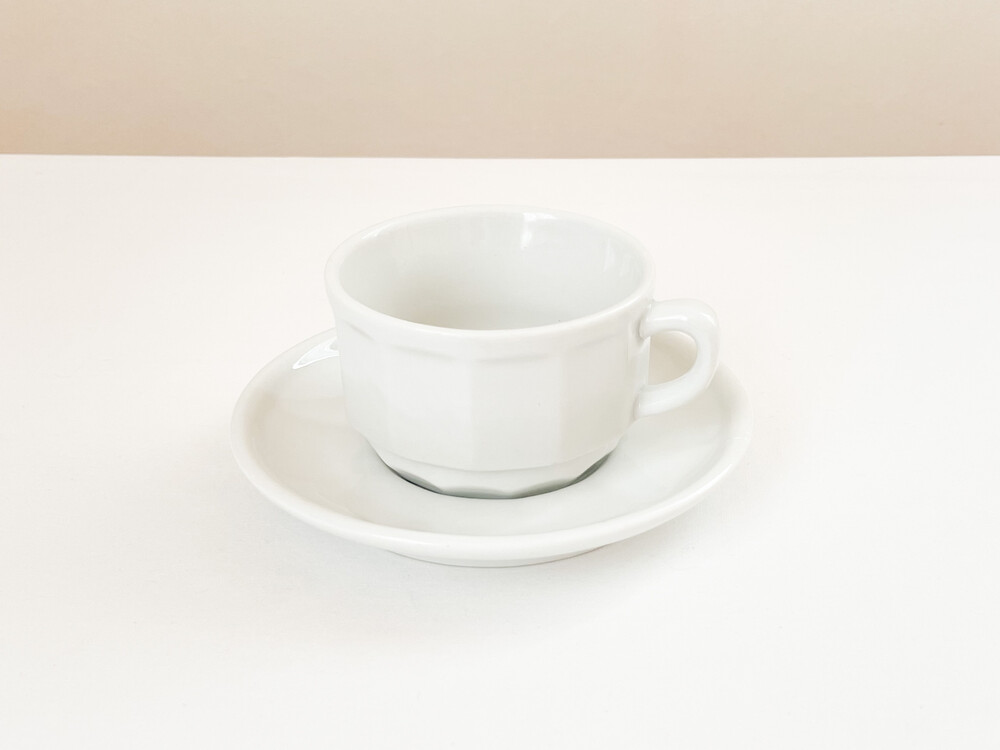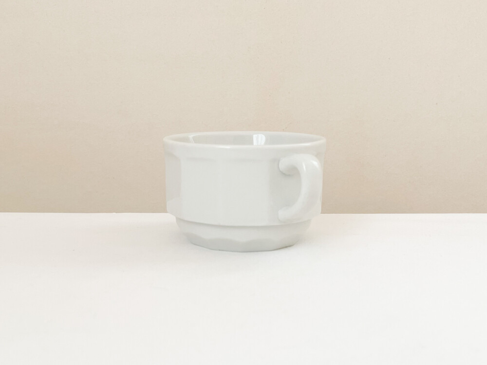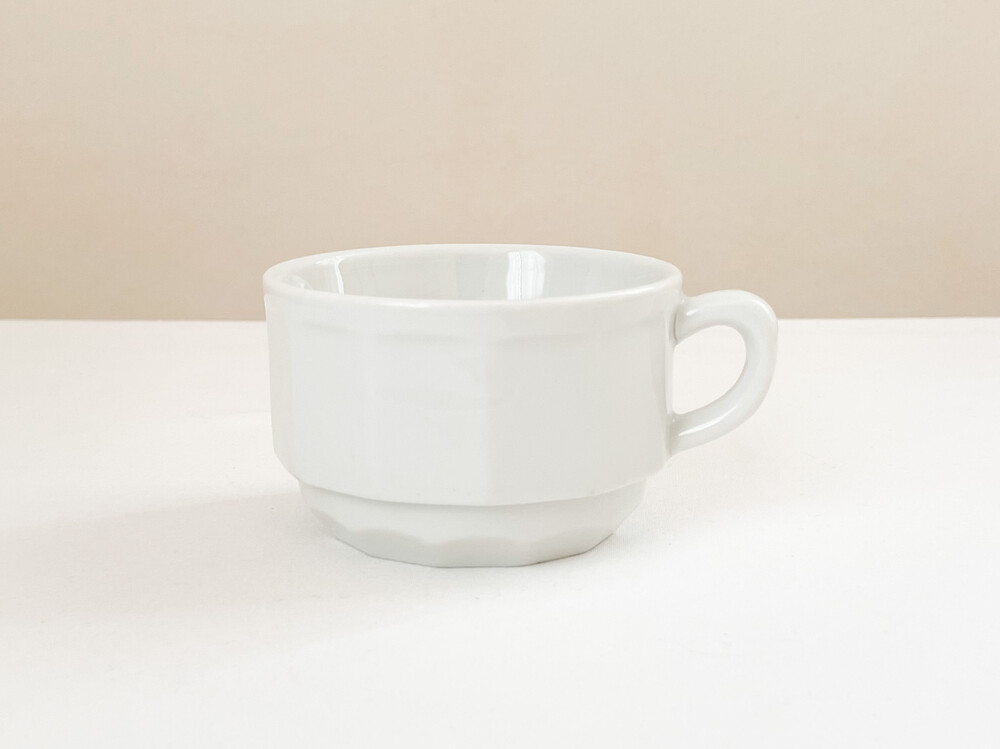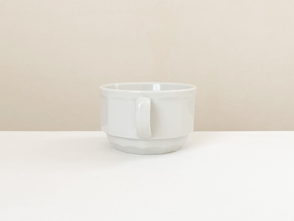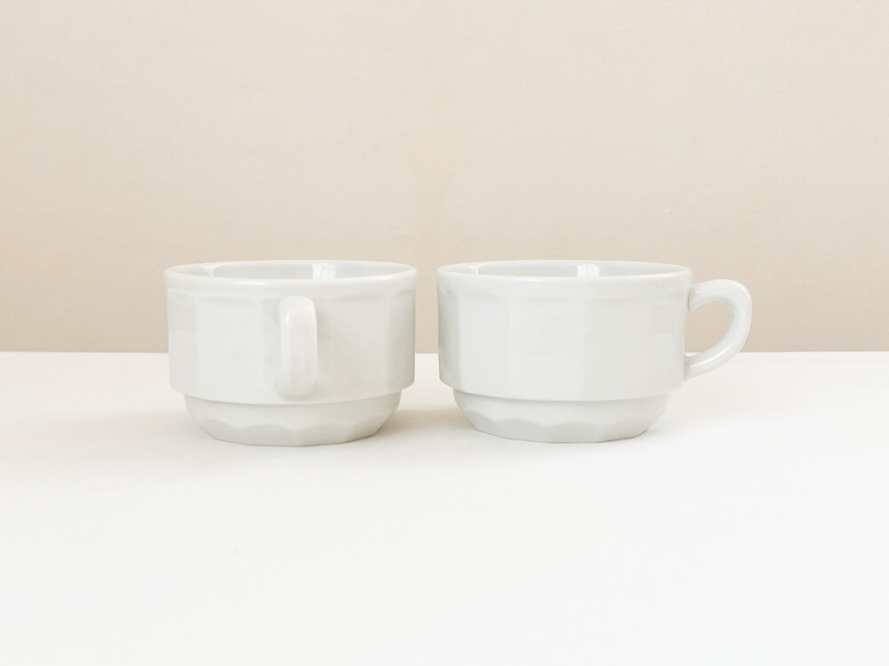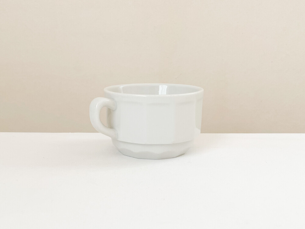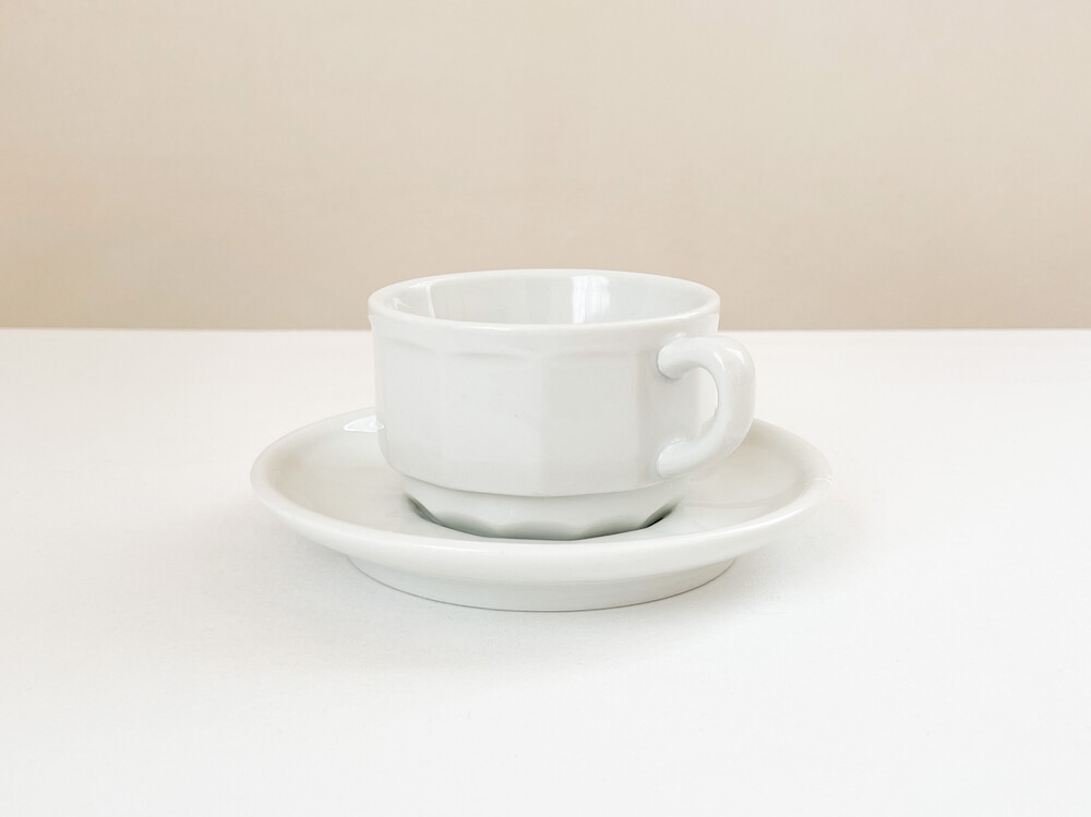 1970년대에 제작된 아필코의 빈티지 찻잔입니다. 아필코는 프랑스서부의 쇼비니지역에서 1826년부터 포슬린 테이블웨어를 만들기 시작한 브랜드입니다. 프랑스에서 많이 생산되는 포슬린의 원료인 질 좋은 카올린과 흰색의장석, 석회분과 촘촘한 진흙으로 만들어진 부드러운 포슬린페이스트를 주재료로 사용합니다. 화학물질을 사용하지 않으면서 내구성과 지속성을 유지하는 방법의 고안과 아필코만의 분위기를 담아낼 수 있는 명료한 화려함을 보여 줄 수 있는 테이블웨어를 추구해오고 있습니다. 아필코의 포슬린은 크랙과 칩등 흠집에 강한 특징을 가지고있어, 레스토랑이나 카페에서의 티웨어로 사용되는것을 심심치않게 볼 수 있습니다. 소개해드리는 찻잔세트는 리본이 나란히 둘러진듯한- 가지런한 다각형으로 전체의 모습이 완성되었으며, 아필코 특유의 투명함이 깃들어있는 차가운 하얀색의 포슬린을 소재로합니다. 스태킹스탠드(잔을 켜켜히 겹쳐쌓을 수 있는 굽모양)의 바닥면은 도톰한 꽃잎이나 간결한 레이스를 떠올리는 장식으로 마무리되어 단정함과 화사함의 아름다운 균형을 보여줍니다. 여름의 베리들과 셔볏을 담아내는 디저트 컵으로, 아침식사시간의 짙은 커피를 위한 잔으로 사용하기에 잘 어울립니다.