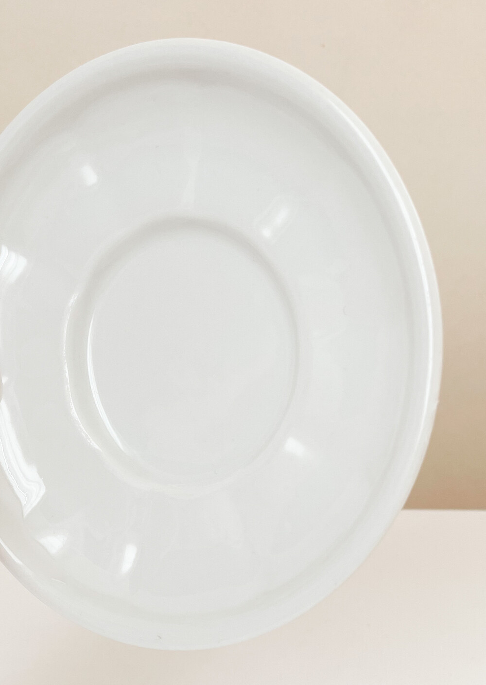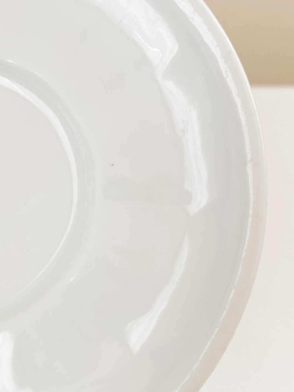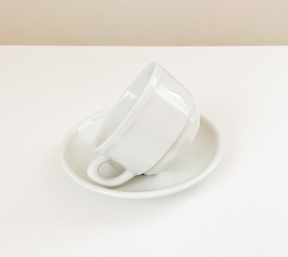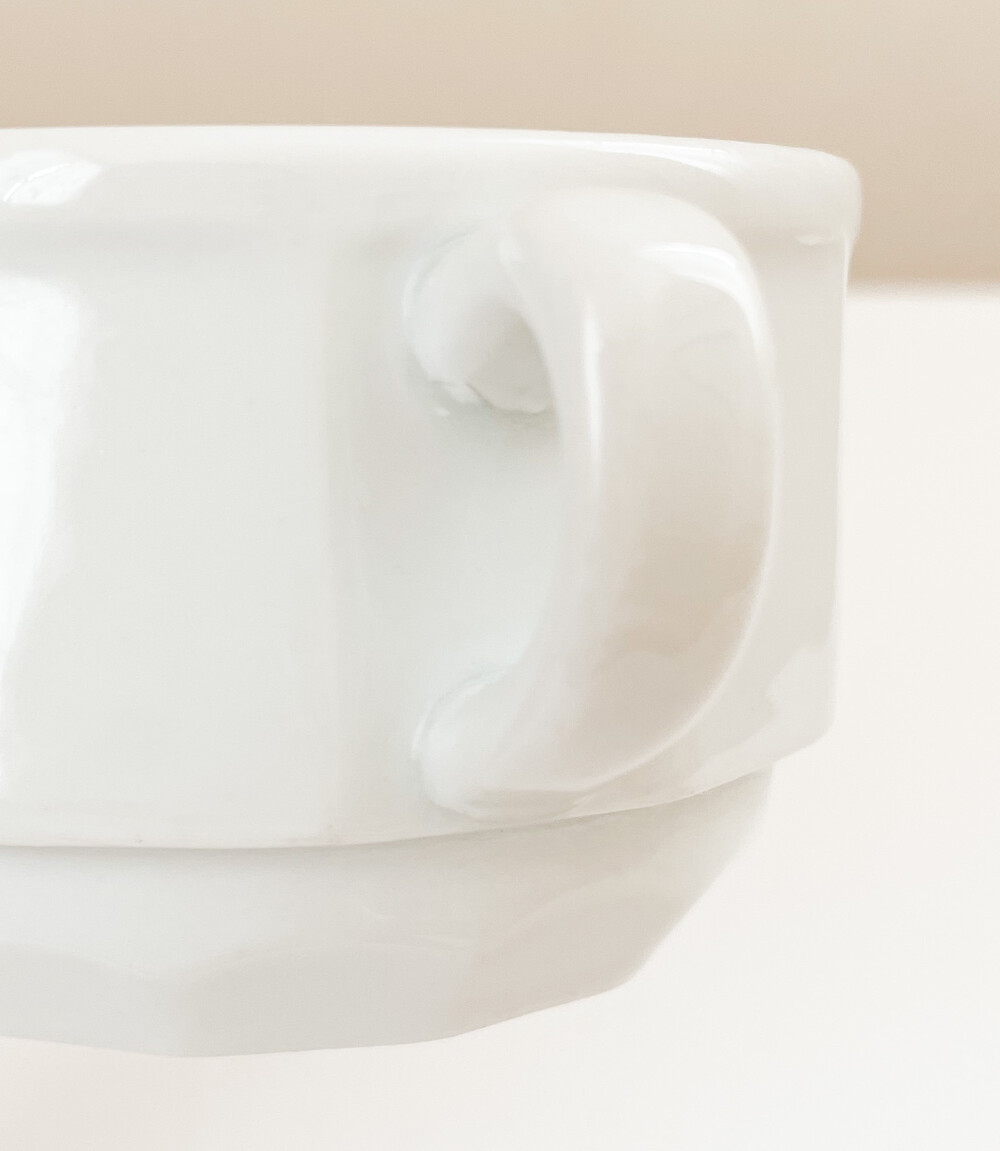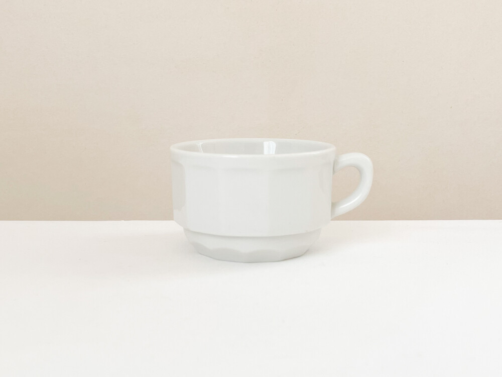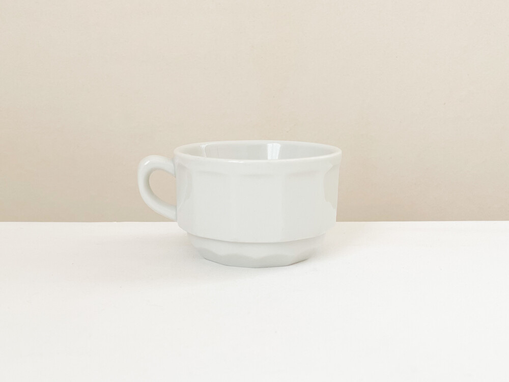 1970년대에 제작된 아필코의 빈티지 찻잔입니다. 아필코는 프랑스서부의 쇼비니지역에서 1826년부터 포슬린 테이블웨어를 만들기 시작한 브랜드입니다. 프랑스에서 많이 생산되는 포슬린의 원료인 질 좋은 카올린과 흰색의장석, 석회분과 촘촘한 진흙으로 만들어진 부드러운 포슬린페이스트를 주재료로 사용합니다. 화학물질을 사용하지 않으면서 내구성과 지속성을 유지하는 방법의 고안과 아필코만의 분위기를 담아낼 수 있는 명료한 화려함을 보여 줄 수 있는 테이블웨어를 추구해오고 있습니다. 아필코의 포슬린은 크랙과 칩등 흠집에 강한 특징을 가지고있어, 레스토랑이나 카페에서의 티웨어로 사용되는것을 심심치않게 볼 수 있습니다. 소개해드리는 찻잔세트는 리본이 나란히 둘러진듯한- 가지런한 다각형으로 전체의 모습이 완성되었으며, 아필코 특유의 투명함이 깃들어있는 차가운 하얀색의 포슬린을 소재로합니다. 스태킹스탠드(잔을 켜켜히 겹쳐쌓을 수 있는 굽모양)의 바닥면은 도톰한 꽃잎이나 간결한 레이스를 떠올리는 장식으로 마무리되어 단정함과 화사함의 아름다운 균형을 보여줍니다. 여름의 베리들과 셔볏을 담아내는 디저트 컵으로, 아침식사시간의 짙은 커피를 위한 잔으로 사용하기에 잘 어울립니다.