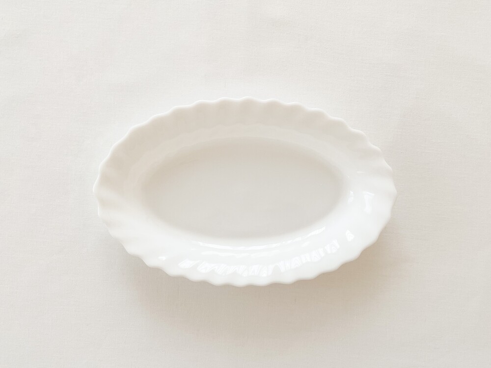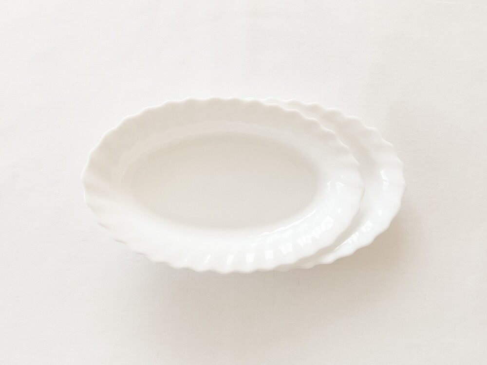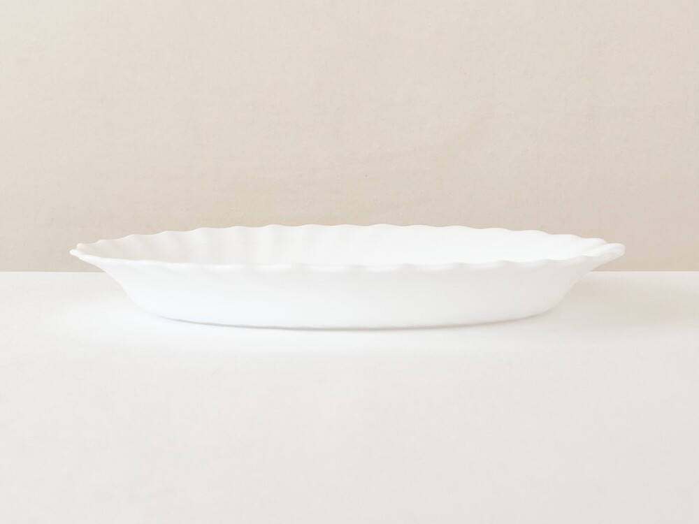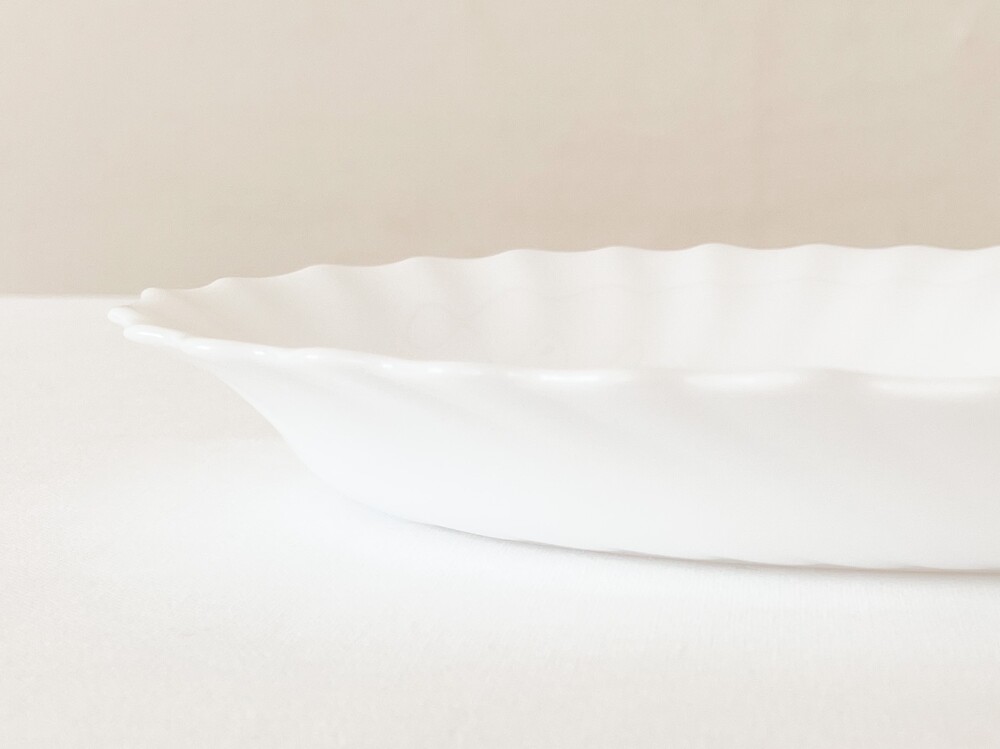 아코팔은 1825년 프랑스 북부의 아르크지방에서 시작된 브랜드입니다. 각 공정의 마스터들이 모여 샴페인잔이나 와인잔같은 스템웨어를 만들며 명성을 쌓아간 아코팔은 아르크 인터네셔널로 브랜드를 확장하며 현재까지도 인기가 있는 워킹글라스를 비롯한 루미낙, 알코록등 적당한 꾸밈을 가진 실용적인 글라스웨어들 제작하였습니다. 소개해드리는 제품은 아코팔에서 처음 만들어진 디자인이며, 1970년대 아르크 인터네셔널의 브랜드 중 하나인 루미낙의 이름으로 제작 된 오발디쉬 입니다. 뽀얀 우윳빛의 강화유리를 소재로, 접시와 보울의 중간정도되는 높이를 가지고있어, 여러가지 용도로 편하게 사용하기에 적당합니다. 접시의 가장자리에 장식된- 구름이 흘러가는 모양을 떠올리는 레이스무늬는, 깨끗하고 밝은 소재의 분위기와 잘 어울리는 모습입니다. 아이스크림을 둥글게 올린 따뜻한 파이나, 샌드위치를 나란히 담아내거나- 부엌의 물건을 정돈하는 트레이로 사용하기에 알맞습니다.